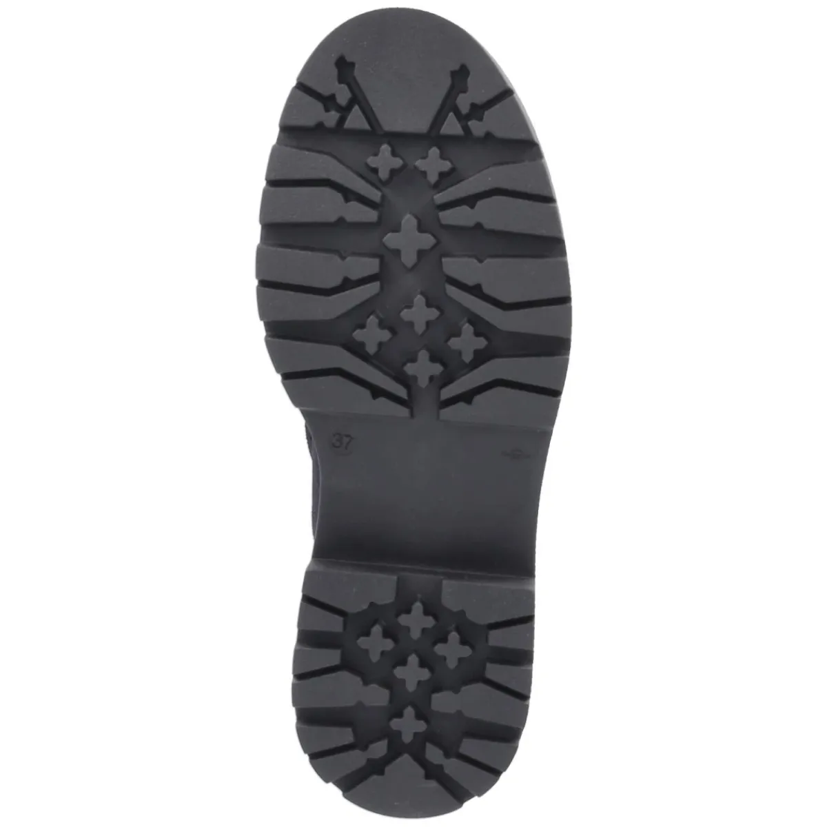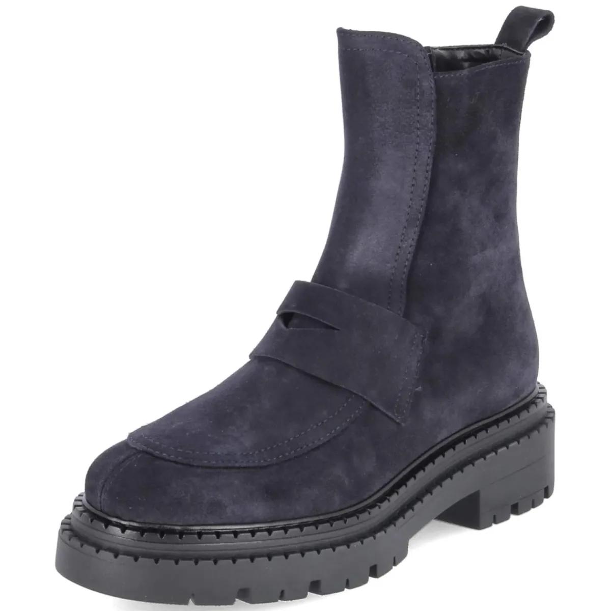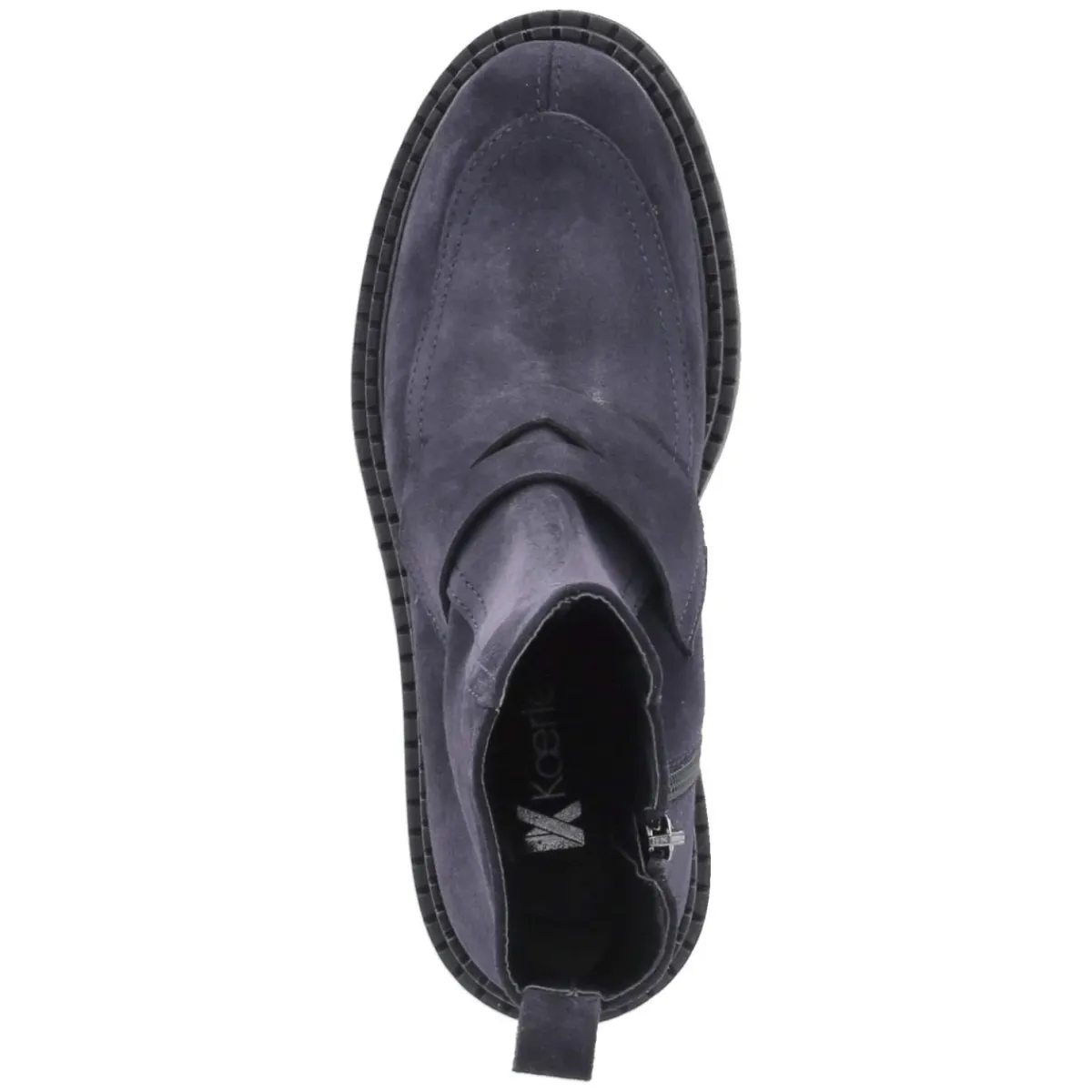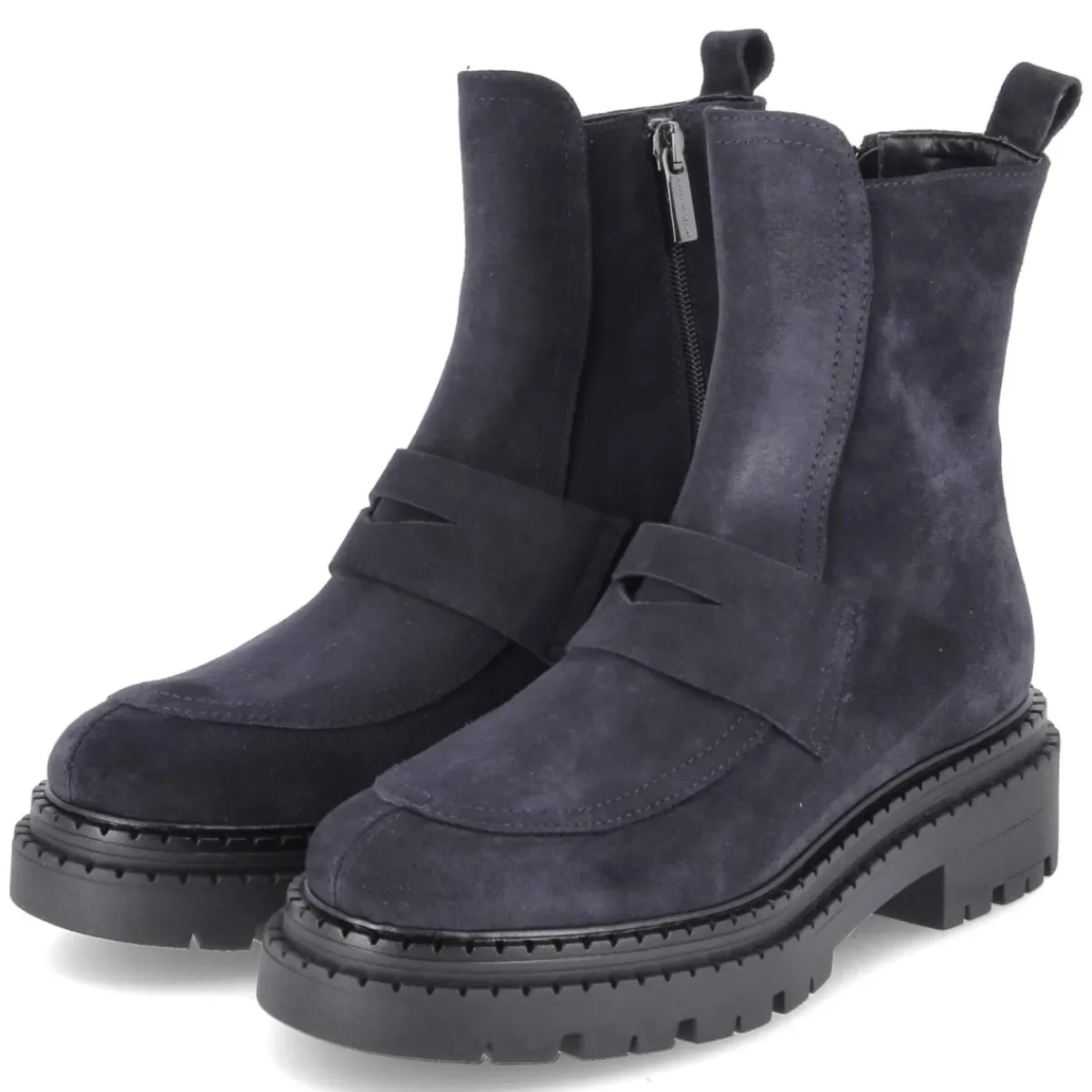 Die Kaerlek Stiefeletten in elegantem Dunkelblau vereinen zeitloses Design und komfortable Ausstattung. Das Obermaterial aus hochwertigem Rauleder und das langlebige Echtleder sorgen für eine edle Haptik, während die runde Spitze und der 4,5 cm hohe Blockabsatz ein feminines, alltagstaugliches Profil formen. Ein Reißverschluss und die praktische Anziehlasche ermöglichen einen unkomplizierten Einstieg, das leicht gepolsterte Fußbett bietet angenehme Dämpfung auch an längeren Tagen. Für sicheren Tritt steht die rutschhemmende Laufsohle, die auf glatteren Böden verlässliche Stabilität gibt. Die Ledersohle an der Innenseite unterstützt ein ausgeglichenes Fußklima. Ein Zierriemen über dem Spann setzt einen dezenten Akzent und unterstreicht den modernen Charakter. Größenhinweis: fällt normal aus. Modetipp: Dunkelblaue Stiefeletten harmonieren besonders schön mit cremefarbenem Strick und dunkelblauen Straight-Jeans, dazu ein kamelfarbener Mantel für einen weichen Kontrast.