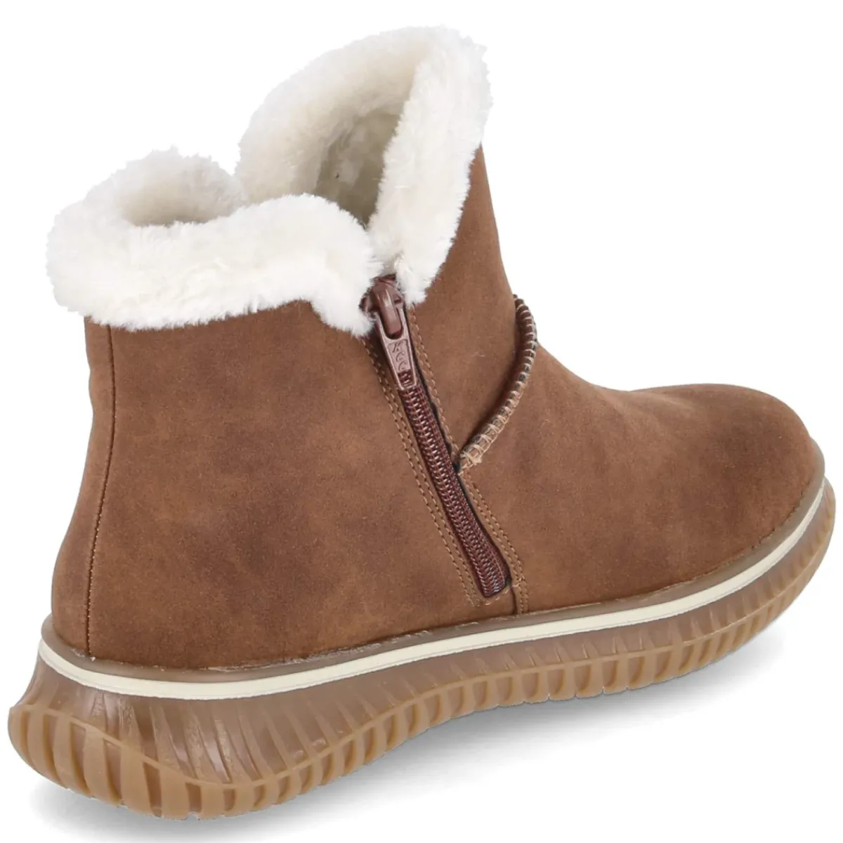 Diese Rieker Stiefeletten in warmem Braun verbinden wetterfeste Funktion und behaglichen Komfort im urbanen Look. Das wasserfeste, zugleich atmungsaktive Obermaterial aus pflegeleichtem Kunstleder erhält durch die matte Oberfläche einen natürlichen Look, während die runde Schuhspitze zeitlose Lässigkeit unterstreicht. Weiches Warmfutter schützt an kalten Tagen, die gepolsterte Textildecksohle und das Wechselfußbett sorgen für individuelles Tragegefühl und leichte Pflege. Der seitliche Reißverschluss ermöglicht schnelles An- und Ausziehen, die Passform fällt normal aus. So wird aus einem Alltagsbegleiter ein verlässliches Paar für viele Anlässe. Modetipp: Zu Strickkleid in Creme und langem Wollmantel entsteht ein harmonischer Ton-in-Ton-Auftritt; mit Raw-Denim und dicker Rippstrumpfhose wirkt der Look mühelos modern.
