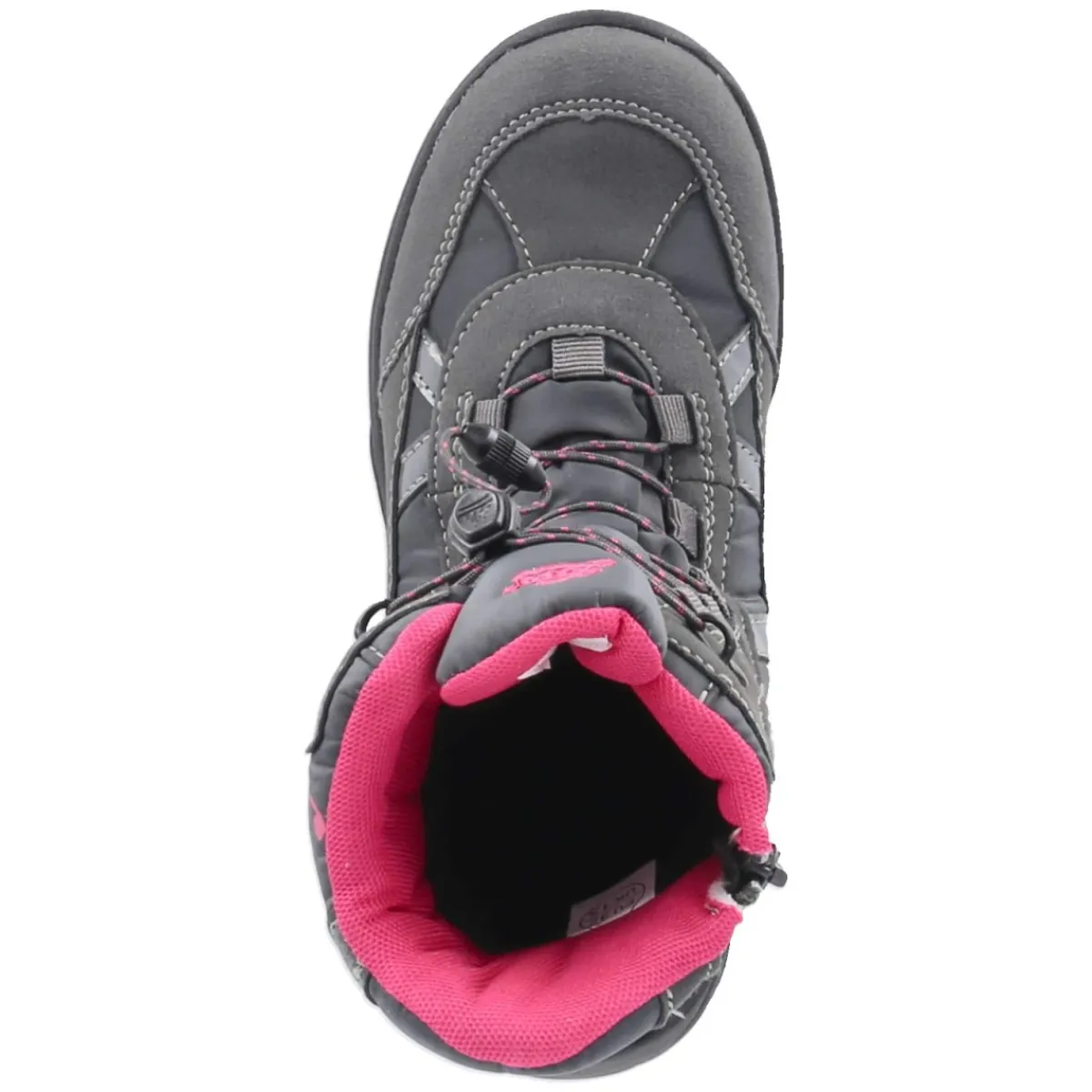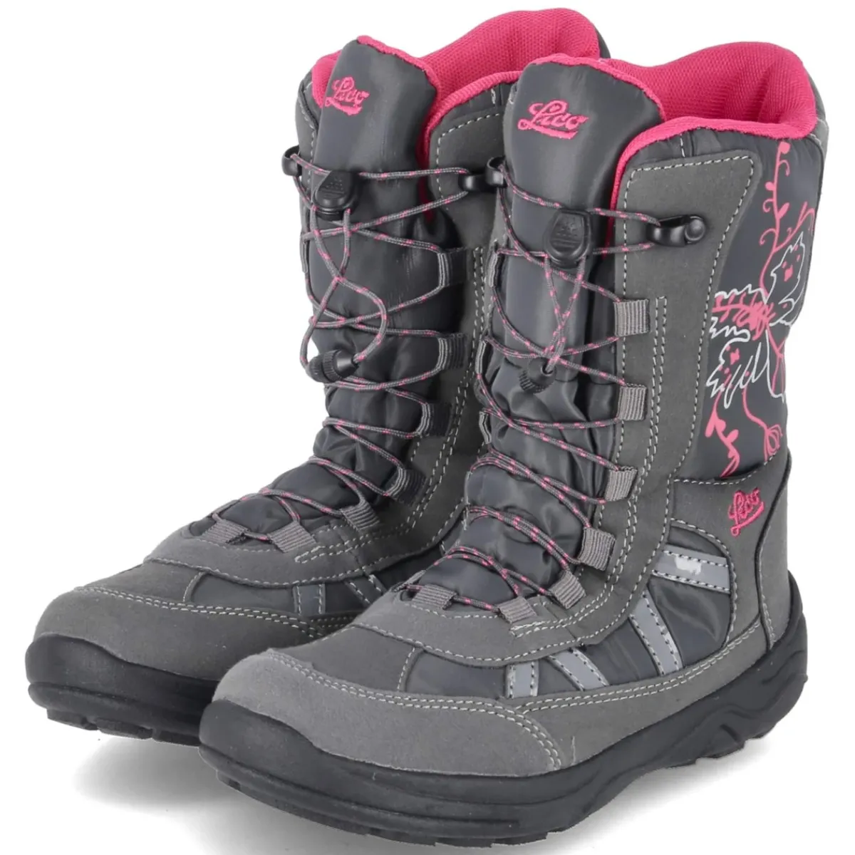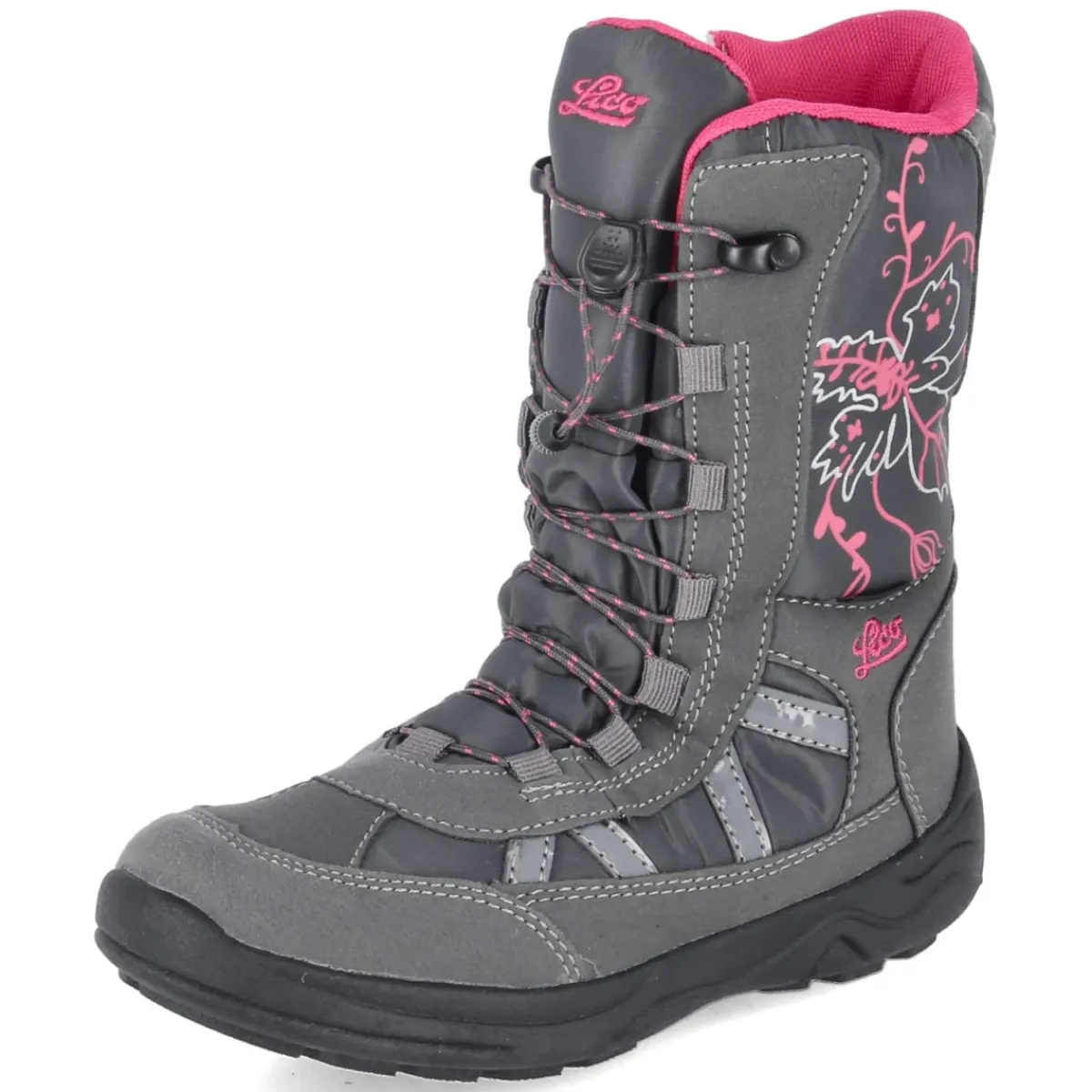 Der Winterboot ALDINA von Lico verbindet kindgerechten Komfort mit robuster Funktion. Das graue Modell aus Textil und Synthetik setzt mit abstraktem Blumenprint und dezenten Markendetails verspielte Akzente. Der wasserfeste Material-Mix und wasserabweisende Eigenschaften halten Nässe zuverlässig fern, während das warme Futter an kalten Tagen angenehm schützt. Schnürsenkel sorgen für variablen Halt, der seitliche Reißverschluss ermöglicht einen bequemen Einstieg. Die runde Schuhspitze, ein gut gepolstertes Fußbett mit Textildecksohle und der gepolsterte Einstieg erhöhen den Tragekomfort, das Wechselfußbett bietet praktische Hygienevorteile. Eine rutschfeste Profilsohle gibt Sicherheit auf winterlichen Wegen, verstärkte Fersen- und Zehenbereiche erhöhen die Strapazierfähigkeit. Mit Schafthöhe ca. 17 cm und Umfang ca. 20 cm fällt das Modell normal aus. Modetipp: Besonders stimmig zu Thermojeans und einem grauen Parka mit reflektierenden Details.