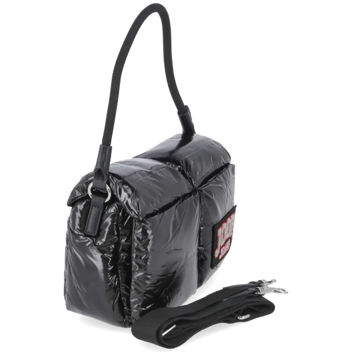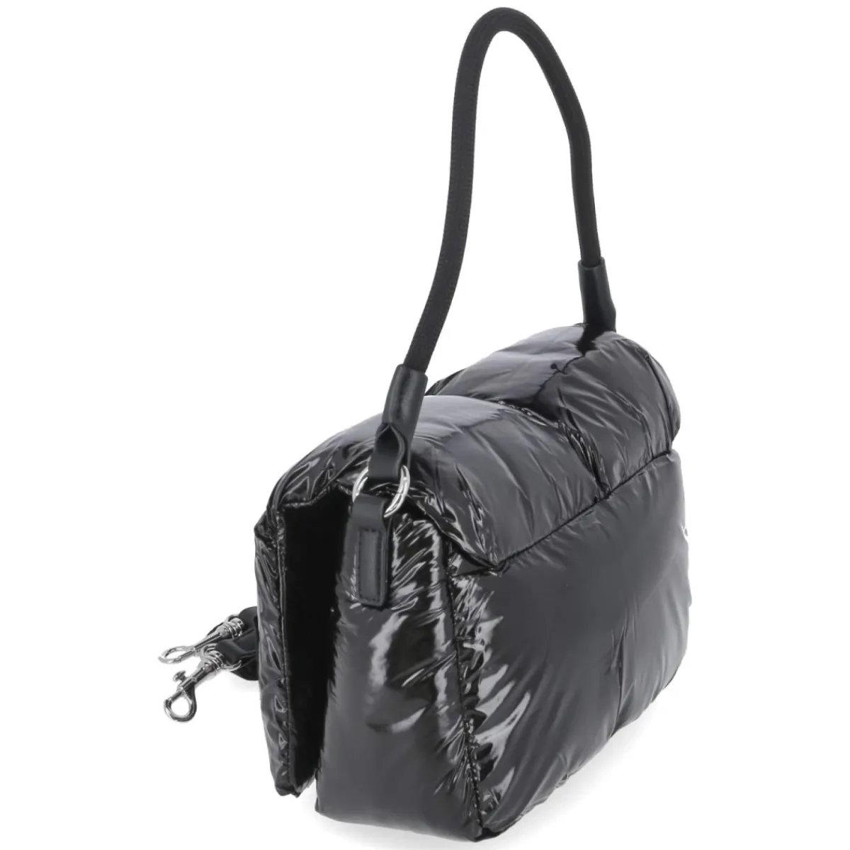 Die Flap Bag VARSITY ZORA in Schwarz setzt mit puff-gestepptem Lackdesign und markantem Frontlogo ein klares Statement. Die kompakte Silhouette (ca. 15 x 25 x 10 cm) fasst rund 3 Liter und bietet mit einem Reißverschlussfach sowie einem Steckfach strukturierte Übersicht für Essentials. Der magnetische Überschlag schließt sicher und lässt zugleich schnellen Zugriff zu. Flexible Tragemöglichkeiten ergeben sich aus dem festen Schulterriemen von ca. 40 cm und dem zusätzlich verstellbaren Gurt bis ca. 130 cm, so wird aus der eleganten Schultertasche im Handumdrehen eine komfortable Crossbody-Begleitung. Glänzende Oberfläche, weiches Volumen und klare Linien verbinden Mode und Funktion in einem vielseitigen Accessoire für Damen. Modetipp: Im monochromen Look mit schwarzem Blazer, Wide-Leg-Hose und metallischen Akzenten wirkt die Tasche besonders modern.