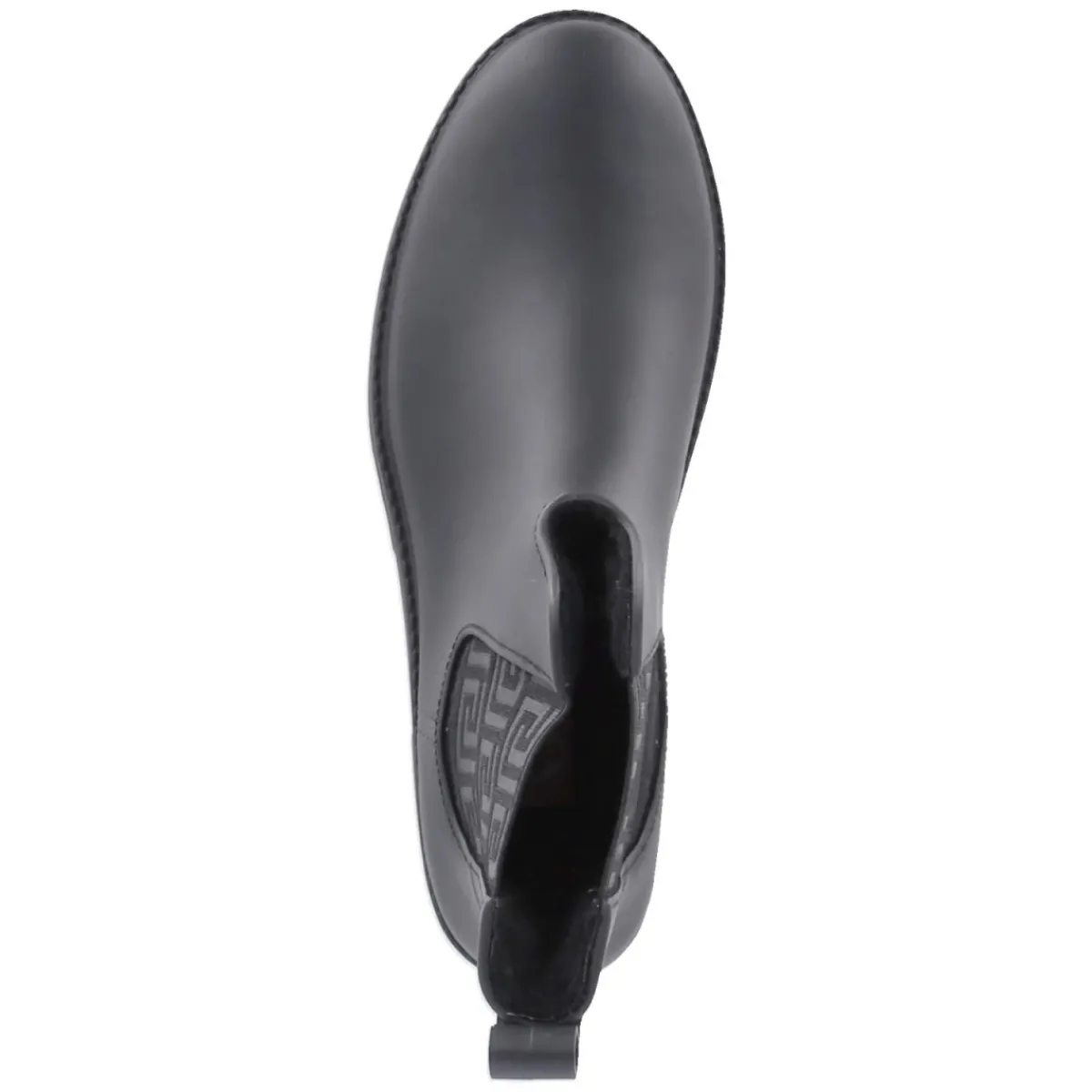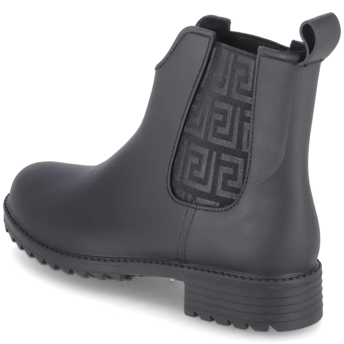 Der schwarze Gummistiefel von Rieker überzeugt mit moderner Optik und durchdachter Funktion. Das wasserfeste Obermaterial aus Synthetik schützt zuverlässig vor Nässe, während warmes Teddyfutter und eine textile Decksohle mit gepolstertem Fußbett für behaglichen Komfort an kalten Tagen sorgen. Der 3,5 cm hohe Blockabsatz bietet stabilen Stand, die runde Spitze lässt den Zehen Raum. Dank seitlicher Elastikeinsätze und Anziehlasche gelingt der Einstieg ohne Verschluss mühelos. Die flexible, rutschhemmende Profilsohle gibt Halt auf nassem Untergrund. Praktischer Hinweis: fällt kleiner aus, daher bei der Wahl ggf. eine Nummer größer berücksichtigen. Modetipp: Zu Wollmantel, Feinstrick und beschichteter Skinny-Jeans entsteht ein urbaner Look, der Regenwetter stilvoll trotzt.