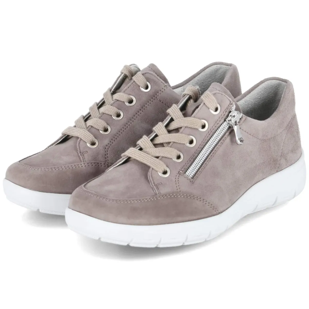 Dieser Damen-Halbschuh von Semler verbindet sportliches Design mit durchdachtem Komfort. Weiches Rauleder in elegantem Taupe legt sich geschmeidig um den Fuß, die runde Spitze bietet entspanntes Platzgefühl. Die Kombination aus Schnürsenkeln und praktischem Reißverschluss ermöglicht schnelles An- und Ausziehen sowie eine passgenaue Regulierung. Innen sorgt eine vorgeformte, textile Decksohle für angenehme Stützung; das Wechselfußbett lässt sich bei Bedarf gegen eigene Einlagen tauschen. Fersen- und Zehenbereich sind verstärkt, die flexible, rutschfeste Laufsohle gibt verlässlichen Halt im Alltag. Das langlebige Echtleder und die solide Verarbeitung begleiten zuverlässig durch viele Saisons. Der Schuh fällt normal aus und überzeugt erwachsene Trägerinnen, die Wert auf Komfort und Stil legen. Modetipp: Zu Cropped-Denim und einer fließenden Bluse entsteht ein smarter City-Look, der das Taupe ideal betont.