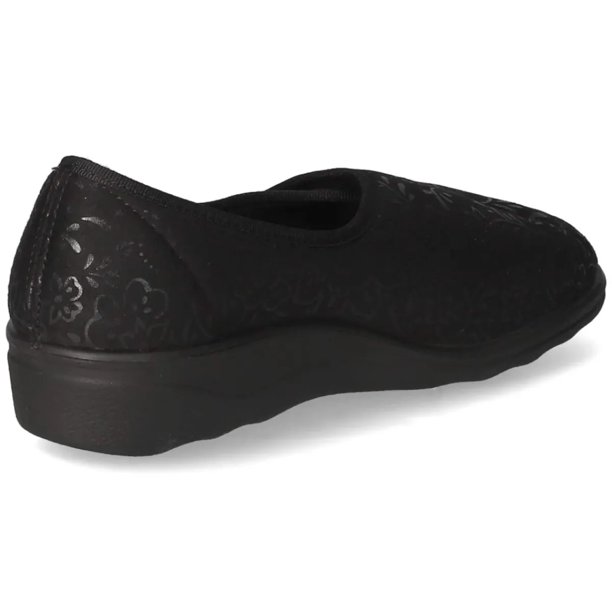 Die Hausschuhe NICE 104 von Josef Seibel verbinden behaglichen Komfort mit dezentem Stil. Das leichte Textilobermaterial in Schwarz schmiegt sich angenehm an und wird von einem schimmernden floralen Muster elegant akzentuiert. Dank rund gearbeiteter Schuhspitze und gepolsterter Decksohle entsteht ein weiches Auftrittsgefühl, das selbst lange Abende auf den Beinen entspannt. Das angenehme Textilfutter sorgt für ein ausgeglichenes Klima, während die flexible Laufsohle leise und anpassungsfähig bleibt. Der bequeme Klettverschluss ermöglicht eine schnelle, individuell regulierbare Passform, die durch die verstärkte Ferse stabil geführt wird. Das Modell fällt normal aus und bietet zuverlässigen Halt im Alltag daheim. Modetipp: Zu einem feinen Strickset in Anthrazit und weichen Kuschelsocken in Ton-in-Ton wirkt das dezente Schwarz besonders edel.