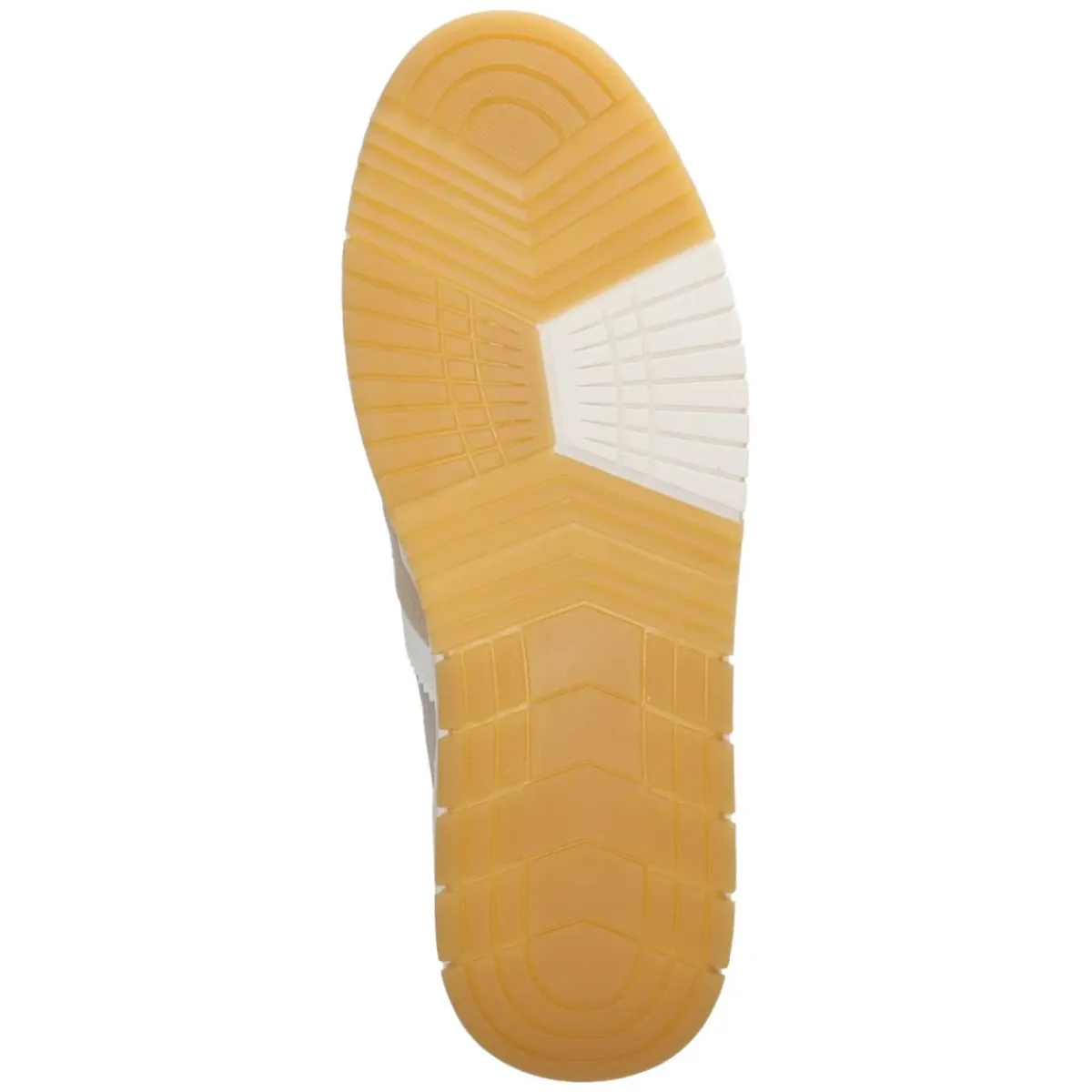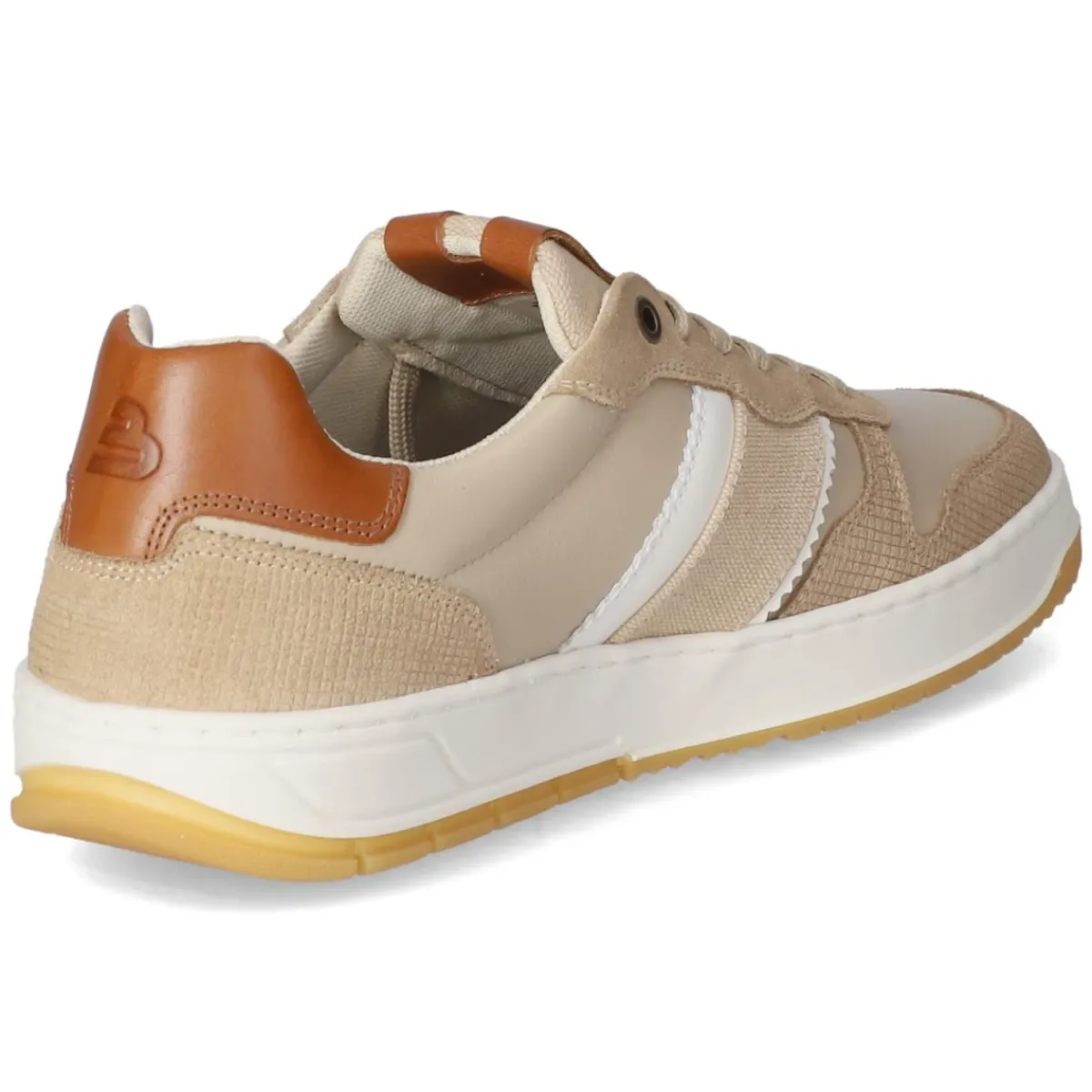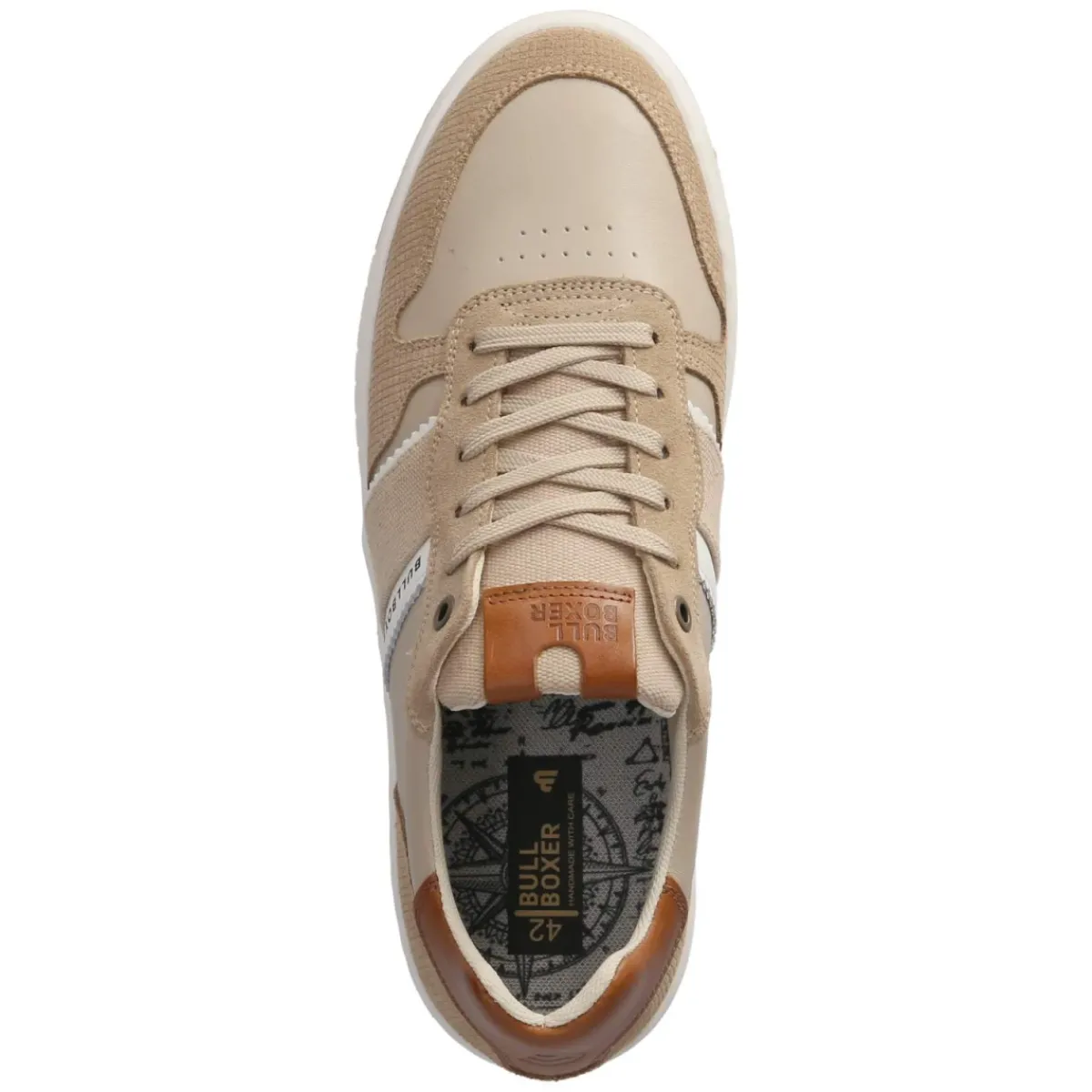Der Low Sneaker von Bullboxer präsentiert sich in einem warmen Beigeton und verbindet lässige Optik mit hohem Tragekomfort. Atmungsaktives Echtleder mit gelochtem Schuhdeck sorgt für ein angenehmes Fußklima, während verstärkte Zehen- und Fersenpartien aus braunem Rauleder zusätzlichen Schutz bieten. Weiße Akzente und ein beige-braunfarbener Zierstreifen aus Textil setzen sportliche Highlights. Die gepolsterte Einstiegszone, das leichte Textilfutter und die textile Decksohle unterstützen den Komfort, das Wechselfußbett erlaubt individuelle Anpassung. Eine flexible, rutschhemmende Laufsohle und die klassische Schnürung gewährleisten sicheren Halt; die runde Spitze unterstreicht die zeitlose Form. Handwerklich gefertigt und größengetreu. Modetipp: Ideal zu Chinos in Sand und einem weißem Oxfordhemd oder zu Raw Denim mit Stricksocken in Naturtönen.