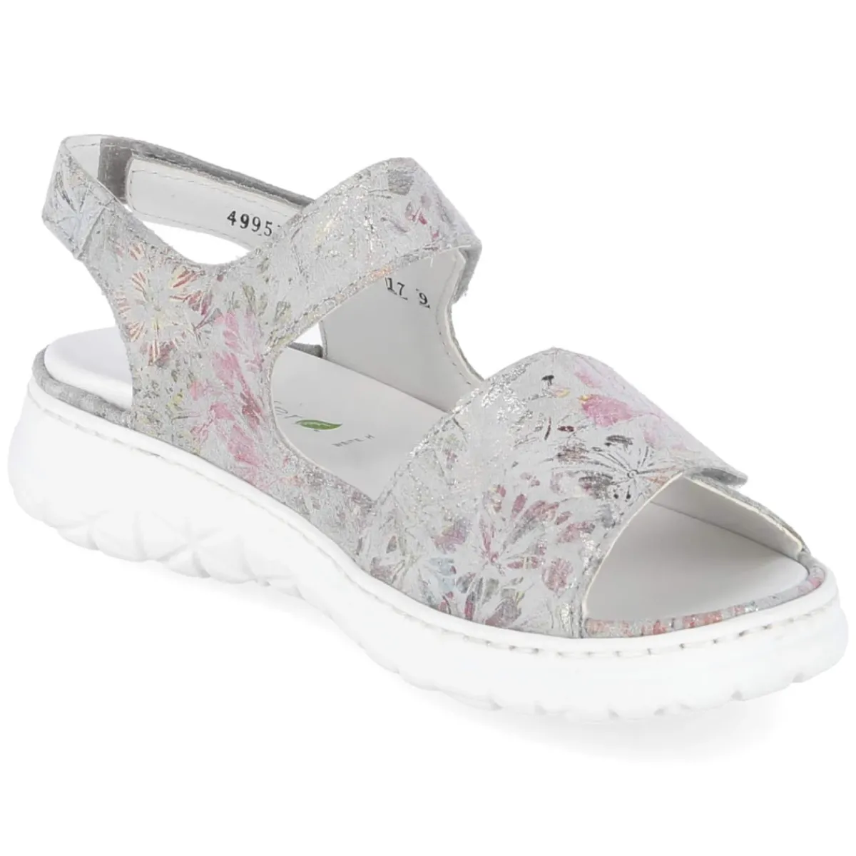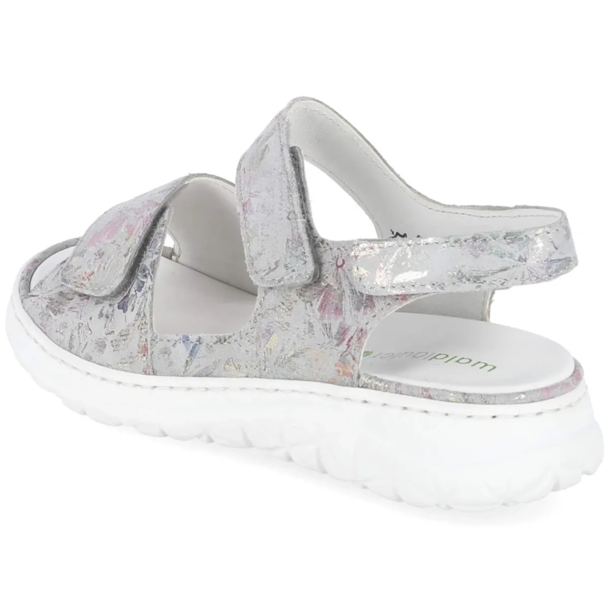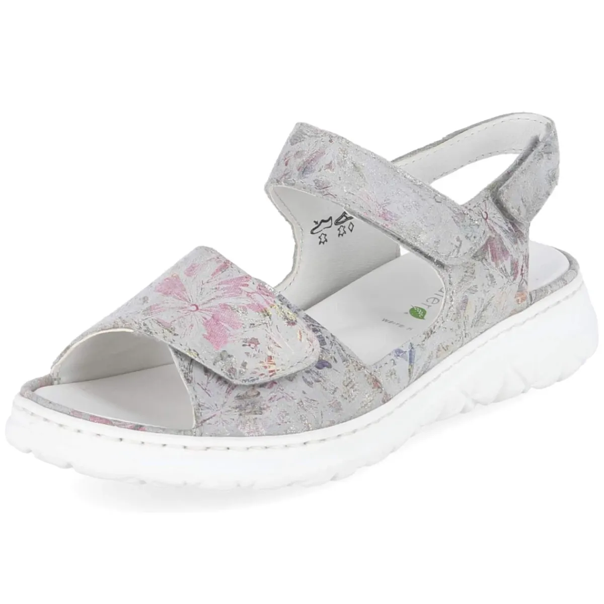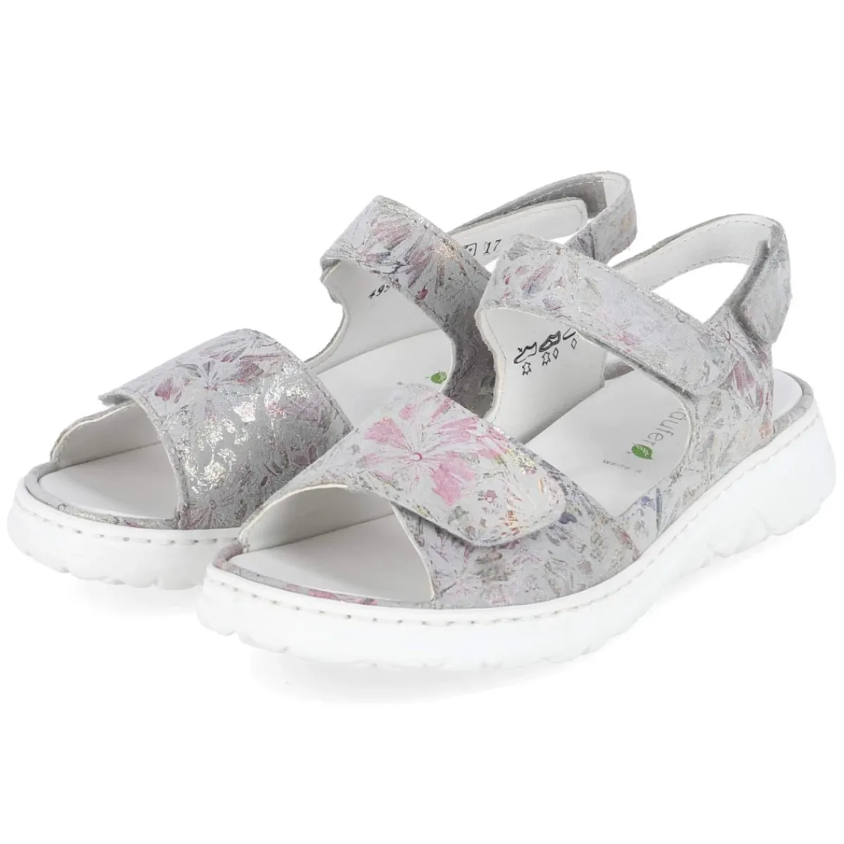 Die Sandalen LIZZY von Waldläufer verbinden langlebiges Echtleder in grauem Rauleder mit einem abstrakten Blütenprint im bunten Metallic-Look. Drei stufenlos verstellbare Klettverschlüsse sorgen für sicheren Halt und ein unkompliziertes An- und Ausziehen, die Passform fällt normal aus. Die offene Schuhspitze belüftet angenehm, während die rutschhemmende, flexible Laufsohle zuverlässigen Grip auf verschiedensten Untergründen bietet. Ein vorgeformtes, weiches Wechselfußbett schont die Gelenke und lässt sich bei Bedarf gegen eigene Einlagen tauschen; die pflegeleichte Decksohle aus Synthetik ergänzt den Komfort. Präzise Verarbeitung und leichte Konstruktion machen das Modell zum vielseitigen Begleiter von früh bis spät. Modetipp: Zu Leinen-Culottes und einer fließenden Bluse setzen die metallischen Akzente ein dezentes Highlight; silberner Schmuck greift den Glanz stilvoll auf.