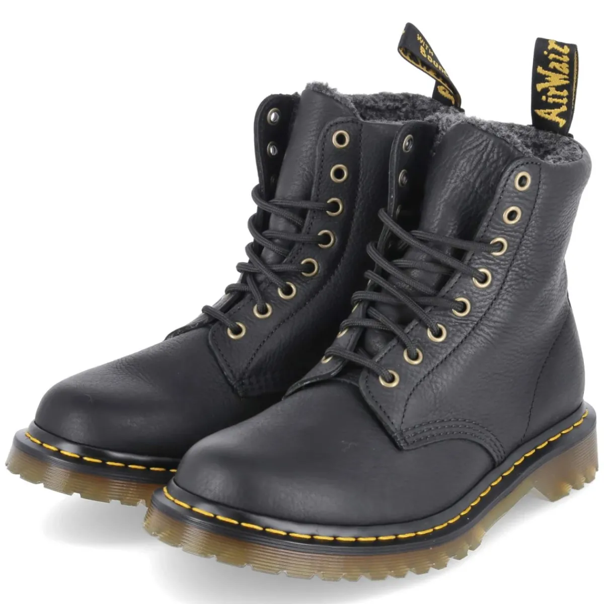 Markante Präsenz und bewährte Qualität: Die schwarzen Dr. Martens Schnürboots vereinen ein klassisches Design mit robustem Charakter. Glattes, langlebiges Echtleder formt die ikonische Silhouette mit runder Spitze, während die rutschhemmende Laufsohle sicheren Tritt auf Asphalt und nassem Pflaster unterstützt. Der Blockabsatz mit 3,5 cm bietet Stabilität und eine dezente Erhöhung, die Textildecksohle ergänzt den Komfort im Alltag. Der schmale Schnitt unterstreicht die klare Linienführung; das Modell fällt insgesamt schmaler aus. Die Schnürung ermöglicht eine präzise Anpassung und sorgt für festen Halt. Modetipp: Besonders stimmig zu aufgekrempelten Chinos, feinem Strick und einem strukturierten Wollmantel, um den kontrastierenden Mix aus Roughness und Eleganz zu betonen.