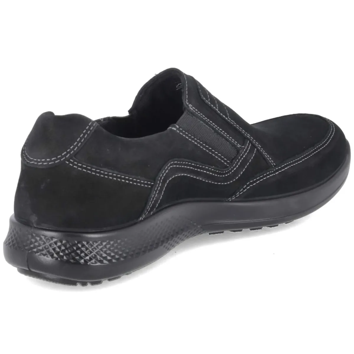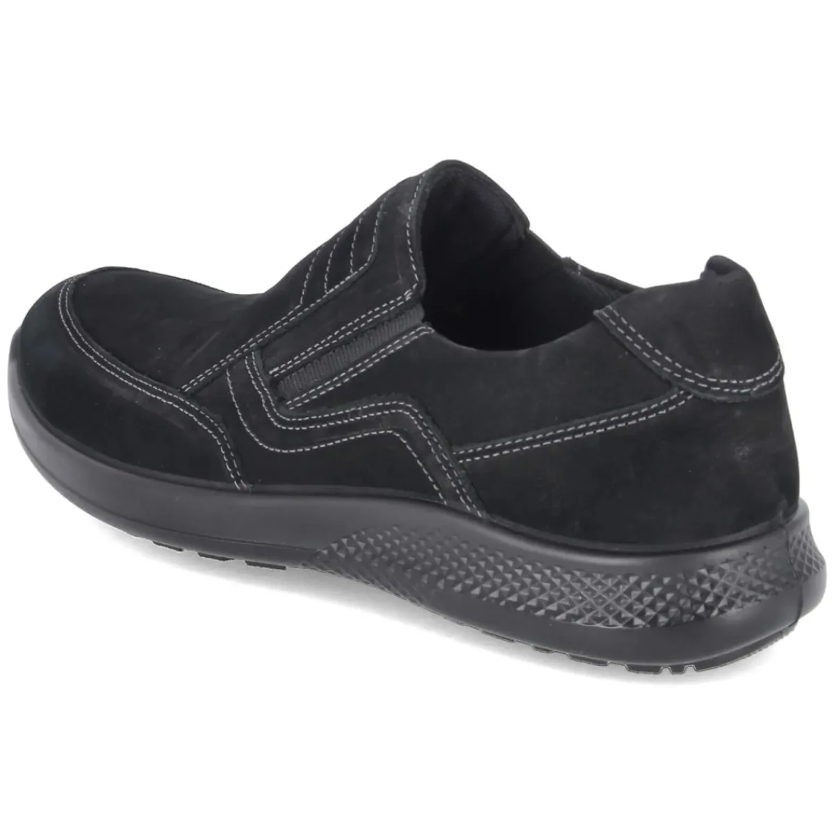 CAMPUS von Jomos präsentiert sich als puristischer Herren-Slipper in schwarzem Rauleder, der langlebiges Echtleder mit moderner Optik vereint. Der runde Leisten sorgt für eine angenehme Zehenfreiheit, während seitliche Elastikeinsätze den Einstieg erleichtern und sicheren Halt geben. Ein gepolsterter Einstieg und das komfortable Wechselfußbett auf textiler Decksohle unterstützen den Fuß den ganzen Tag über. Die flexible, rutschfeste Laufsohle fördert ein natürliches Abrollen und macht den Schuh zum zuverlässigen Begleiter im Alltag. Verstärkte Fersen- und Zehenbereiche erhöhen die Formstabilität und Haltbarkeit. Die Passform fällt normal aus, wodurch gewohnte Größenwahl möglich ist. Modetipp: Zu schmaler Chino und Feinstrick-Polo entsteht ein smarter Casual-Look; mit dunkel gewaschener Jeans und Overshirt wirkt der Slipper lässig und dennoch gepflegt.