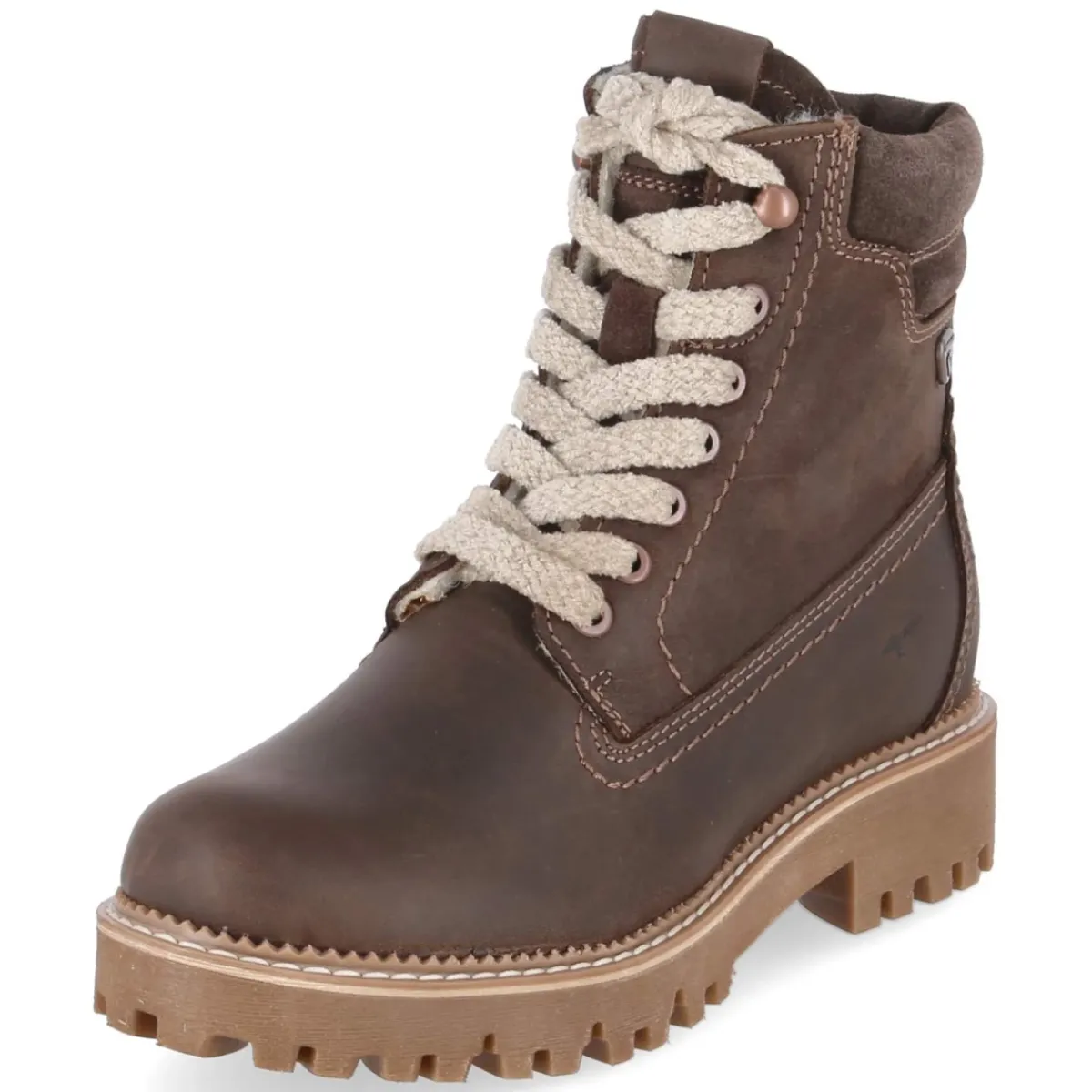 Dieser Tamaris Winterboot in warmem Braun bringt Komfort und Funktion durch die kalte Saison. Das wasserfeste Obermaterial aus Rauleder hält Nässe souverän ab, während das weiche Warmfutter mit 50% Wolle die Füße angenehm umschließt. Für unkompliziertes An- und Ausziehen sorgt ein zusätzlicher Reißverschluss neben der variablen Schnürung. Die rutschfeste Profilsohle und der stabile 4-cm-Blockabsatz bieten Grip und Standfestigkeit auf winterlichen Wegen. Eine verstärkte Ferse, Einstiegspolster und das gepolsterte Fußbett erhöhen den Tragekomfort im Alltag. Mit runder Spitze und klassischem, leicht rustikalem Design passt der Boot vielseitig zu City- und Outdoor-Looks und fällt normal aus. Modetipp: Zu Strickkleid, Wollmantel und grober Strumpfhose wird der Look besonders stimmig.