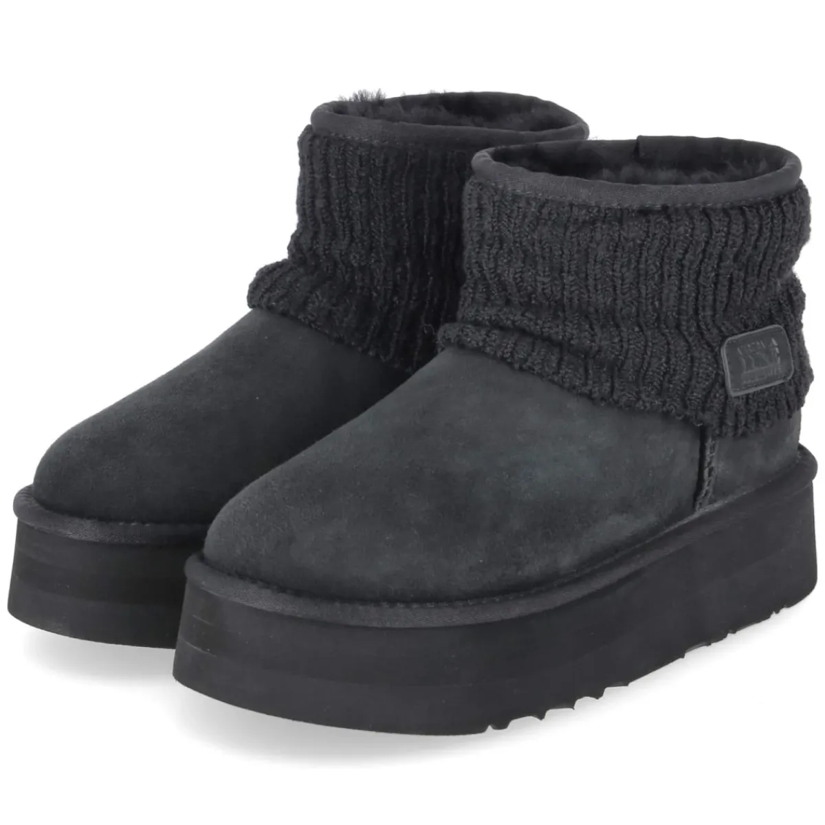 Winterboots FAME von Australia Luxe verbinden urbane Lässigkeit mit funktionalem Komfort. Der robuste Material-Mix aus Leder und Textil präsentiert sich in sattem Schwarz, betont durch markante Nähte. Ein warmes Lammfellfutter und die weiche Textildecksohle sorgen für ein behagliches Tragegefühl, während der gepolsterte Einstieg mit Umschlagkrempe und Lederpatch in Strickoptik sanft umschließt. Die starke, zugleich leichte Plateausohle mit 4,5 cm Absatzhöhe liefert Grip und moderne Proportionen; die runde Spitze und das Design ohne Verschluss machen den Einstieg unkompliziert. Eine verstärkte Ferse mit Metall-Label unterstreicht die hochwertige Verarbeitung. Fällt normal aus und bietet vielseitige Kombinationsmöglichkeiten vom City-Winter bis zum Wochenendtrip. Modetipp: Ton-in-Ton zu schwarzen Leggings, Oversize-Strick und einem langen Mantel tragen – so wirkt die Plateau-Form besonders elegant.
