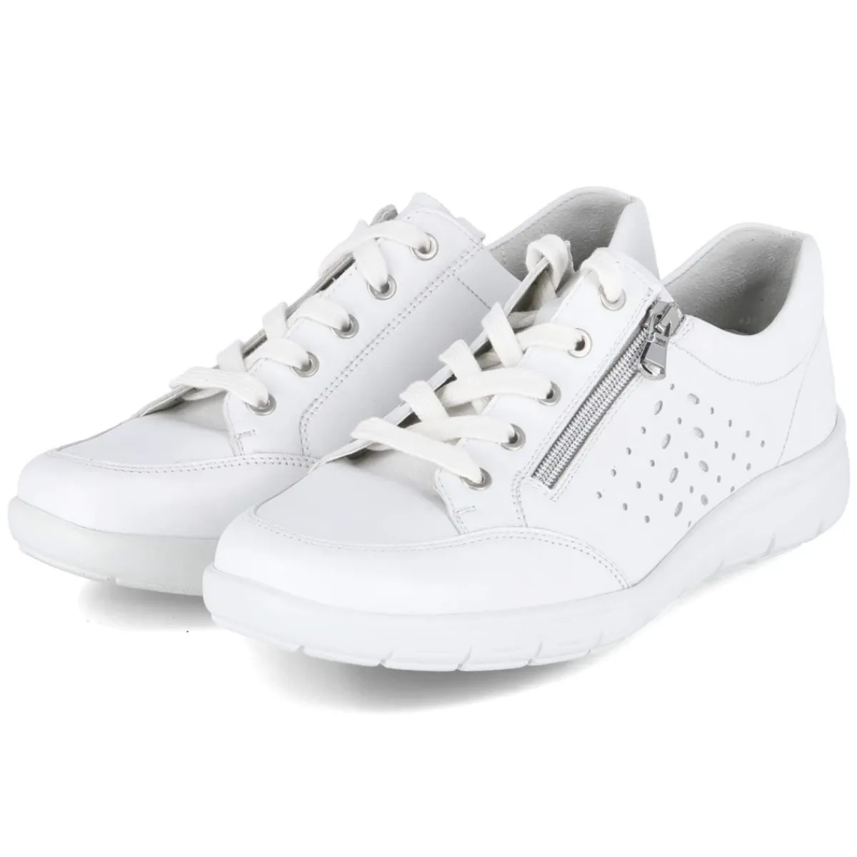 Dieser Damen-Halbschuh von Semler vereint sportliche Leichtigkeit mit verlässlichem Komfort. Weiches Glattleder in strahlendem Weiß umschließt den Fuß formschön, während der runde Leisten und ein gepolstertes, herausnehmbares Fußbett für entspanntes Gehen sorgen. Die textile Decksohle schmiegt sich angenehm an, der verstärkte Fersen- und Zehenbereich stabilisiert bei jedem Schritt. Ein Mix aus Schnürung und seitlichem Reißverschluss erleichtert das An- und Ausziehen, der zusätzliche Zipper bringt praktische Flexibilität. Seitliche Lochungen setzen dezente Akzente und unterstützen die Belüftung. Die flexible, rutschfeste Laufsohle gibt sicheren Halt auf verschiedenen Untergründen. Der Schnitt fällt normal aus und eignet sich ideal für den Alltag erwachsener Trägerinnen, die Wert auf Qualität legen. Modetipp: Zum cleanen Look wirken cropped Jeans, ein gestreifter Breton-Pullover und ein heller Trench besonders stimmig.