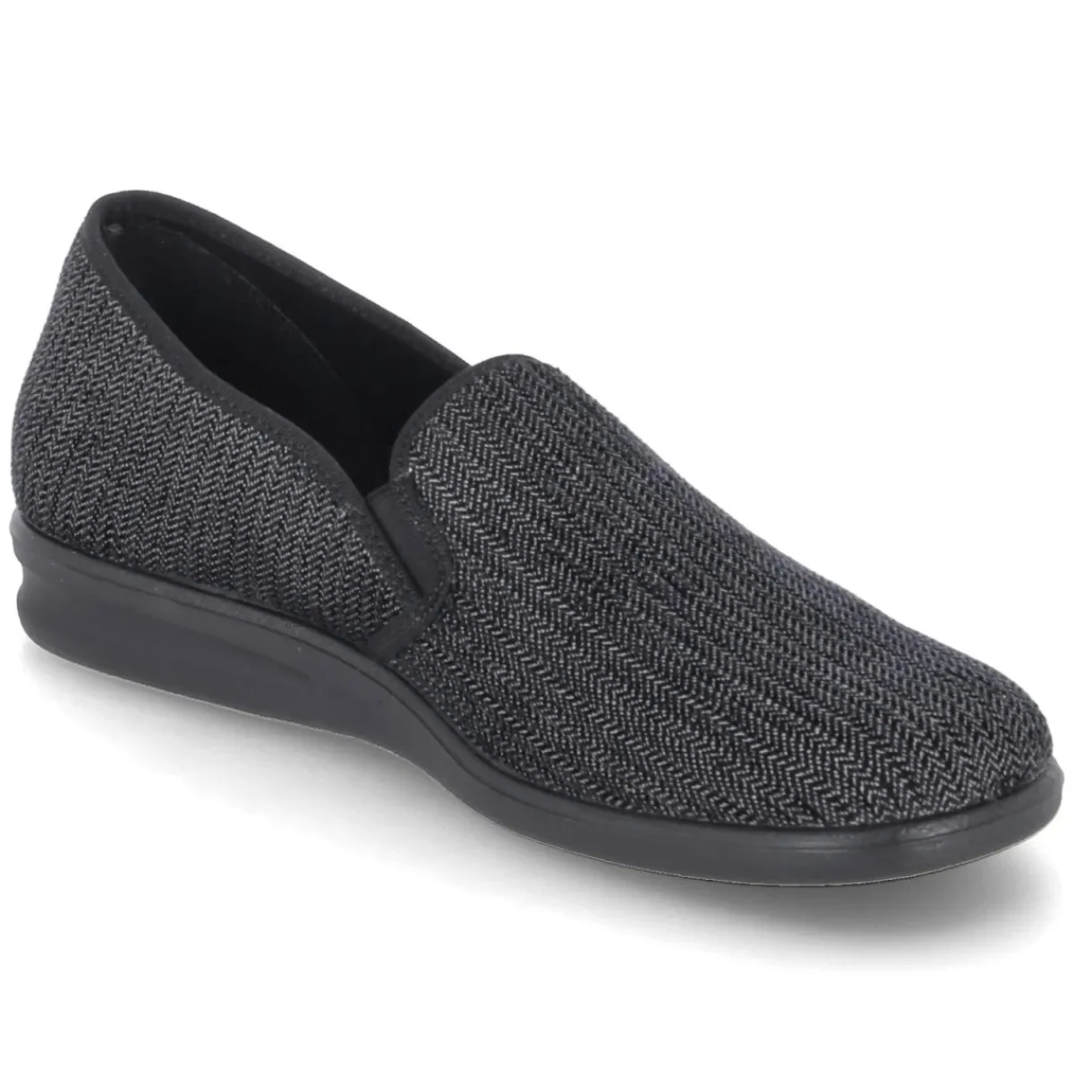 Der Hausschuh BELFORT 122 von Josef Seibel setzt auf entspannten Komfort mit einem robusten Textilobermaterial und zeitloser Ästhetik. In tiefem Schwarz gehalten, wird das dezente Fischgrätmuster zum eleganten Detail, das den klassischen Look unaufdringlich unterstreicht. Die runde Schuhspitze sorgt für ausreichend Zehenfreiheit, während seitliche Elastikeinsätze den Einstieg erleichtern und für einen sicheren Sitz ohne Druckpunkte stehen. Die flexible Laufsohle unterstützt natürliche Abrollbewegungen, das geringe Gewicht entlastet bei jedem Schritt. Innen bietet die Decksohle aus Leder-Textil eine angenehme Haptik und ein ausgewogenes Tragegefühl. Der Schnitt fällt normal aus und überzeugt im Alltag ebenso wie in entspannten Momenten nach langen Tagen. Modetipp: Zu einer feinen Strickhose und schmalem Cardigan tragen, dazu gemütliche, einfarbige Socken – so entsteht ein aufgeräumter Loungeblick mit subtiler Struktur.