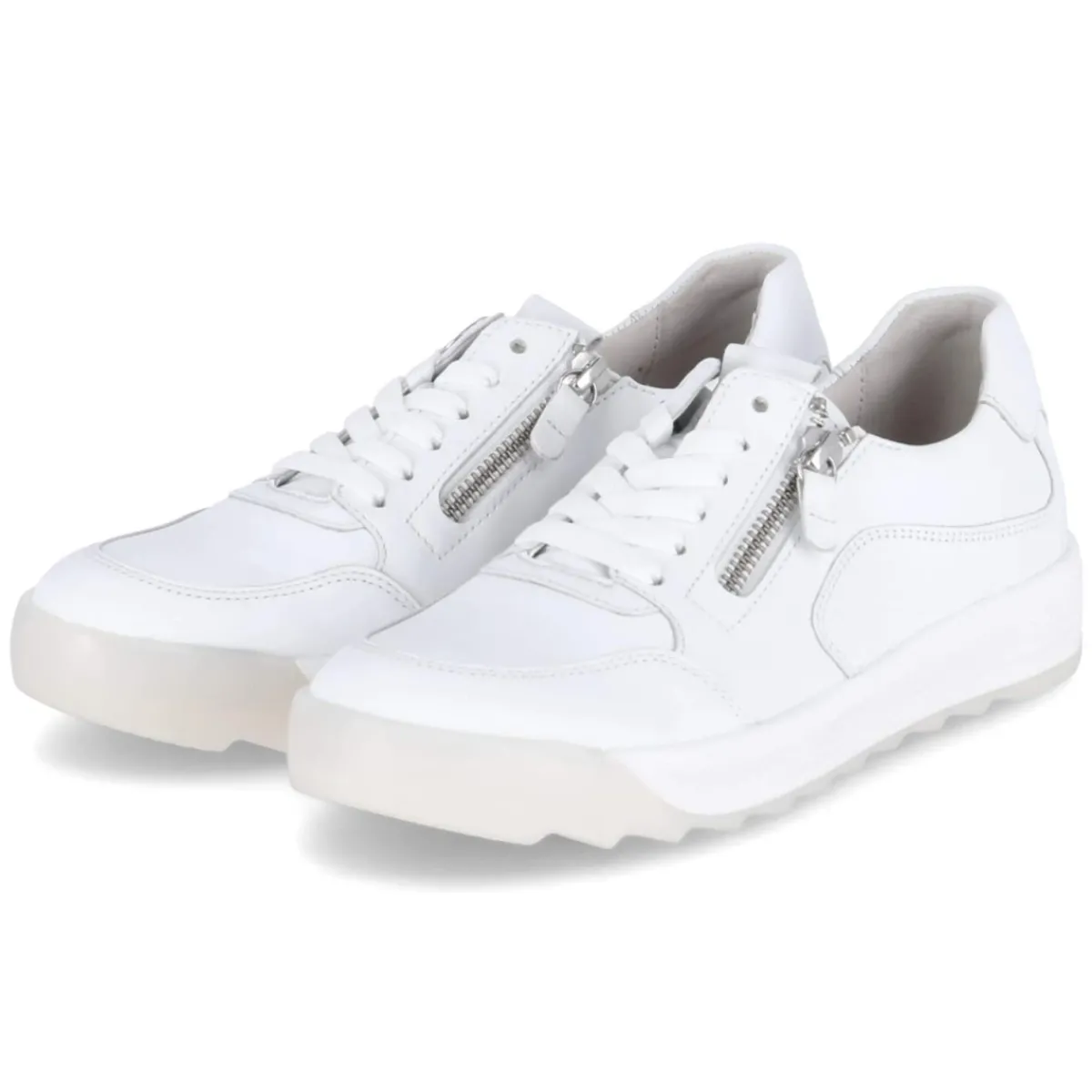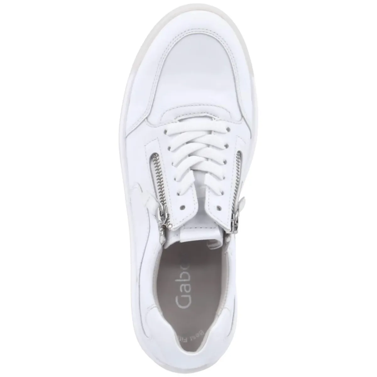 Der Gabor Low Sneaker in strahlendem Weiß verbindet urbanen Minimalismus mit durchdachtem Komfort. Langlebiges Echtleder in feinem Glattleder sorgt für eine wertige Optik, die runde Schuhspitze und der leicht gepolsterte Einstieg unterstützen entspanntes Gehen. Schnürung und zwei Reißverschlüsse ermöglichen variablen Halt und ein schnelles Hineinschlüpfen, der verstärkte Zehen- und Fersenbereich erhöht die Robustheit. Ein herausnehmbares, weich gepolstertes Wechselfußbett aus recycelten Materialien bietet angenehme Dämpfung und macht den Sneaker zugleich umweltfreundlich und nachhaltig. Die flexible, rutschhemmende Laufsohle gibt sicheren Grip im Alltag, dezentes Branding setzt einen feinen Akzent. Die Passform fällt normal aus, eine Decksohle aus Leder rundet das Tragegefühl ab. Modetipp: Zu cropped Denim und cleanem Trench wirkt das Weiß besonders modern.