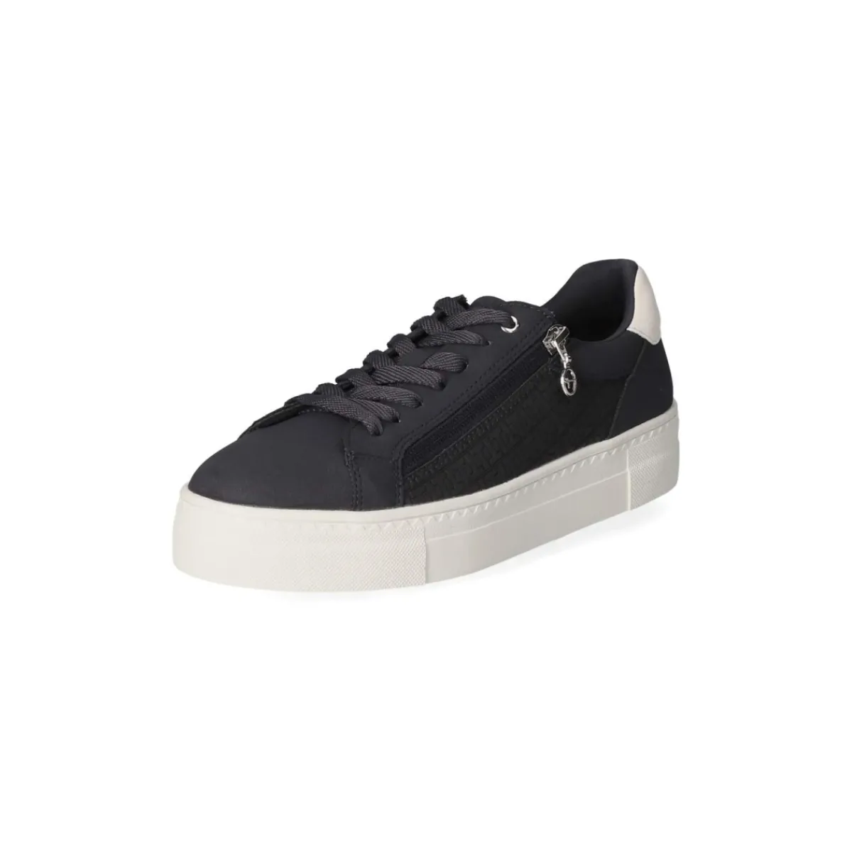 Der Low Sneaker von Tamaris in Blau verbindet urbanen Stil mit durchdachtem Komfort. Das Obermaterial aus Synthetik zeigt eine feine Markenmusterprägung, weiße Highlights und dezente Markendetails, während der verstärkte Fersenbereich und der leicht gepolsterte Einstieg sicheren Halt bieten. Ein 3,5 cm hohes Plateau sorgt für eine moderne Silhouette und angenehme Dämpfung. Praktisch im Alltag: die Kombination aus Schnürsenkeln und seitlichem Reißverschluss für einen bequemen Einstieg. Das herausnehmbare, komfortable Wechselfußbett und die textile Decksohle unterstützen ein angenehmes Fußklima, die rutschfeste Laufsohle gibt verlässlichen Grip. Mit runder Spitze, größengetreuem Sitz und veganen Materialien ist das Modell eine smarte Wahl für Damen und Erwachsene, die Wert auf Leichtigkeit und Stil legen. Modetipp: mit heller Straight-Jeans, gestreiftem Shirt und Blazer entsteht ein frischer, maritimer Look.