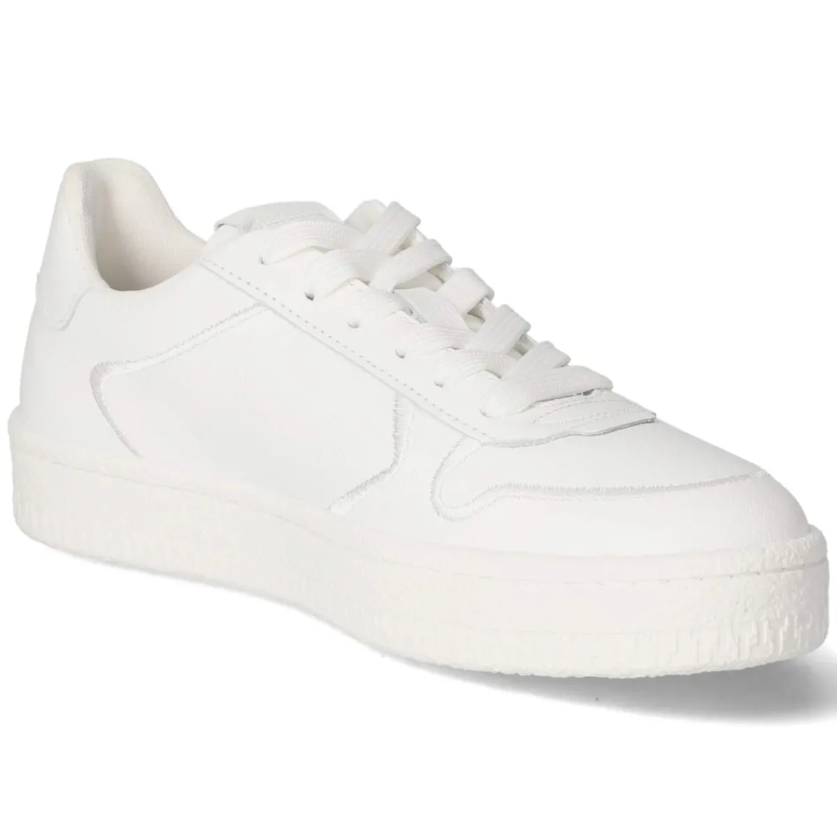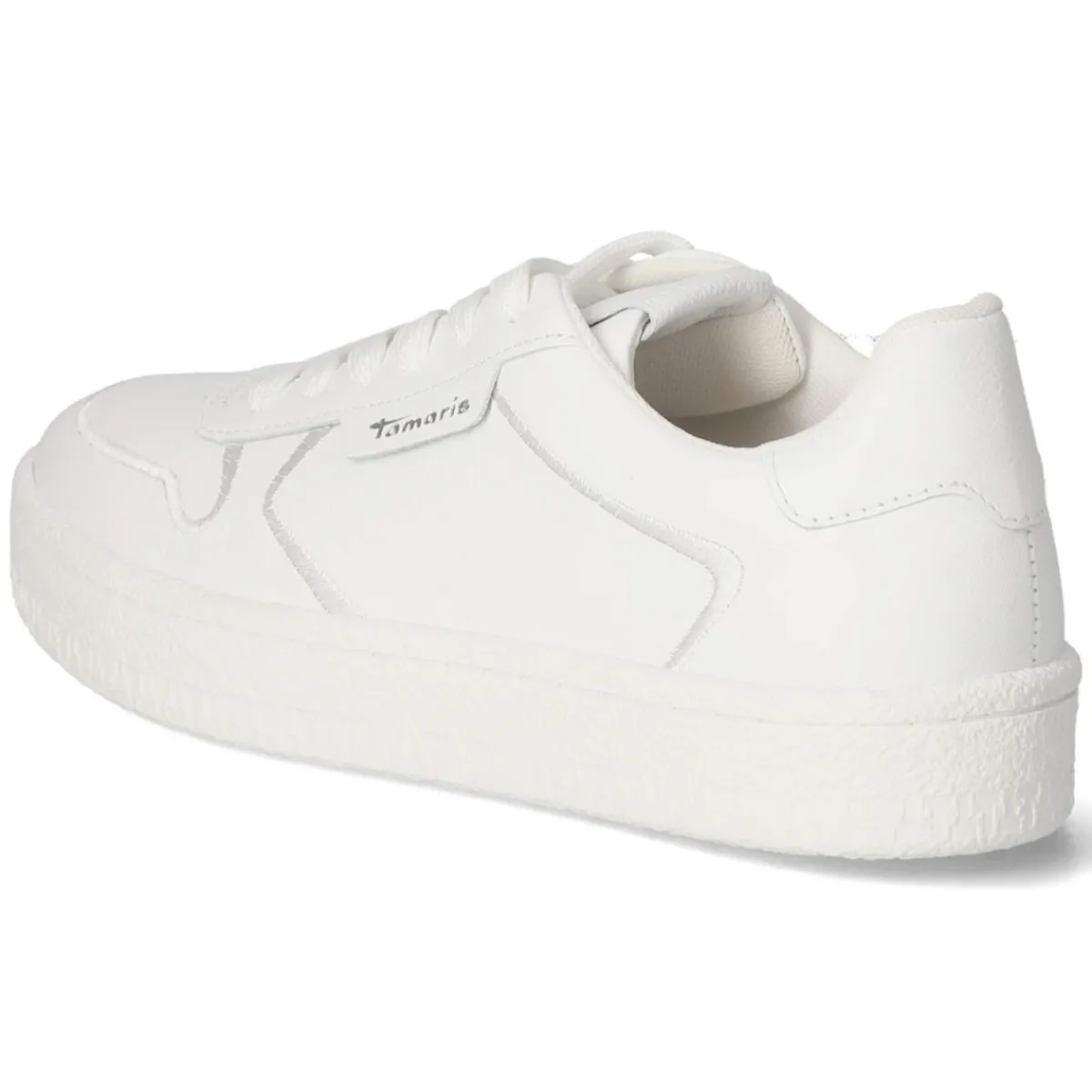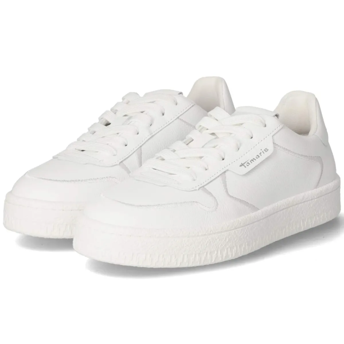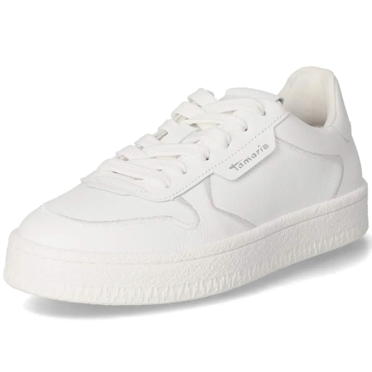 Der Low Sneaker von Tamaris verbindet schlichte Eleganz mit verlässlichem Komfort. Das weiße Obermaterial aus robustem, glattem Echtleder setzt auf klare Linien und ein gepflegtes Erscheinungsbild, während gestickte Zierstreifen und ein dezenter Markenschriftzug subtilen Charakter verleihen. Die runde Spitze und die klassische Schnürung ermöglichen eine angenehme, eigene Anpassung. Innen sorgt eine Textildecksohle zusammen mit dem gepolsterten, herausnehmbaren Wechselfußbett für sanfte Dämpfung im Alltag. Eine flexible, griffige Laufsohle bietet Halt auf urbanem Terrain, die verstärkte Ferse schenkt zusätzliche Stabilität. Der Schnitt fällt normal aus und ergänzt vielfältige Outfits von smart bis casual. Modetipp: Für einen frischen City-Look mit cropped Straight-Jeans, weißem T-Shirt und Trench oder, sportlich interpretiert, mit geripptem Stricksocke und Midirock kombinieren.