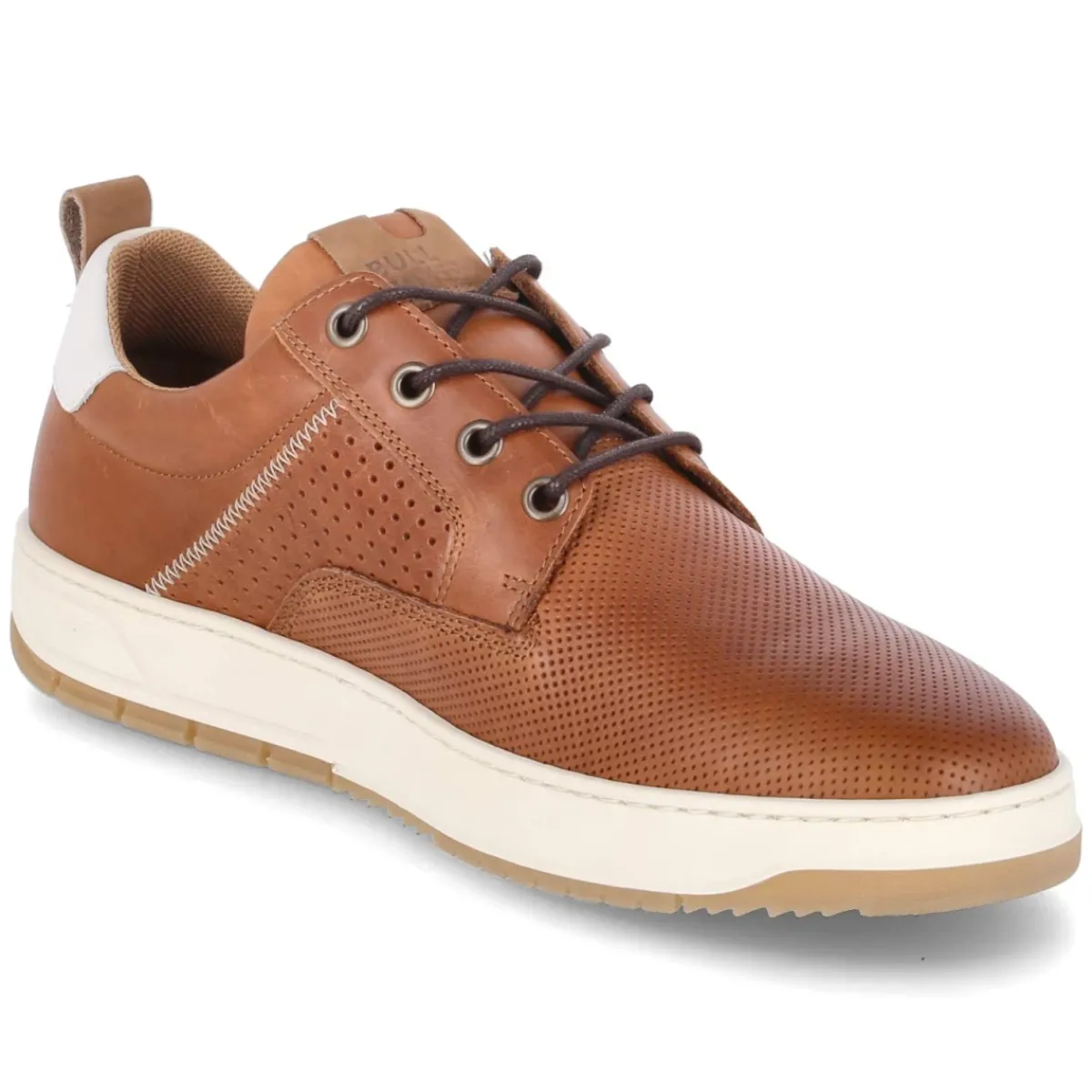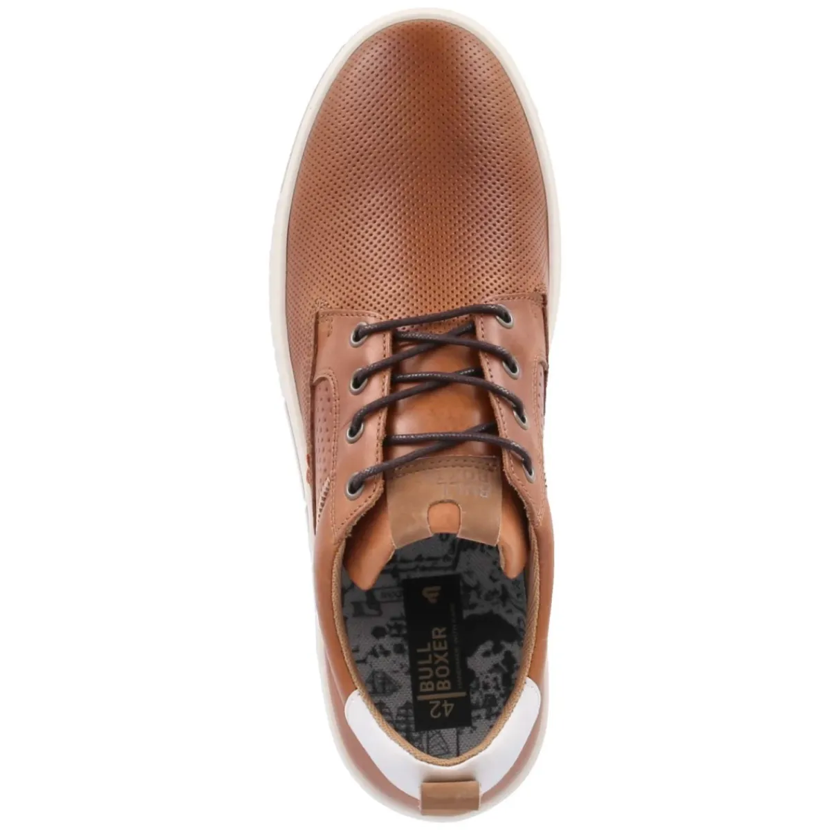 Bullboxer präsentiert mit dem Modell Low Sneaker einen braunen Herren-Schuh, der smarten Stil und Komfort verbindet. Langlebiges Echtleder in glatter Ausführung trifft auf ein handcrafted Finish, fein geprägte Oberfläche, seitliche Lochung und eine markante Ziernaht, die der edlen Optik Tiefe gibt. Schnallenverschluss und klassische Schnürung sorgen gemeinsam für sicheren Halt, während die runde Schuhspitze und der leicht gepolsterte Einstieg die relaxed-sportive Silhouette abrunden. Innen bietet eine weiche Textil-Decksohle zusammen mit dem gepolsterten, herausnehmbaren Wechselfußbett angenehme Dämpfung. Die flexible, rutschhemmende Cupsohle mit griffigem Profil und der verstärkte Fersenbereich geben Traktion und Stabilität; eine Anziehlasche erleichtert den Einstieg. Das Modell fällt größer aus, daher empfiehlt sich die kleinere Größe. Modetipp: zu Chino und Feinstrick, ergänzt um einen braunen Ledergürtel im gleichen Ton.