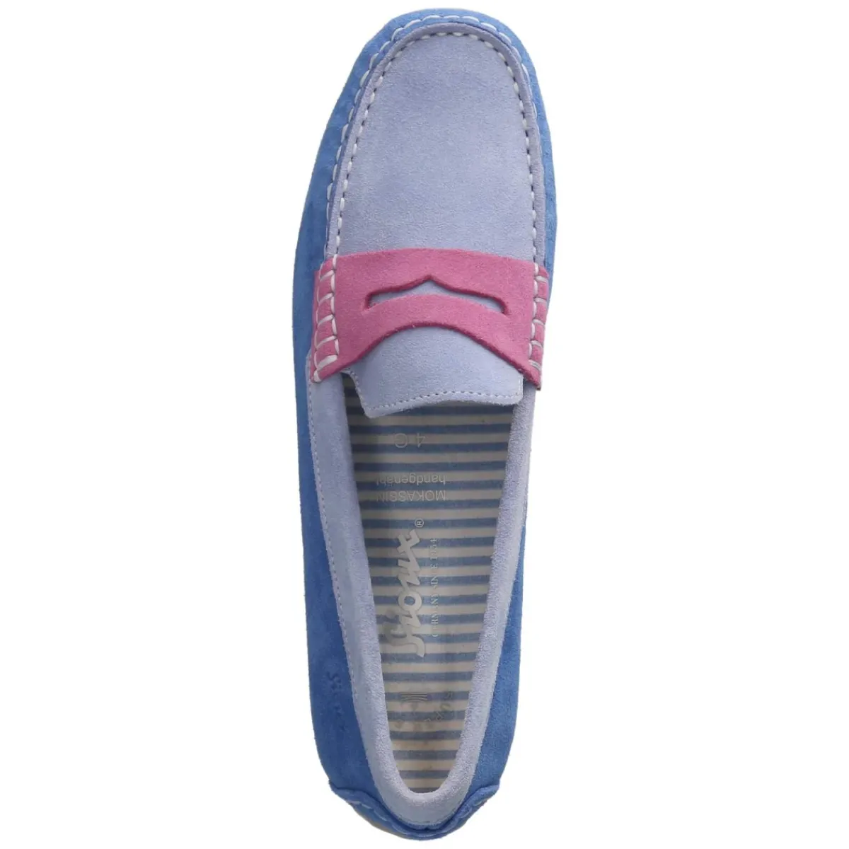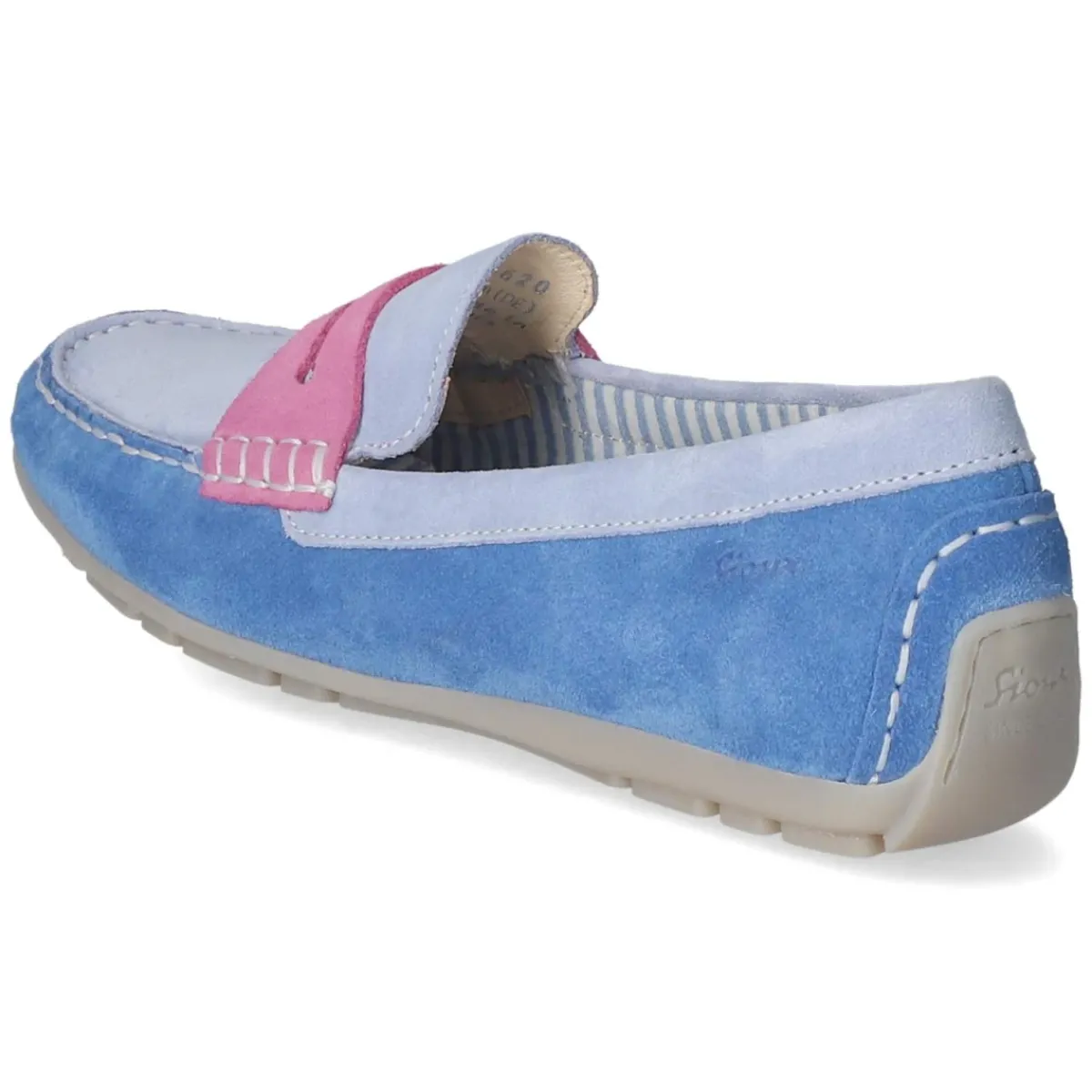 Der Mokassin CARMONA-700 von Sioux vereint lässige Eleganz und Komfort in einem blauen Auftritt. Weiches Rauleder aus robustem Echtleder formt eine runde Silhouette mit klassischer Wulstnaht, rustikalen Ziernähten und einem rosafarbenen Zierriemen, der von hellblauen Akzenten begleitet wird. Das gepolsterte Wechselfußbett mit textiler Decksohle lässt sich bei Bedarf austauschen und sorgt zusammen mit der verstärkten Ferse für angenehmen Halt. Ohne Verschluss konzipiert, gelingt das Hineinschlüpfen mühelos. Die flexible, rutschhemmende Laufsohle unterstützt einen sicheren Schritt, ob im Alltag oder bei besonderen Anlässen. Der Schnitt fällt normal aus. Modetipp: Zum maritimen Look mit weißer Chino, feinem Streifenshirt und goldfarbenem Armreif kombinieren.
