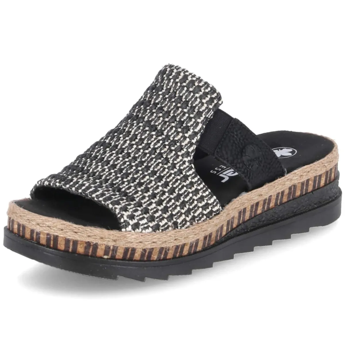 Diese Damen-Pantoletten von Rieker vereinen sommerliche Leichtigkeit mit verlässlichem Komfort. Das schwarze Textil-Obermaterial zeigt einen breiten Riemen in markanter Flechtoptik, der dem minimalistischen Design Struktur verleiht und sicheren Halt gibt. Die offene Schuhspitze sorgt für luftiges Tragegefühl, während die weiche Textil-Decksohle und das gepolsterte Fußbett entspannte Schritte über den ganzen Tag ermöglichen. Eine rutschhemmende Laufsohle mit leichtem Keil entlastet beim Gehen und verleiht eine dezente Silhouette. Der gestreifte Sohlenrahmen in Korkoptik setzt einen natürlichen Akzent, der zu zahlreichen Looks passt. Dank pflegeleichter Oberfläche und guter Kombinationsmöglichkeiten ist das Modell ein unkomplizierter Begleiter und fällt in der Größe normal aus. Modetipp: Mit Leinenhose, gestreiftem Shirt und Basttasche entsteht ein moderner City-Look; abends ergänzt ein Midikleid in Creme die elegante Note.