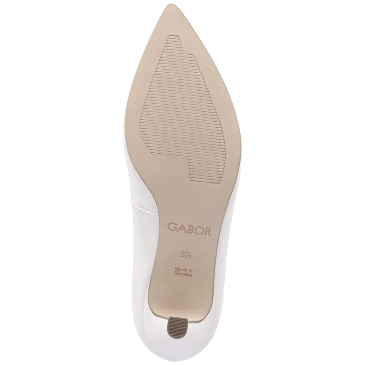 Dieser Pumps von Gabor vereint moderne Eleganz mit hohem Tragekomfort. Das Obermaterial aus hochwertigem Glattleder zeigt einen dezenten, perlmutartigen Schimmer, der die weiße Farbe nuanciert und jedem Look eine edle Note verleiht. Die runde Schuhspitze und die schlanke Linienführung sorgen für eine feminine Silhouette, während das gepolsterte Fußbett und die Decksohle aus Leder sanfte Dämpfung und ein angenehmes Klima bieten. Der 6 cm hohe Trichterabsatz streckt optisch das Bein, bleibt aber dank seiner Form stabil und alltagstauglich. Eine flexible Laufsohle unterstützt einen geschmeidigen Abrollvorgang, die Passform fällt normal aus. Das Design ohne Verschluss ermöglicht bequemes Hineinschlüpfen und einen aufgeräumten Look. Modetipp: Besonders harmonisch wirkt der Pumps zu einem cremefarbenen Hosenanzug oder einem Satinkleid in Elfenbein; eine perlenbesetzte Clutch verstärkt den feinen Glanz.
