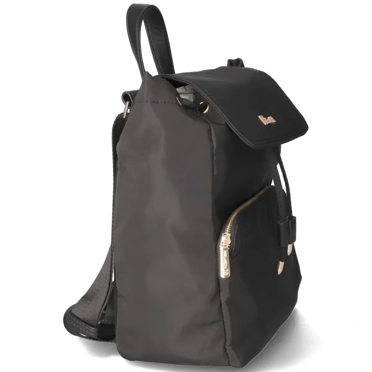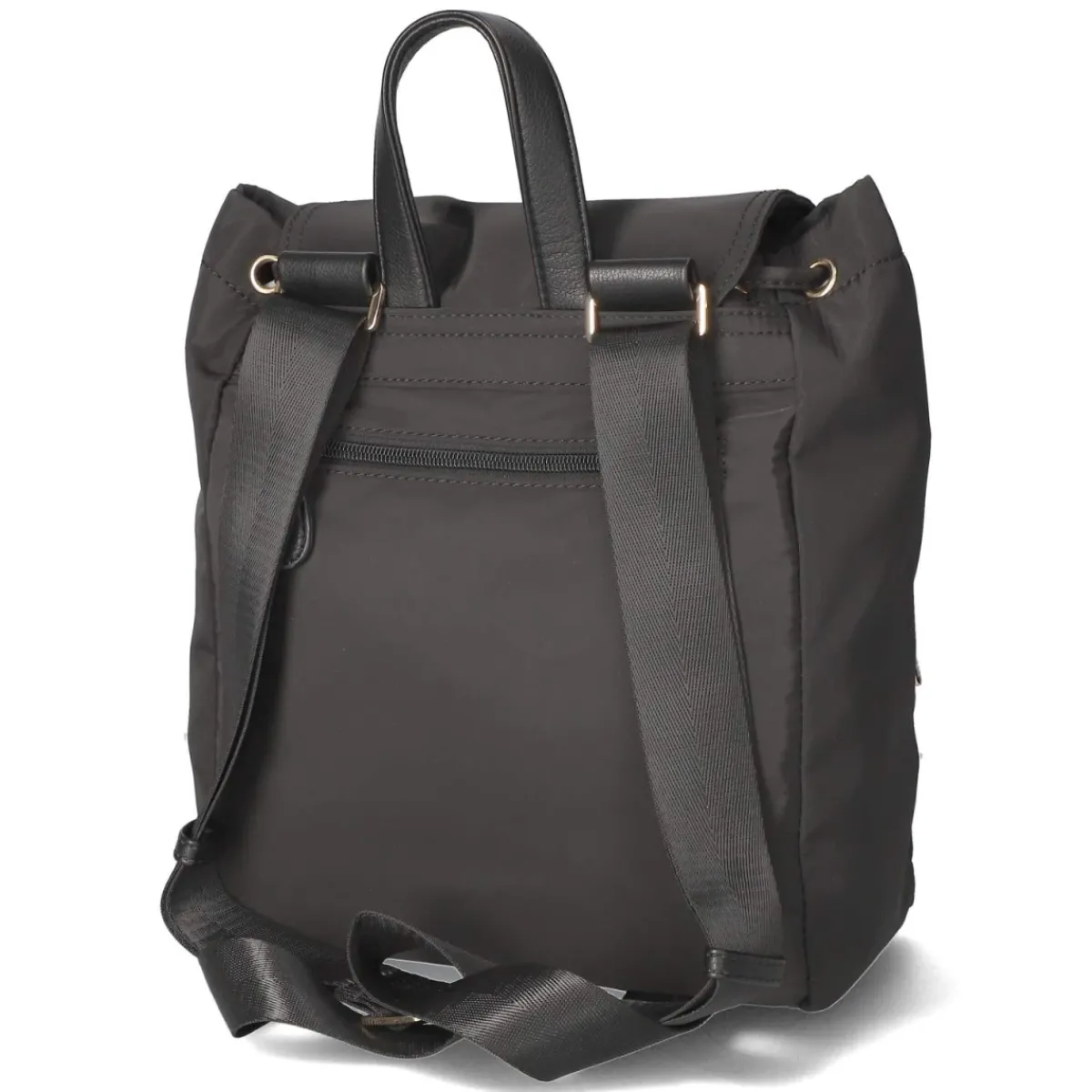 Eleganter Damenrucksack in klassischem Schwarz, der klare Linien mit funktionalen Details verbindet. Die Zugbänder schließen den Inhalt sicher, während goldene Akzente und ein dezentes Markenlogo für einen hochwertigen Look sorgen. Mit ca. 30 x 24 x 12 cm und einem Volumen von etwa 8,5 Litern bietet das Format genügend Platz für Essentials. Zwei Reißverschluss-Außenfächer halten Kleinigkeiten griffbereit, innen strukturieren zwei Steckfächer und ein Reißverschlussfach den Alltag. Ein fester Handriemen von ca. 15 cm sowie zwei bis ca. 90 cm verstellbare Schulterriemen ermöglichen variable Trageoptionen. Der verstärkte Boden bewahrt Form und Stabilität – ob im Büro, beim Stadtbummel oder auf Reisen. Modetipp: Zu einem schwarzen Blazer, weißem T-Shirt und High-Waist-Jeans kombinieren, dazu Loafer in Lackoptik für einen modernen Monochrom-Look.