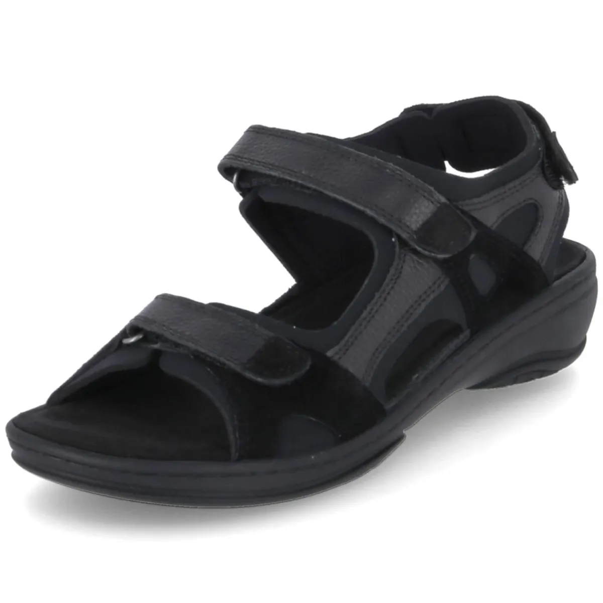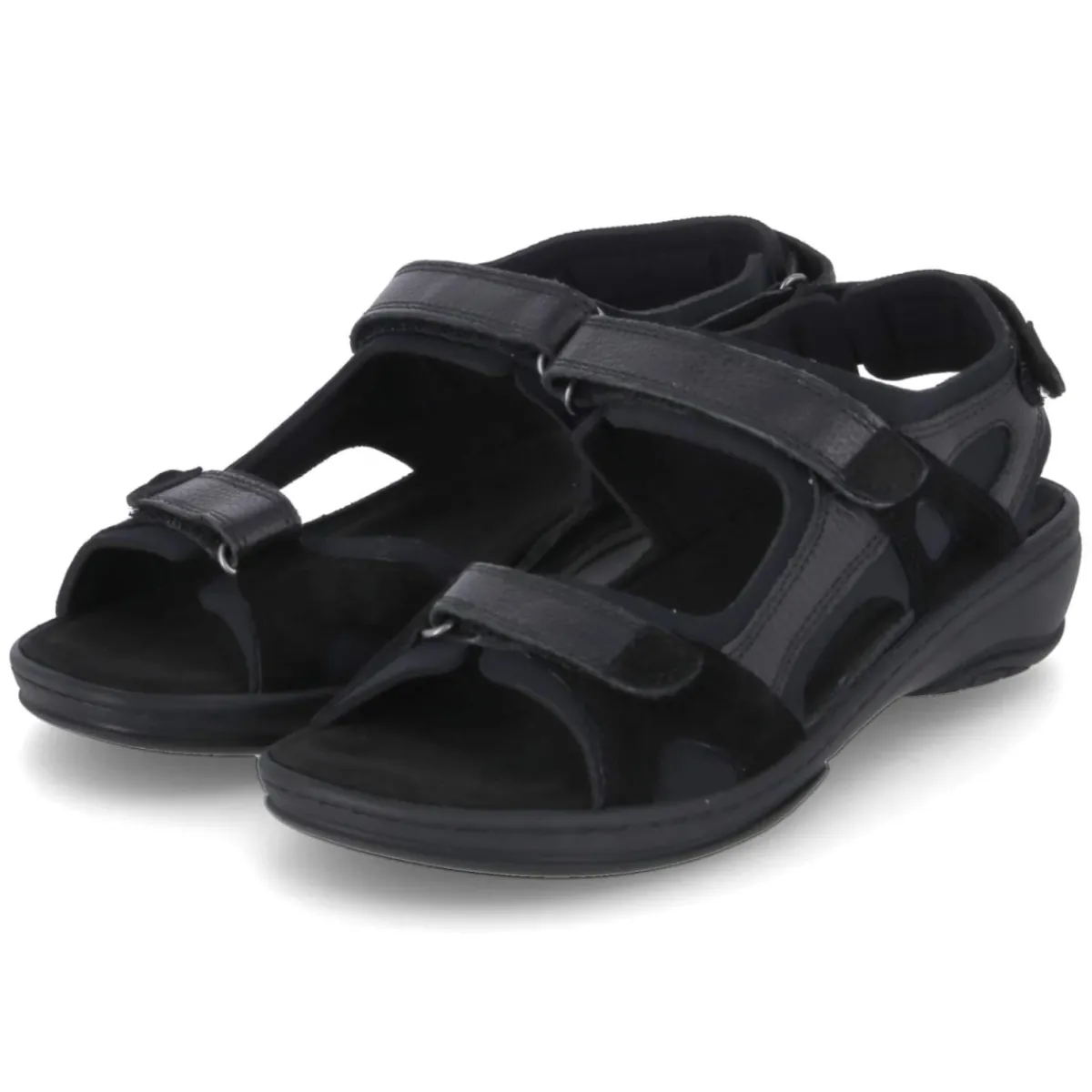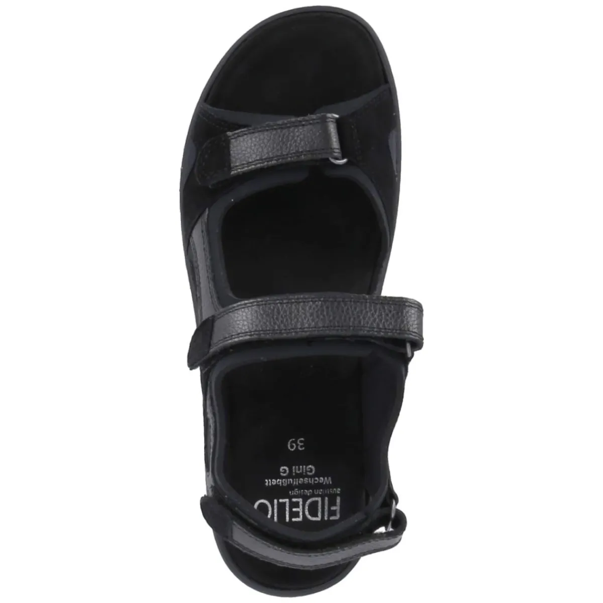 Zeitlos in Schwarz präsentiert sich die Damen-Sandale von Fidelio als verlässlicher Sommerbegleiter. Der robuste Material-Mix aus Leder und Textil sorgt für angenehme Stabilität und Flexibilität, die offene Schuhspitze und das weiche Textilfutter für ein luftig-sanftes Tragegefühl. Drei praktische Klettverschlüsse erlauben eine individuelle Anpassung, während das komfortable Wechselfußbett mit gepolsterter, herausnehmbarer Textil-Decksohle angenehm unterstützt und bei Bedarf durch eigene Einlagen ersetzt werden kann. Die flexible Laufsohle fördert natürliche Abrollbewegungen und sorgt für Trittsicherheit im Alltag. Das Modell fällt normal aus und fügt sich dank der klaren Linienführung mühelos in verschiedenste Looks ein. Modetipp: Besonders stimmig wirkt die Sandale zu monochromen Outfits mit fließender Culotte und leichter Bluse, dazu eine strukturierte Ledertasche für einen dezent eleganten Akzent.