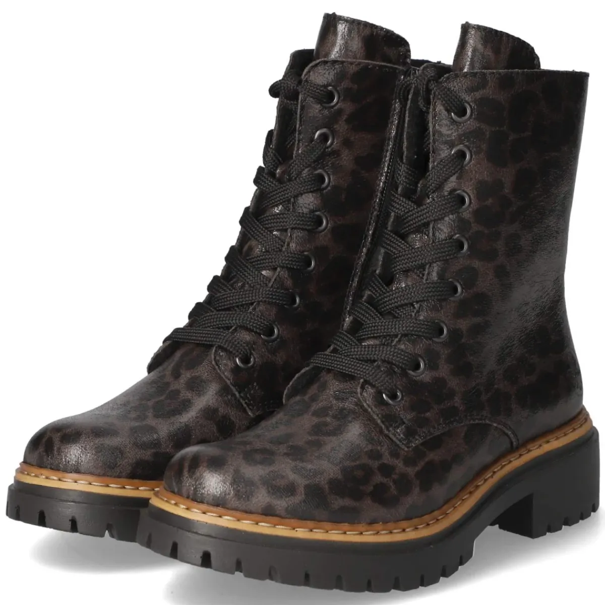 Rieker interpretiert Schnürstiefeletten für Damen mit einer markanten Mischung aus Komfort und Statement. Der braune Leopardenprint mit schimmernder Oberfläche setzt ein modisches Ausrufezeichen, während die runde Spitze und der 4 cm hohe Blockabsatz alltagstauglich bleiben. Robuste Synthetik oben und eine Synthetik-Decksohle bieten pflegeleichte Eigenschaften, das leichte Futter wärmt zuverlässig an kühlen Tagen. Dank Schnürsenkeln und zusätzlichem Reißverschluss entsteht ein praktischer Doppelverschluss, der schnellen Einstieg und individuellen Halt vereint. Die flexible, rutschhemmende Profilsohle sorgt für Grip auf herbstlichen Wegen, Markendetails runden den Look ab. Der Größenhinweis fällt normal aus und erleichtert die Wahl. Modetipp: Besonders wirkungsvoll zu dunkelblauer Skinny-Jeans und cremefarbenem Oversize-Strick, dazu eine Crossbody-Bag in Cognac für ein harmonisches Finish.