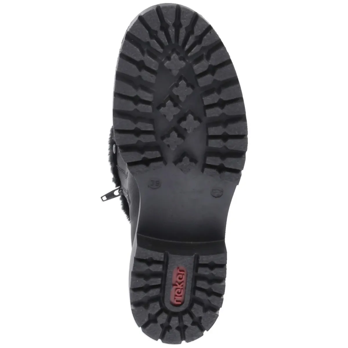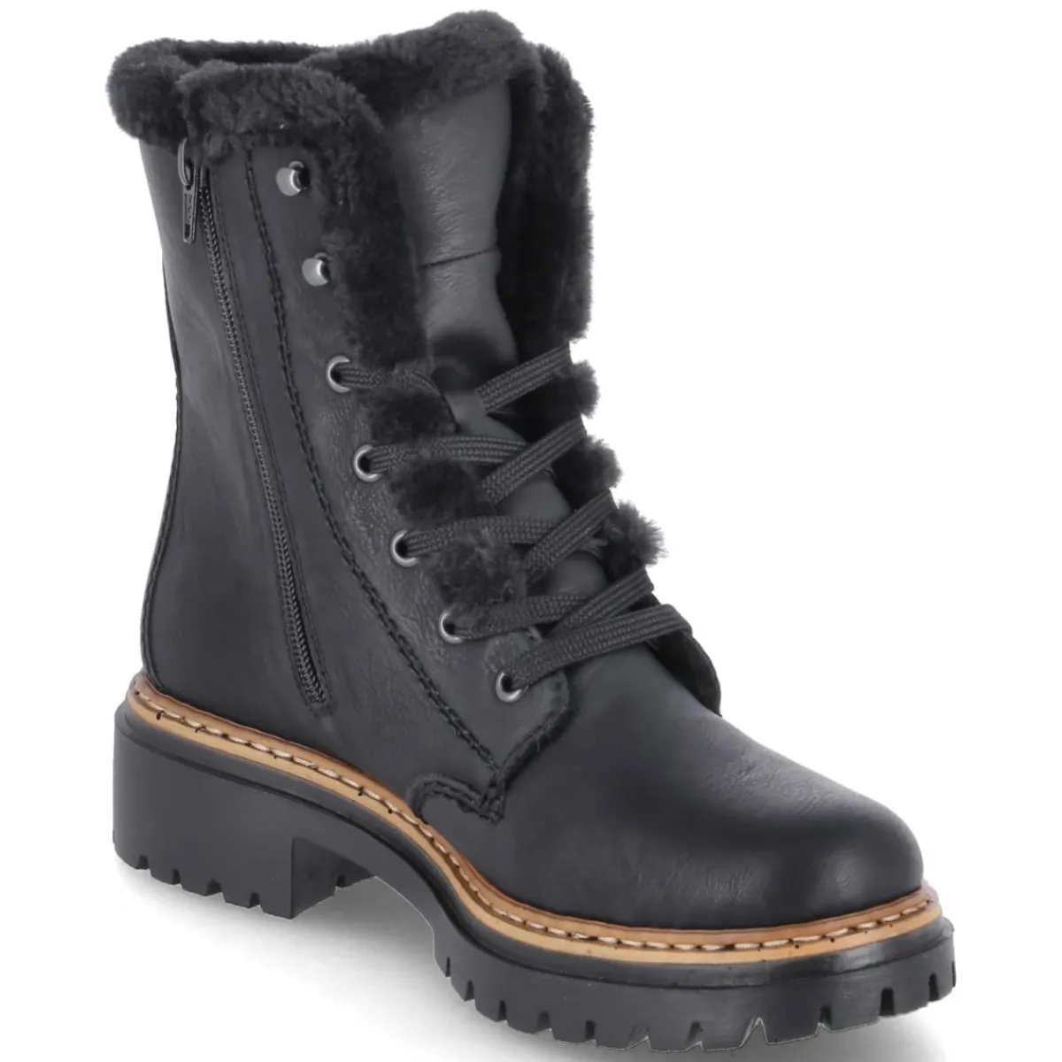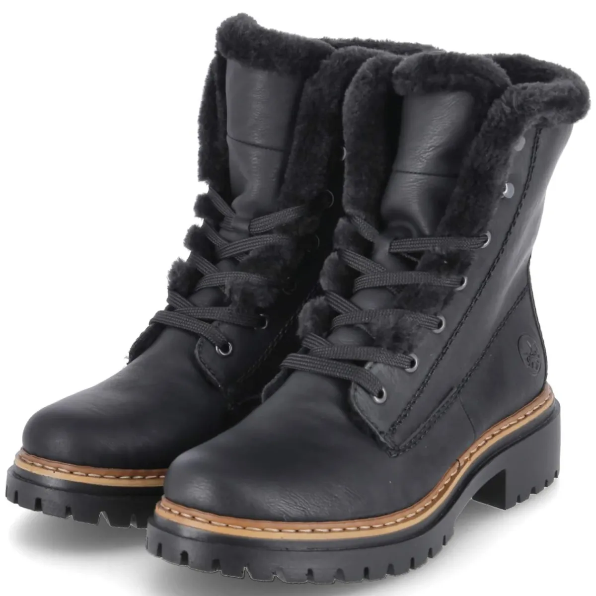 Diese Schnürstiefeletten von Rieker verbinden wintertaugliche Wärme mit alltagstauglicher Eleganz. Das schwarze Synthetik-Obermaterial zeigt sich besonders pflegeleicht und wird von einem weichen Kunstfellkragen akzentuiert. Innen sorgt warmes, softes Textilfutter für behagliches Klima, während die gepolsterte, herausnehmbare Decksohle den Fuß sanft unterstützt und bei Bedarf gegen eigene Einlagen getauscht werden kann. Dank der Kombination aus Schnürung und praktischem Reißverschluss gelingt der Einstieg mühelos und die Passform lässt sich präzise regulieren. Ein 4,5 cm hoher Blockabsatz bietet Stabilität, die runde Spitze schafft Zehenfreiheit und die verstärkte Ferse hält sicher. Die robust vernähte, rutschhemmende Profillaufsohle gibt Halt auf kaltem Untergrund. Der Größenhinweis fällt normal aus. Modetipp: Zu Strickkleid, Wollmantel und Thermo-Strumpfhose entsteht ein warmer City-Look.