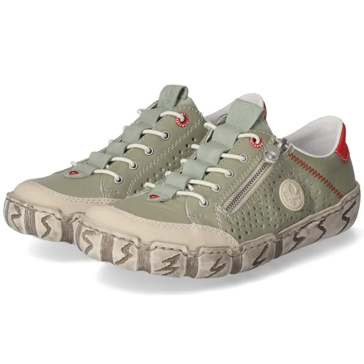 Dieser Rieker Slipper in frischem Grün verbindet Leichtigkeit mit durchdachtem Komfort. Das Obermaterial aus Leder und Synthetik zeigt eine gelochte Struktur mit seitlicher Lochung in beige, die für angenehme Luftzirkulation sorgt und den Look elegant akzentuiert. Ein praktischer Reißverschluss erleichtert das An- und Ausziehen, während ein Elastikband in Schnüroptik die sportive Note unterstreicht. Das geringe Gewicht, der leicht gepolsterte Einstieg und das weich gepolsterte Fußbett mit Decksohle aus Leder bieten entspanntes Gehen über den ganzen Tag. Die flexible Laufsohle im Used Look bringt urbanen Charakter, der verstärkte Zehenbereich und dezente rote Details runden das Design ab. Mit runder Schuhspitze und normaler Passform wird zeitloser Stil alltagstauglich. Modetipp: Zu hellen Leinenhosen und einem cremefarbenen Shirt entsteht ein lässiger Sommer-Look.