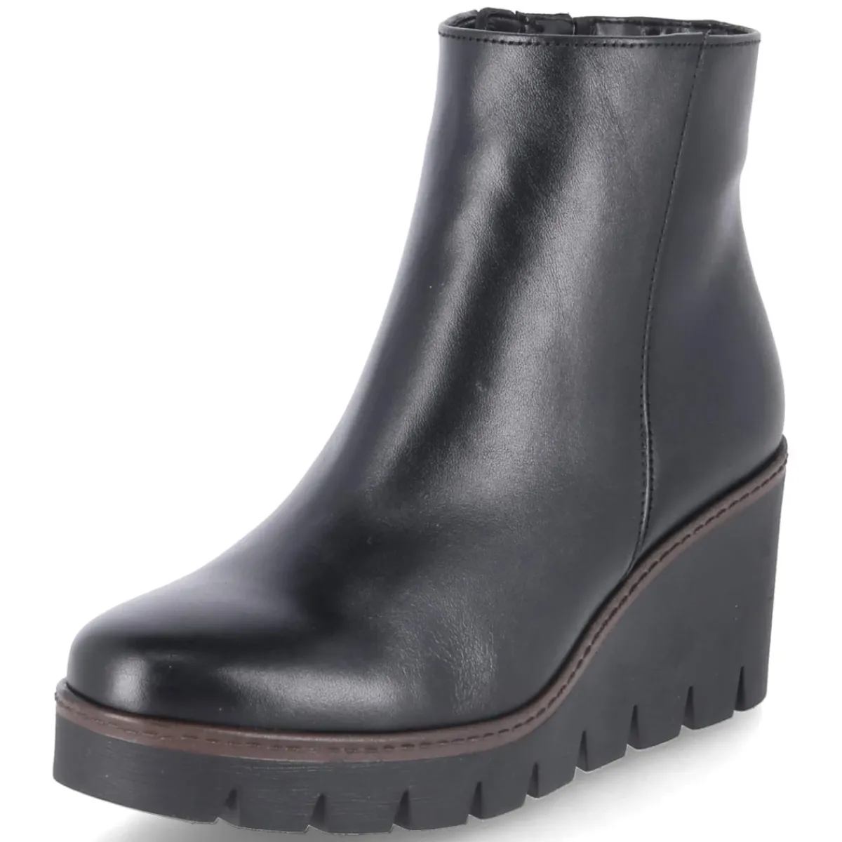 Die schwarzen Gabor-Stiefeletten setzen auf eine zeitlose Silhouette mit 7 cm hohem Keilabsatz, der Höhe und Stabilität vereint. Glattes, langlebiges Echtleder unterstreicht das schlichte Design, die runde Spitze sorgt für ein angenehmes Tragegefühl. Ein bequemer Reißverschlußeinstieg erleichtert den Alltag; ein kleiner, seitlicher Elastikeinsatz am oberen Schaft bietet zusätzliche Flexibilität. Innen überzeugt eine textile Decksohle, das Wechselfußbett lässt sich bei Bedarf austauschen. Die flexible, griffige Laufsohle gibt verlässlichen Halt auf urbanem Terrain. Fällt größengetreu aus und passt zu zahlreichen Anlässen. Modetipp: Harmoniert mit knöchellangen Straight-Jeans und Oversize-Blazer oder mit Feinstrickkleid und blickdichten Strümpfen.
