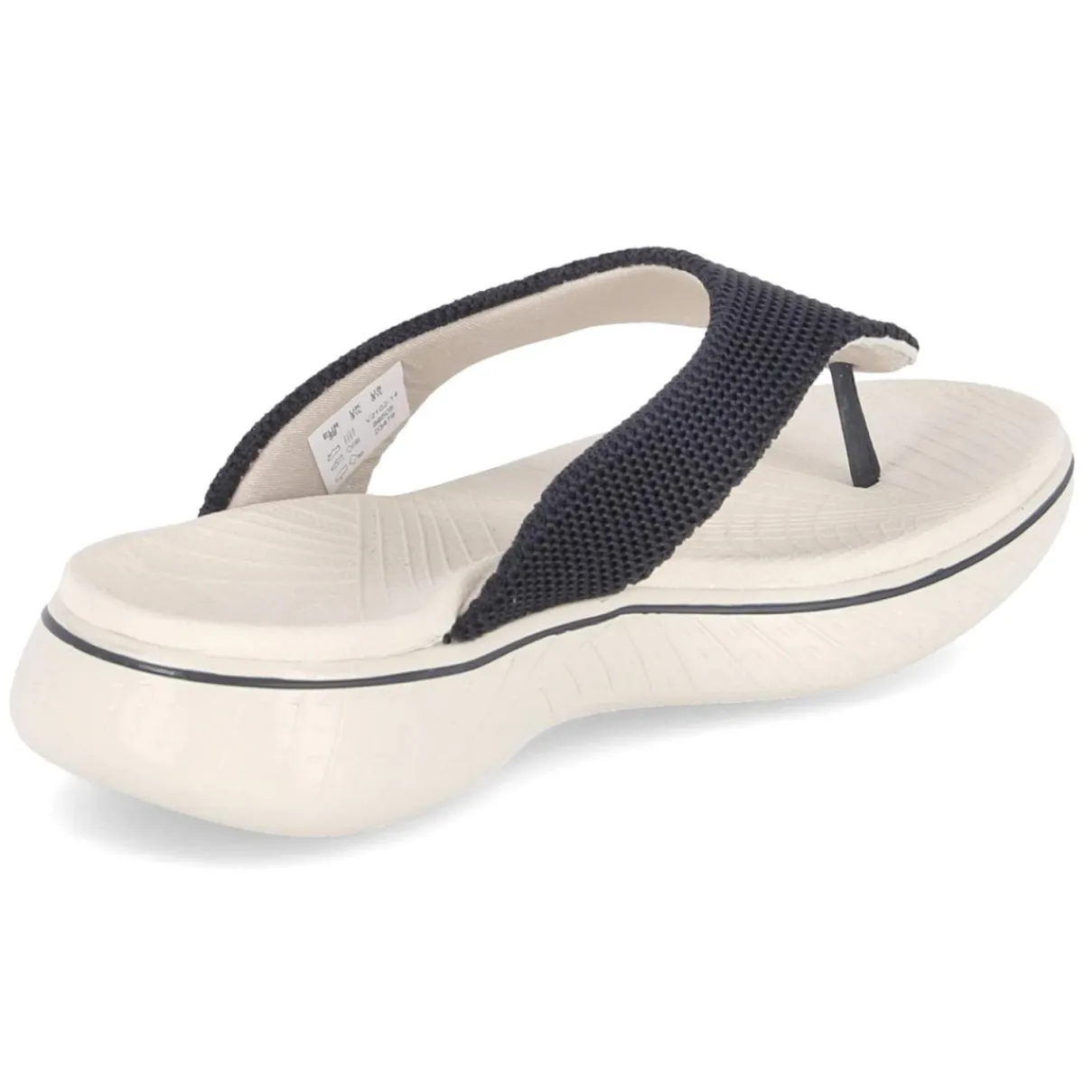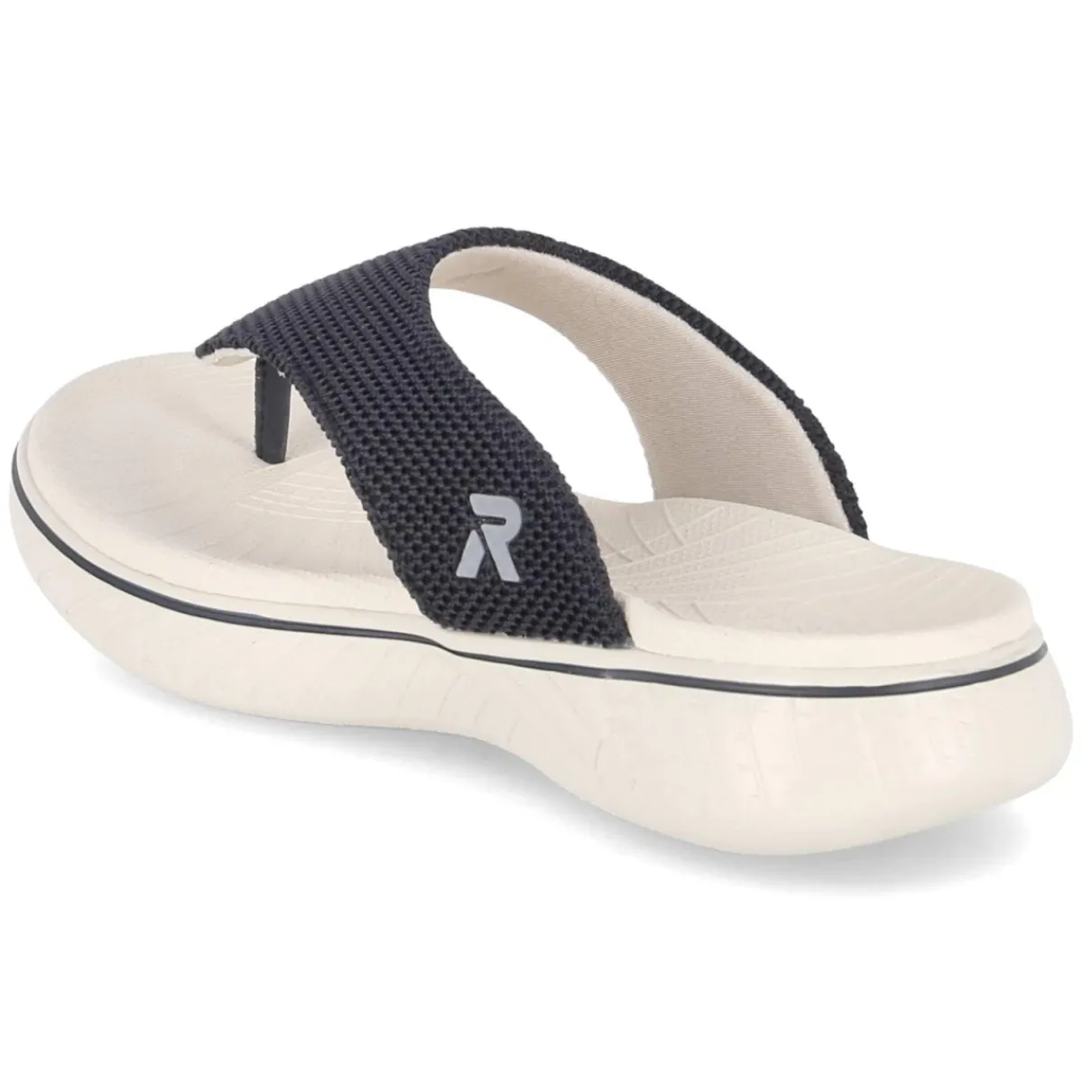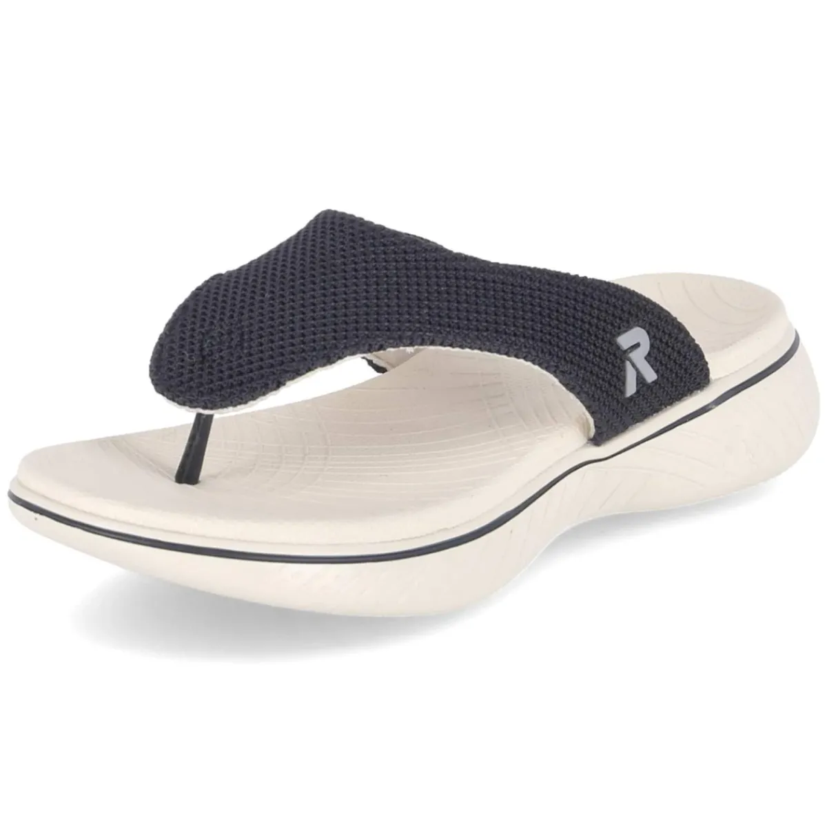 Der Rieker Zehentrenner in Dunkelblau überzeugt mit sportlichem Design und dezenter Feinstrickoptik, die je nach Licht fast Schwarz wirken kann. Das robuste Textilobermaterial sorgt für langlebige Alltagstauglichkeit, während die offene Schuhspitze und der Verschluss ohne Schnallen den sommerlichen Charakter unterstreichen. Ein gepolstertes Fußbett mit Decksohle aus Synthetik bietet weichen Auftritt, das relaxtes Leichtgewicht unterstützt entspanntes Gehen auf langen Wegen. Seitlich setzt ein reflektierendes Logo einen modernen Akzent. Die Passform fällt normal aus und richtet sich an Damen, die einen unkomplizierten Begleiter für City, Strand und Freizeit suchen. Modetipp: Zu luftigen Culottes und einem schlichten Leinenshirt entsteht ein maritimer Look; eine Basttasche und zarter Silberschmuck greifen den kühlen Blauton elegant auf.