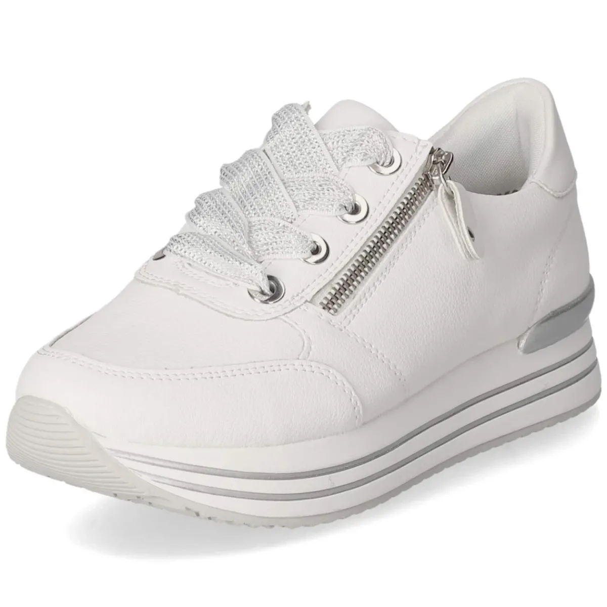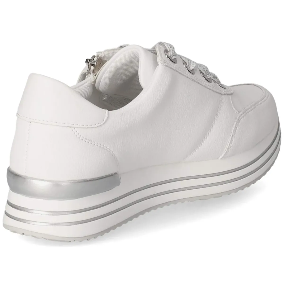 Dieser weiße Halbschuh von Remonte vereint zeitlosen Look mit durchdachtem Komfort. Weiches Glattleder in langlebiger Qualität umschließt den Fuß, die runde Spitze und der verstärkte Zehen- und Fersenbereich sorgen für angenehmen Halt im Alltag. Schnürsenkel und zusätzlicher Reißverschluss ermöglichen ein schnelles An- und Ausziehen sowie individuelle Anpassung. Silberfarbene Akzente setzen dezente Highlights, während der gepolsterte Einstieg und die textile Decksohle ein sanftes Tragegefühl unterstützen. Das gepolsterte Wechselfußbett entlastet bei langen Wegen und lässt sich bei Bedarf gegen eigene Einlagen tauschen. Der Halbschuh fällt normal aus und passt damit verlässlich zur gewohnten Größe. Modetipp: Zu cropped Jeans und einem hellen Strickpullover entsteht ein cleaner City-Look, den ein silbernes Accessoire stilvoll aufgreift.