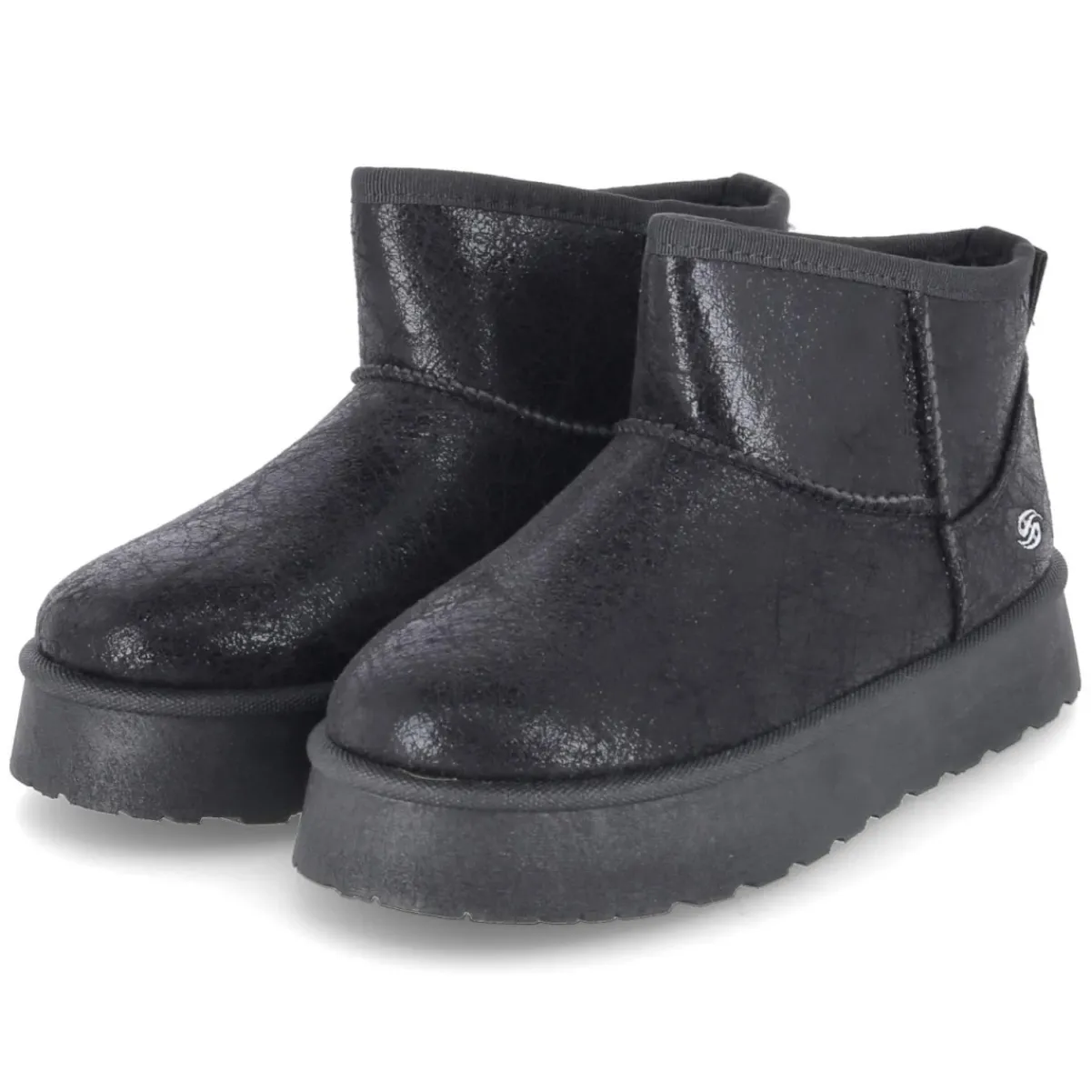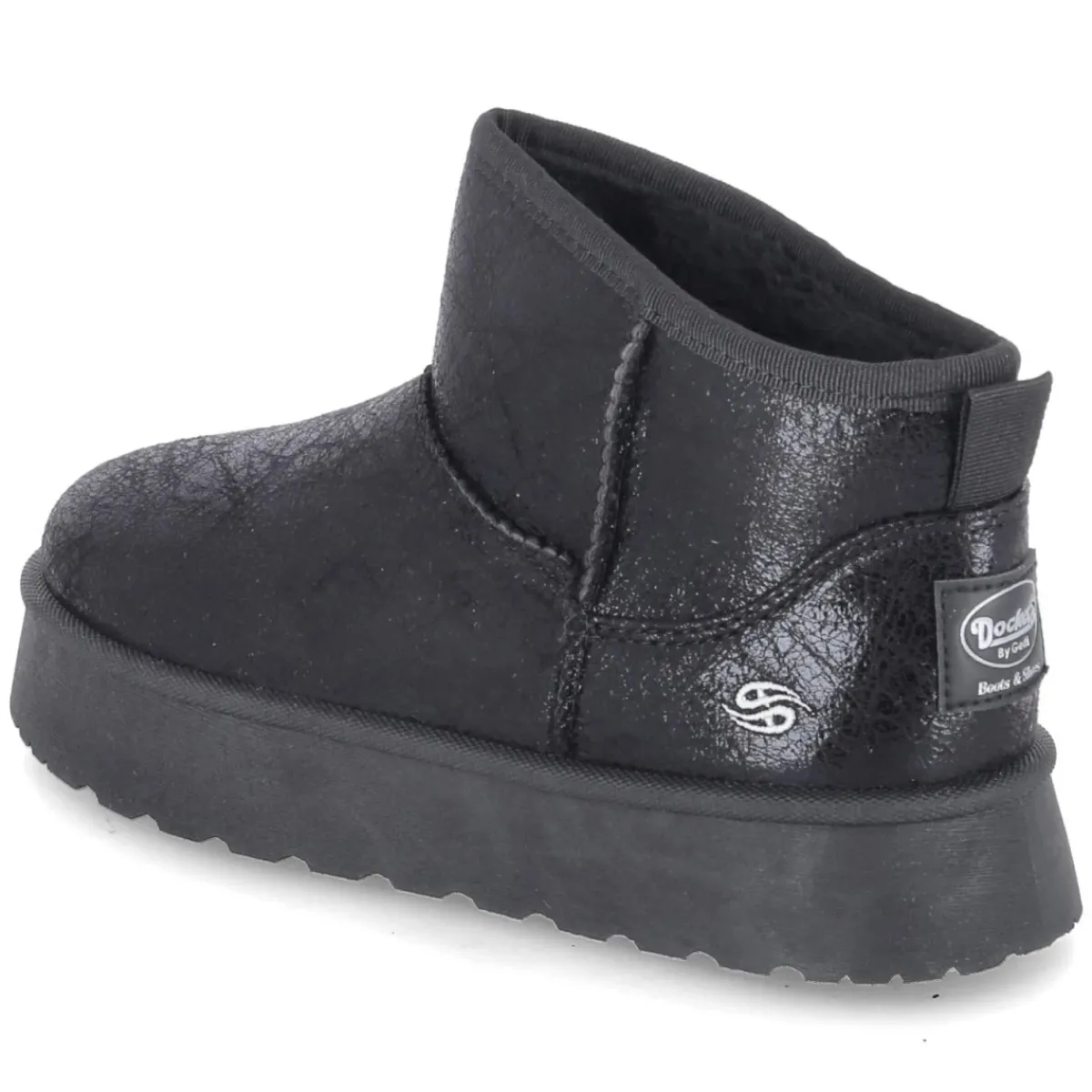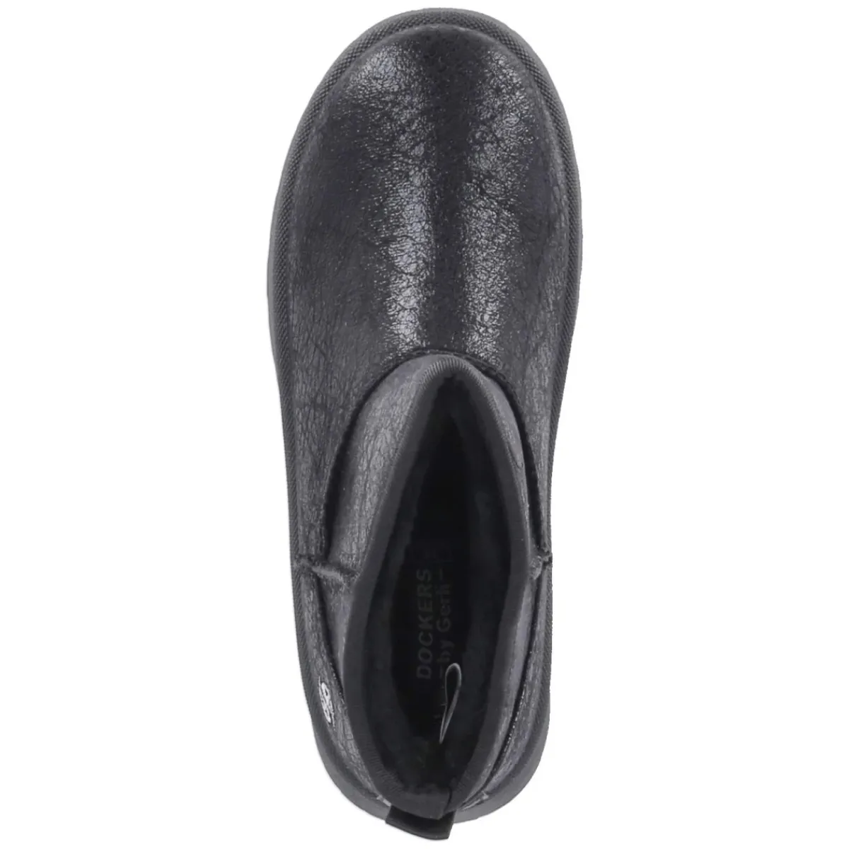 Die Dockers Boots für Kinder verbinden eine elegante Lackoptik mit durchdachtem Komfort für den Alltag. Das schwarze Obermaterial aus Textil glänzt stilvoll und wird von markanten, groben Nähten lässig akzentuiert. Innen sorgt warmes Futter mit weichem Kunstfell für ein behagliches Tragegefühl mit Wohlfühlfaktor, während die textile Decksohle angenehm am Fuß liegt. Die runde Schuhspitze bietet genügend Zehenfreiheit, der 3-cm-Plateauabsatz verleiht eine dezente Höhe und einen sicheren Stand. Ohne Verschluss gestaltet sich der Einstieg unkompliziert – ideal, wenn es morgens schnell gehen muss. Die Passform fällt normal aus und richtet sich gezielt an Kinder. Modetipp: Zu Strumpfhose und Cordrock entsteht ein smarter Look, mit schwarzer Skinny-Jeans und Pufferjacke wirkt das glänzende Finish besonders modern.