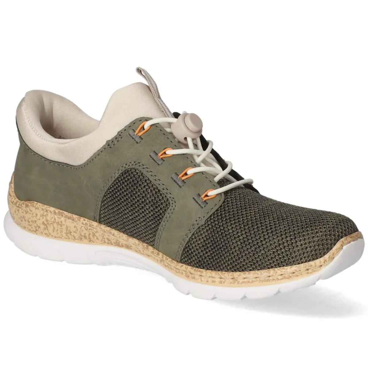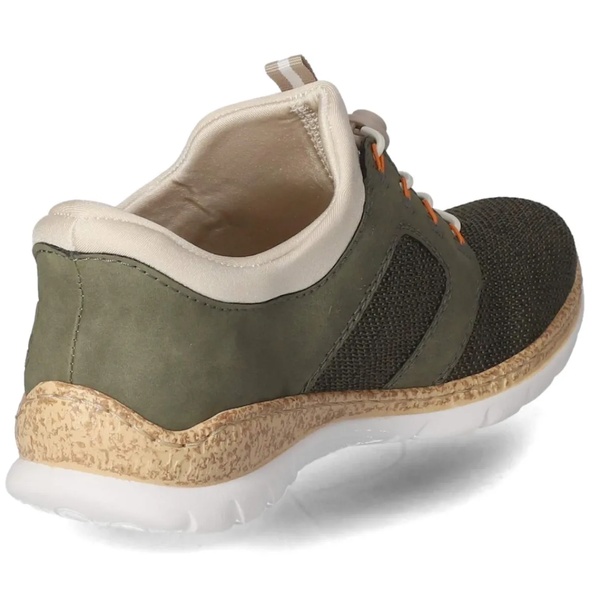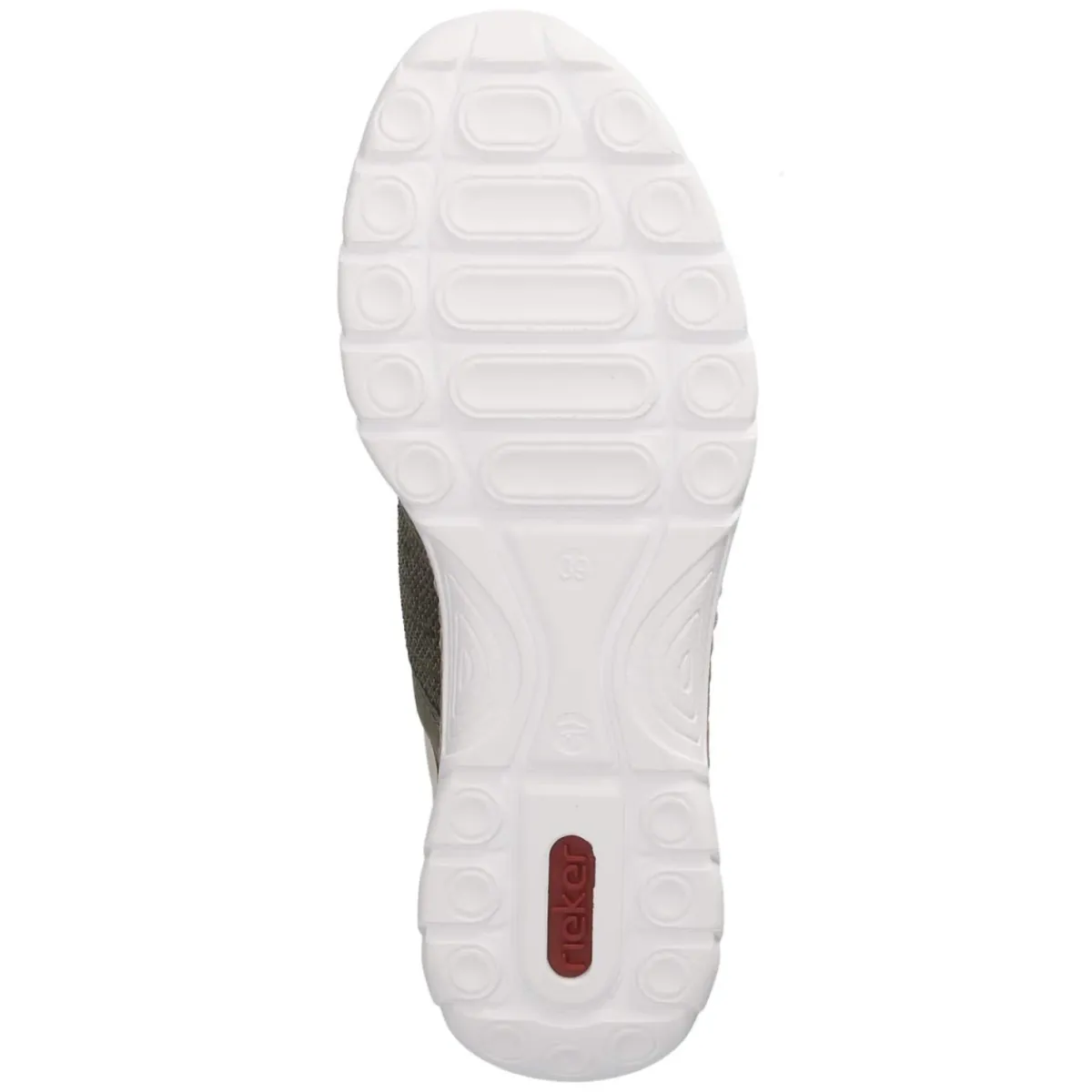 Der Low Sneaker von Rieker in sattem Grün vereint Leichtigkeit und Komfort für entspannte City-Looks. Das leichte Textilobermaterial mit Mesh-Teilen sorgt für angenehme Luftzirkulation, während synthetische Overlays Struktur geben. Ein gepolsterter Einstieg, die textile Decksohle und das weich gepolsterte Fußbett umhüllen den Fuß mit Komfort, die verstärkte Ferse stabilisiert bei jedem Schritt. Dank Schnellverschluss gelingt das An- und Ausziehen mit einem Zug, die Anziehlasche unterstützt zusätzlich. Die flexible Laufsohle und das geringe Gewicht machen den Sneaker zum idealen Begleiter für lange Tage. Mit runder Schuhspitze und lässigem Look passt das Modell zu sportiven wie urbanen Outfits. Der Schuh fällt kleiner aus; je nach Vorliebe empfiehlt sich die Wahl einer größeren Größe. Modetipp: Besonders stimmig wirkt das Grün zu hell gewaschenen Jeans, einem weißen Shirt und einer leichten Utility-Jacke.
