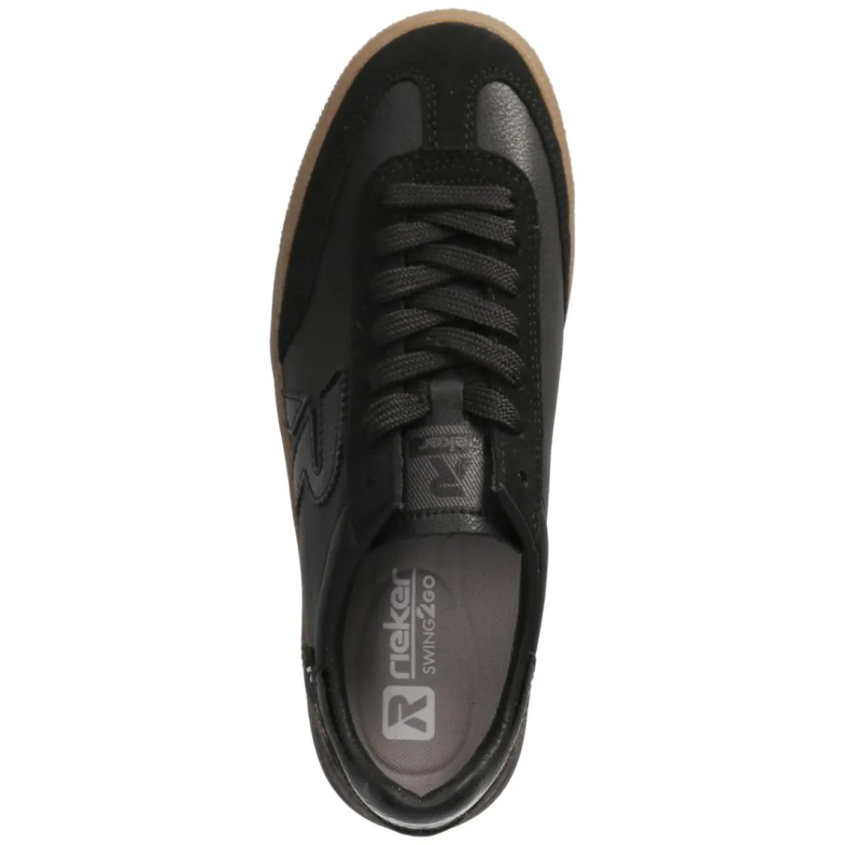 Der Low Sneaker von Rieker vereint feminine Lässigkeit mit durchdachtem Komfort. Atmungsaktives Echtleder schmiegt sich angenehm an den Fuß, die runde Spitze bietet entspannt Platz und der verstärkte Zehen- und Fersenbereich sorgt für Formstabilität im Alltag. Die variable Schnürung ermöglicht eine individuelle Anpassung, während das komfortable, herausnehmbare Wechselfußbett mit textiler Oberfläche den Schritt weich abfedert und sich bei Bedarf austauschen lässt. In klassischem Schwarz bekommt das Modell durch Partien aus Rauleder, glänzendem Lackleder und dezentem Animalprint eine modische Tiefe, die den Look vielseitig macht. Markendetails setzen subtile Akzente. Der Damen-Sneaker fällt größengetreu aus und passt zu vielen Anlässen von Office bis Freizeit. Modetipp: Besonders stimmig wirkt das Design zu Cropped-Jeans und einem strukturierten Blazer.