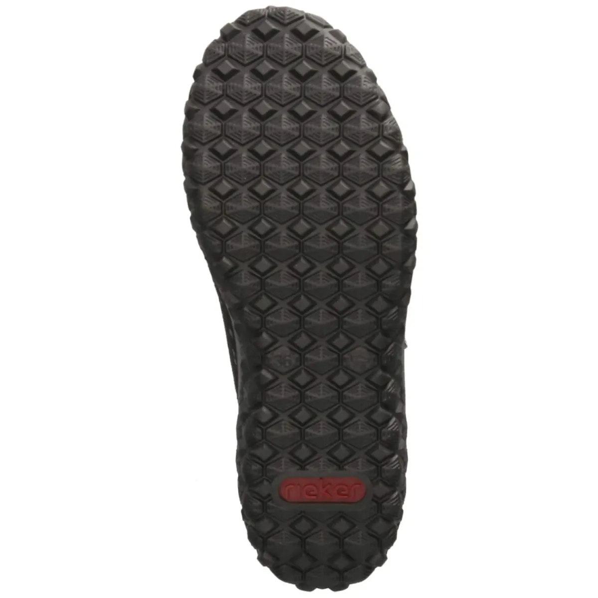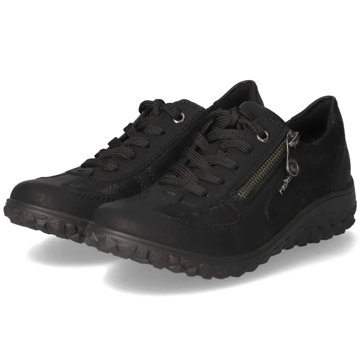 Der Rieker Low Sneaker in Schwarz verknüpft sportliche Leichtigkeit mit urbanem Feinsinn. Das Obermaterial aus Textil und Synthetik zeigt ein leicht schimmerndes Reptilmuster, das von dezenten Akzenten in Silber und markanten Markendetails veredelt wird. Runde Schuhspitze, verstärkter Zehen- und Fersenbereich sowie die flexible, rutschfeste Laufsohle sorgen für verlässlichen Halt im Alltag. Schnürsenkel und zusätzlicher Reißverschluss ermöglichen komfortables An- und Ausziehen, während das komfortable Wechselfußbett mit textiler Decksohle den Tragekomfort individualisierbar macht. Der Größenhinweis fällt normal aus und bietet damit eine sichere Wahl für Alltag, Reise und City. Modetipp: Besonders stimmig zu schmalen Jeans, einem cleanen Blazer und einer Crossbody-Bag – die Silberdetails setzen dabei subtile Highlights.