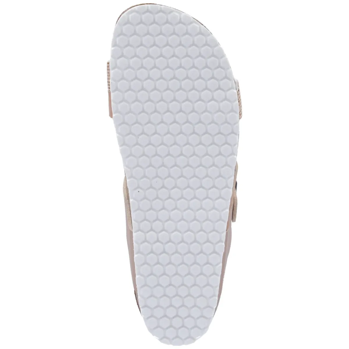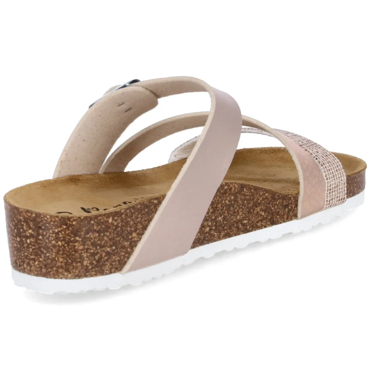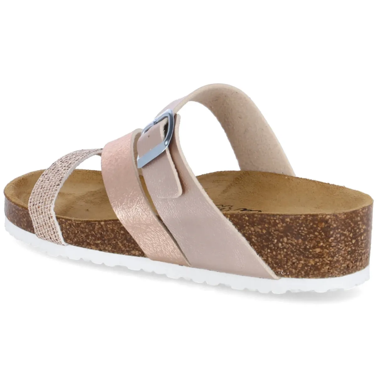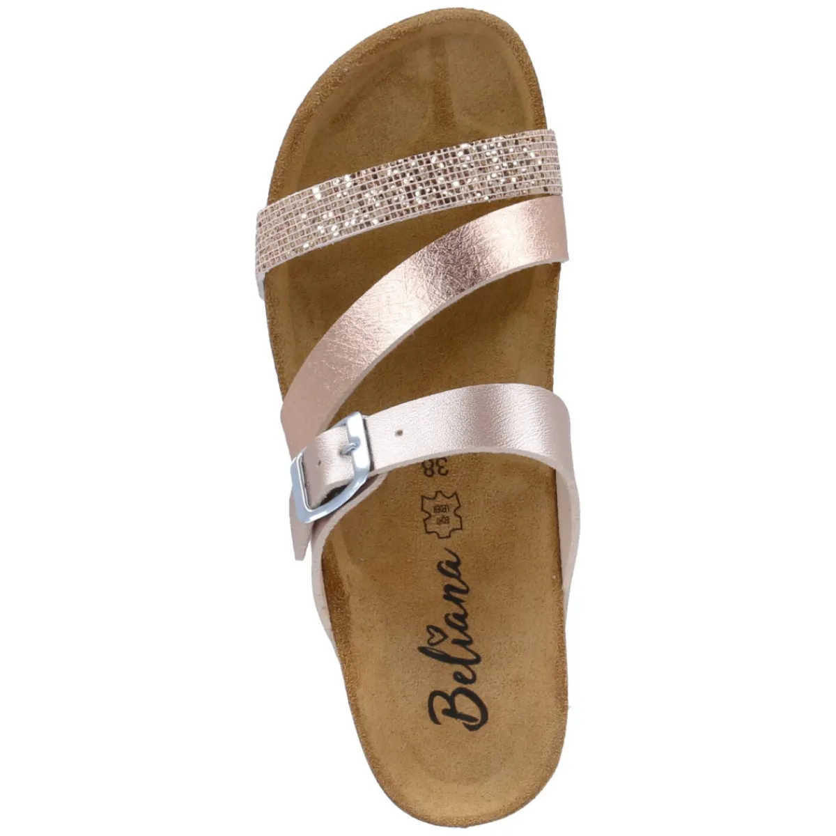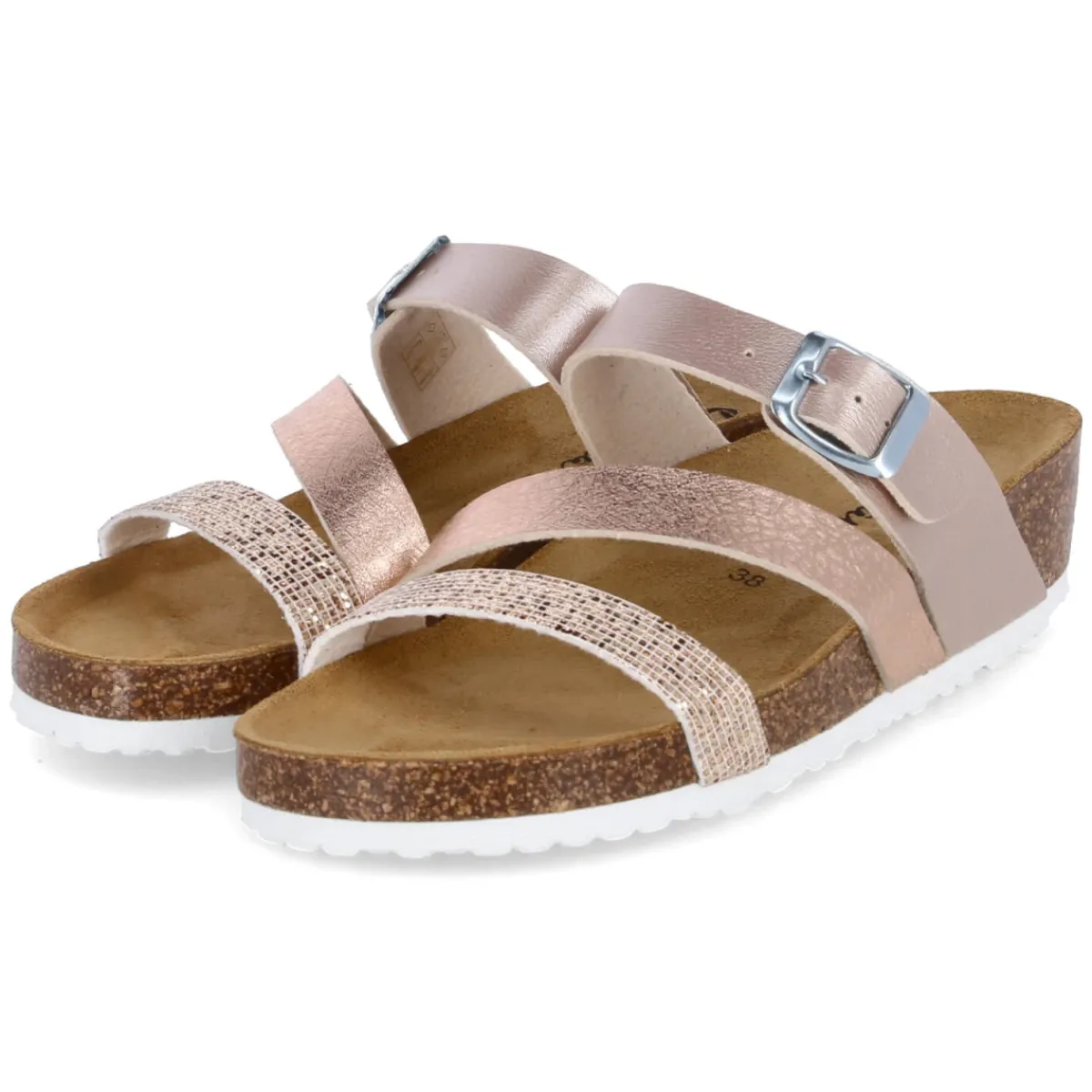 Die Beliana Pantoletten verbinden eleganten Glanz mit hohem Tragekomfort. Das in Bronze-Gold schimmernde Obermaterial aus Synthetik setzt einen edlen Akzent, während die offene Schuhspitze und die verstellbare Schnalle für luftigen Sitz und individuelle Passform sorgen. Eine hautfreundliche Lederdecksohle trifft auf ein vorgeformtes, weiches Kork-Tieffußbett mit Lederbezug, das den Fuß sanft stützt und ein angenehmes Laufgefühl vermittelt. Die profilierte EVA-Laufsohle bietet leichte Dämpfung und sicheren Grip auf verschiedensten Untergründen. Dank der guten Kombinationsmöglichkeiten wird dieser Stil schnell zum Favoriten für viele Anlässe, von entspannten City-Looks bis hin zu sommerlichen Office-Outfits. Der Größenhinweis fällt normal aus und erleichtert die Wahl. Modetipp: Zu fließender Seidenbluse und Culottes in Creme kommt der bronzefarbene Schimmer besonders gut zur Geltung, feiner Goldschmuck rundet das Ensemble harmonisch ab.