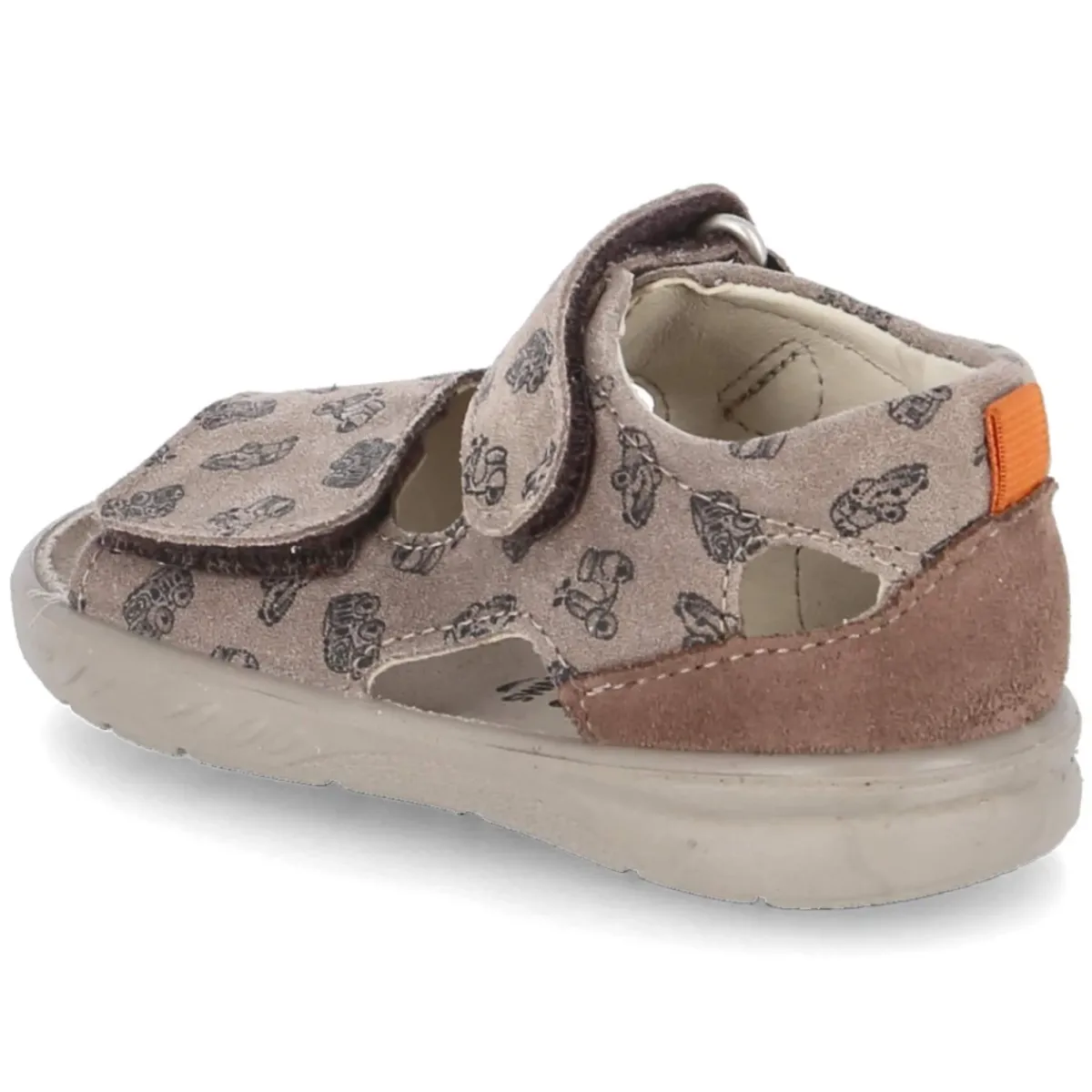 Die Sandale BANU von Pepino vereint langlebiges Echtleder mit kindgerechtem Komfort. Weiches Rauleder in warmem Braun schmiegt sich an den Fuß, während die hautfreundliche Lederdecksohle ein angenehmes Klima bewahrt. Zwei praktische Klettverschlüsse erleichtern das Hineinschlüpfen und sorgen für einen sicheren, individuell regulierbaren Sitz. Der verspielte Print mit verschiedenen Fahrzeugen setzt einen fröhlichen Akzent, der Kleinkindern Freude macht. Eine verstärkte Ferse und ein gepolsterter Einstieg bieten Halt und Bequemlichkeit bei jedem Schritt. Die offene Schuhspitze und die flexible, rutschhemmende Laufsohle unterstützen natürliche Bewegungen auf wechselndem Untergrund. Dank normaler Passform fällt die Größenwahl leicht, sodass der Alltag unbeschwert starten kann. Modetipp: Zu Leinen-Shorts und gestreiftem T-Shirt entsteht ein sommerlicher Look, den ein braunes Cap oder ein leichter Sonnenhut harmonisch ergänzt.