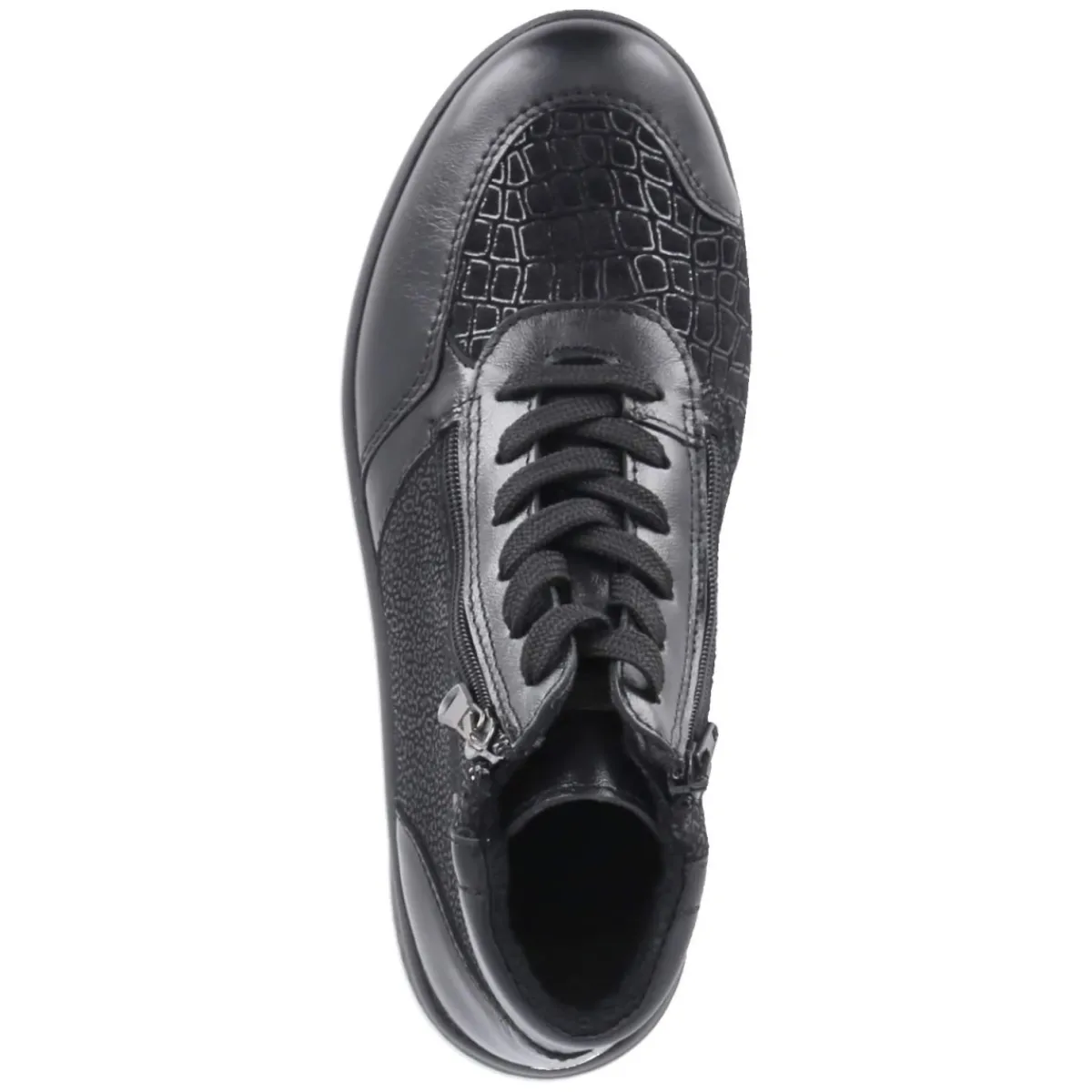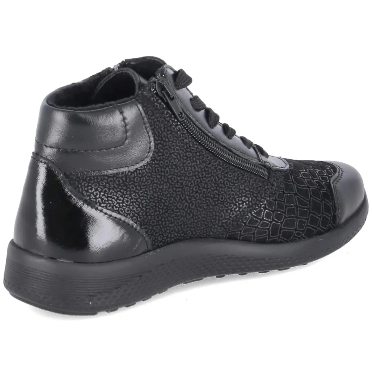 Die Schnürboots KIRA 24 von Beliana verbinden urbanes Design mit Alltagstauglichkeit. Der Material-Mix aus Leder und Textil zeigt sich in tiefem Schwarz, partiell mit feiner Reptilprägung, die dem robusten Look eine elegante Note verleiht. Runde Schuhspitzen und der gepolsterte Einstieg sorgen für angenehmen Platz und Komfort, während praktische Reißverschlüsse das An- und Ausziehen erleichtern. Ein leichtes Futter wärmt an kühlen Tagen, die flexible, rutschfeste Laufsohle gibt Halt auf wechselnden Untergründen. Verstärkte Zehen- und Fersenbereiche erhöhen die Langlebigkeit, das Wechselfußbett bietet Individualität beim Tragen. Mit normal ausfallender Passform ideal für den täglichen Einsatz in der Stadt. Modetipp: Zu cropped Straight-Jeans, Feinstrick und Wollmantel entsteht ein cleaner City-Look mit subtiler Edge.