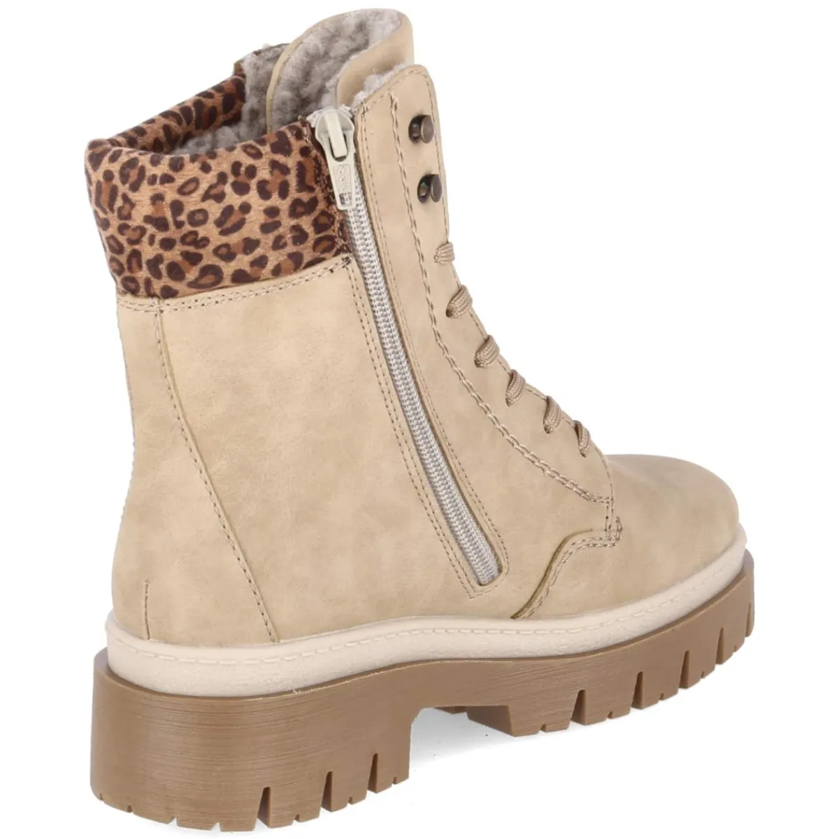 Diese Rieker Schnürstiefeletten verbinden urbane Lässigkeit mit zuverlässiger Funktion. Das beige Obermaterial aus Kunstleder harmoniert mit der runden Spitze und dem 5 cm hohen Blockabsatz, der einen stabilen Auftritt ermöglicht. Wasserfest und zugleich atmungsaktiv, schützt der Schuh an nassen Tagen und sorgt für ein angenehmes Fußklima. Warmes Teddyfutter verwöhnt an kalten Tagen, während der gepolsterte Einstieg im Leopardenlook einen modischen Akzent setzt. Der unkomplizierte Einstieg gelingt dank seitlichem Reißverschluss, die Schnürung optimiert die Passform. Ein textiles, gepolstertes Wechselfußbett steigert den Komfort, die verstärkte Ferse und die flexible, rutschfeste Profilsohle bieten Halt. Fällt normal aus. Modetipp: Zu Straight-Leg-Jeans, cremefarbenem Strickpullover und sandfarbenem Steppmantel entsteht ein zeitloser City-Look; das Leoparden-Detail greift Accessoires mit Animal-Print stilsicher auf.