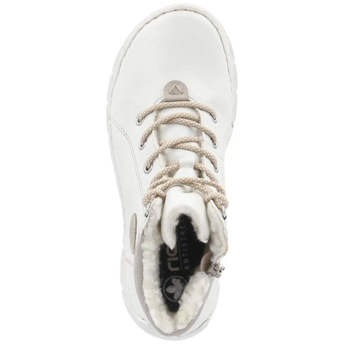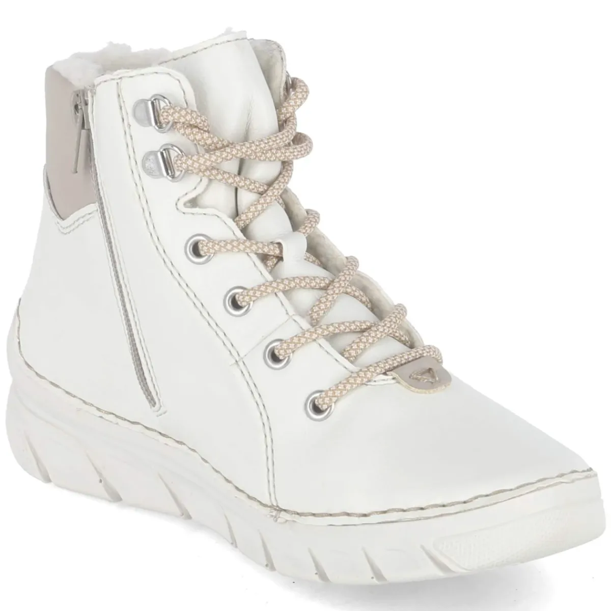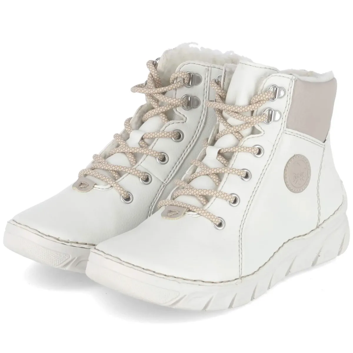 Rieker Schnürstiefeletten in Weiß verbinden winterliche Wärme mit urbaner Leichtigkeit. Das robuste Obermaterial aus Kunstleder zeigt sich angenehm pflegeleicht und behält auch im Alltag mühelos eine gepflegte Optik. Innen sorgt ein kuscheliges Warmfutter gemeinsam mit einer textilen Decksohle und einem weichen Fußbett für behaglichen Komfort, während der gepolsterte Einstieg Druckstellen mindert. Die Kombination aus Schnürung und praktischem Reißverschluss erleichtert das An- und Ausziehen, unterstützt von Anziehlasche und rund zulaufender Spitze. Verstärkte Partien an Ferse und Zehen geben zusätzliche Stabilität, das relaxt leichte Design schont die Füße auf langen Wegen. Der Schnitt fällt normal aus und passt verlässlich zu Damenfüßen. Modetipp: Für einen cleanen Winter-Look mit Strickkleid in Creme und grober Strumpfhose kombinieren, dazu ein Wollmantel in Karamell.
