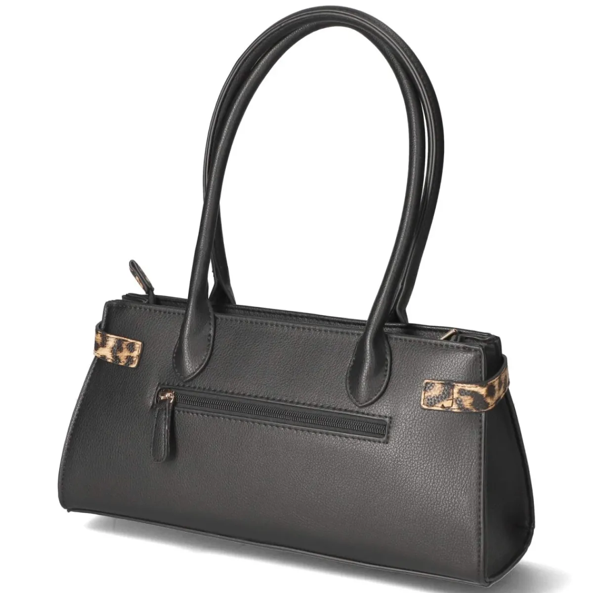 Diese Schultertasche in tiefem Schwarz verbindet klare Linien mit durchdachter Einteilung. Mit Maßen von ca. 15 x 32 x 9 cm und einem Volumen von etwa 4 Litern bietet sie Platz für Alltagsessentials, bleibt aber angenehm kompakt. Zwei feste Schulterriemen sorgen für klassischen Tragekomfort, während ein abnehmbarer, längenverstellbarer Schulterriemen (ca. 140 cm) den lässigen Crossbody-Look ermöglicht. Der verstärkte Boden hält die Form, ein Reißverschlussfach auf der Rückseite sichert Kleinigkeiten. Das Reißverschlusshauptfach ist innen mit Steckfach und weiterem Reißverschlussfach organisiert. Ein verstellbarer Zierriemen mit Leopardprint setzt einen markanten Akzent und verleiht dem Design Dynamik. Modetipp: Zu monochromen Outfits kombinieren und den Animalprint mit Schuhen oder Haarband subtil wieder aufnehmen.