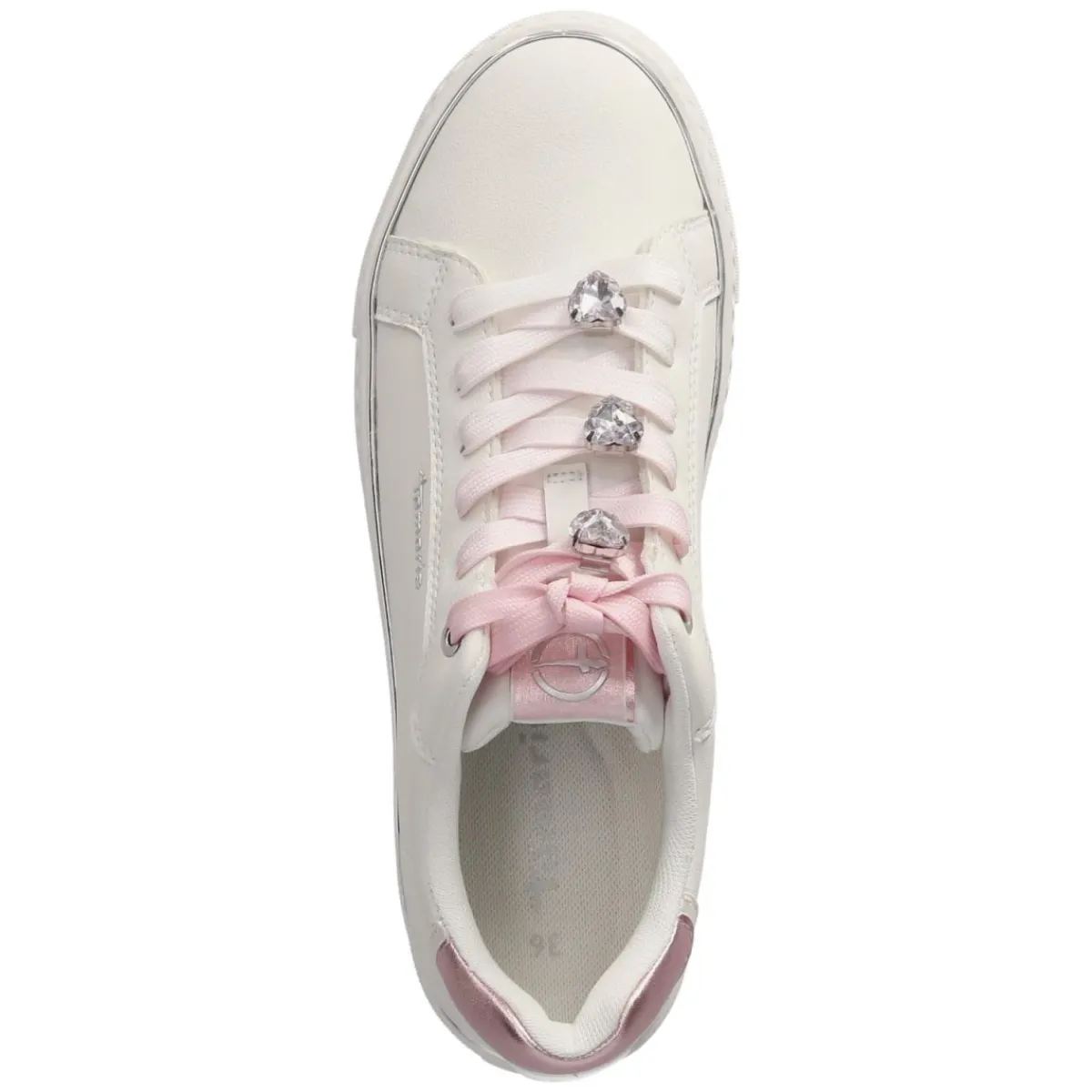 Der Sneaker Low von Tamaris verbindet sportliche Leichtigkeit mit liebevoller Detailverliebtheit. Das weiße Obermaterial aus Synthetik erhält durch rosafarbene Akzente und drei herzförmige Schmucksteine eine feminine Note, während die runde Spitze und der 3,5 cm hohe Plateau-Absatz eine moderne Silhouette formen. Vegane Materialien und eine textile Decksohle treffen auf ein gepolstertes, herausnehmbares Wechselfußbett, das gemeinsam mit der flexiblen, rutschhemmenden Laufsohle entspannten Tragekomfort im Alltag bietet. Eine verstärkte Ferse und markante Markendetails runden das Design ab. Dank klassischer Schnürung lässt sich die Passform präzise regulieren, der Größenhinweis fällt normal aus. Modetipp: Für einen frischen Look mit weißem Denim und pastellfarbenen Accessoires kombinieren oder als zarter Kontrast zu einem floralen Midikleid tragen.