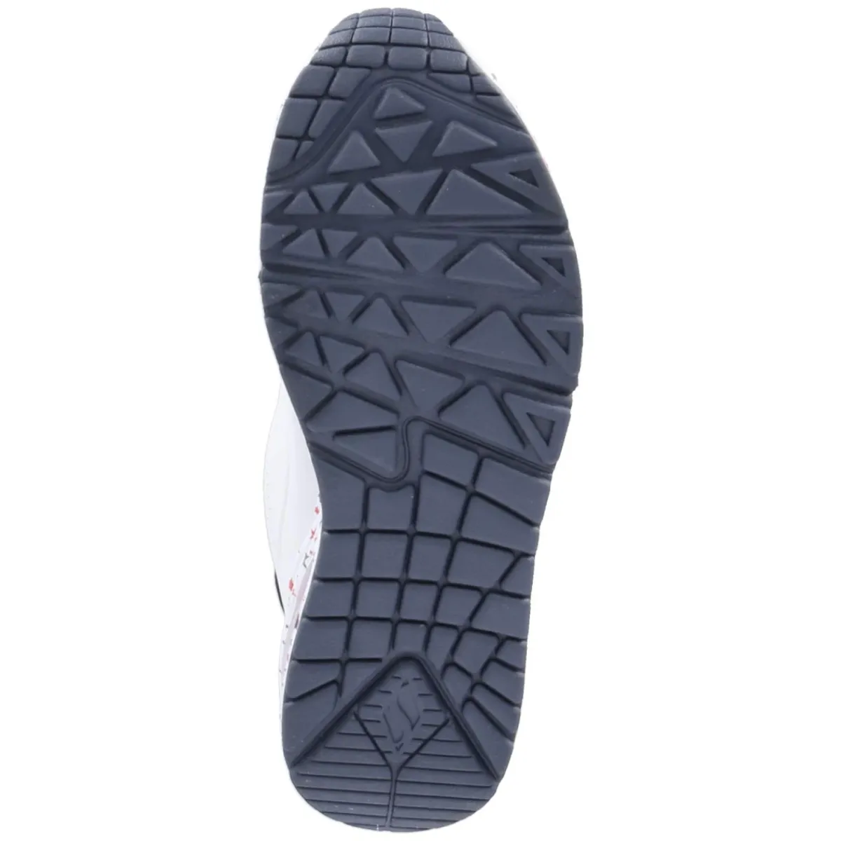 Der Skechers Sneaker UNO-FREE STRYDE vereint cleanes Design mit hohem Tragekomfort. Die moderne Optik in strahlendem Weiß wird von dynamischen Prägungen und feiner Lochung im Zehenbereich belebt. Dank elastischem Band in Schnüroptik gelingt der unkomplizierte Einstieg, während der gepolsterte Schaftrand sanft umschließt. Die beste Memory-Foam-Fußbettung passt sich dem Fuß an und sorgt gemeinsam mit der flexiblen, rutschfesten Laufsohle mit markantem Sternenrand und Sichtfenster für angenehme Dämpfung im Alltag. Das pflegeleichte Synthetik-Obermaterial lässt sich leicht reinigen, die Passform fällt normal aus, die runde Spitze gibt Zehenfreiheit. Ein vielseitiger Begleiter für City, Büro und Freizeit, der Funktion und Stil verbindet. Modetipp: Monochrom gestylt mit weißer Wide-Leg-Jeans und cremefarbenem Stricktop entsteht ein frischer Ton-in-Ton-Look; ein strukturiertes Blazer-Update setzt einen edlen Kontrast.