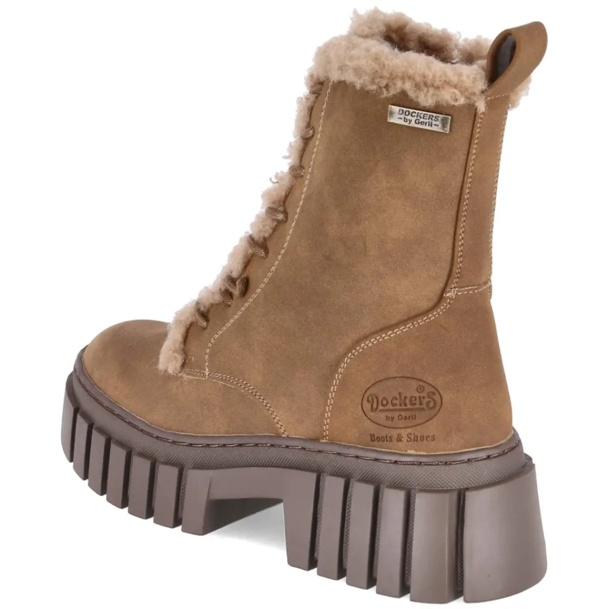 Die braunen Dockers Stiefeletten vereinen urbane Modernität mit funktionalem Komfort. Ein robustes Obermaterial aus Synthetik sorgt für eine pflegeleichte Oberfläche, während warmes Fleecefutter mit Teddyplüsch-Details angenehme Wärme an kühlen Tagen schenkt. Der rund zulaufende Leisten und die textile Decksohle bieten bequemen Halt. Schnürsenkel und seitlicher Reißverschluss erleichtern das An- und Ausziehen, unterstützt von einer praktischen Anziehlasche. Der 6 cm hohe Blockabsatz harmoniert mit der rutschfesten Profilsohle, deren vorderes Plateau von ca. 3 cm sicheren Stand und eine moderne Silhouette begünstigt. Ein verstärkter Fersenbereich erhöht die Stabilität im Alltag. Modetipp: Besonders stimmig wirkt das Modell zu geraden Jeans in Dunkelblau und einem Wollmantel in Camel; dazu ein Strickpullover in Creme, um die warmen Braunnuancen elegant aufzugreifen.
