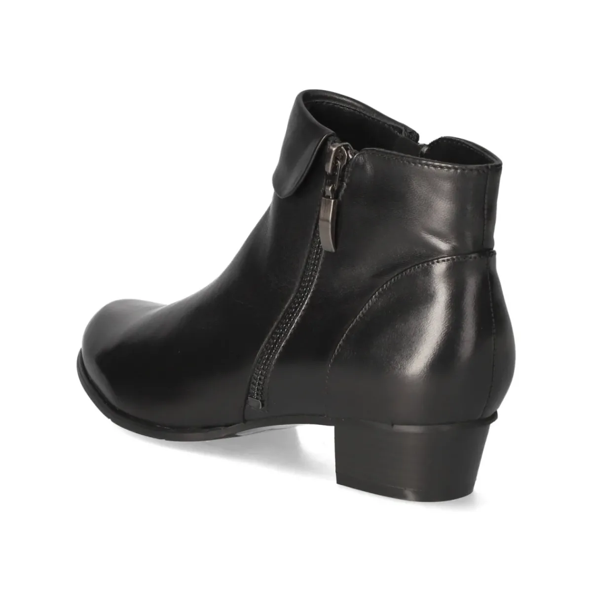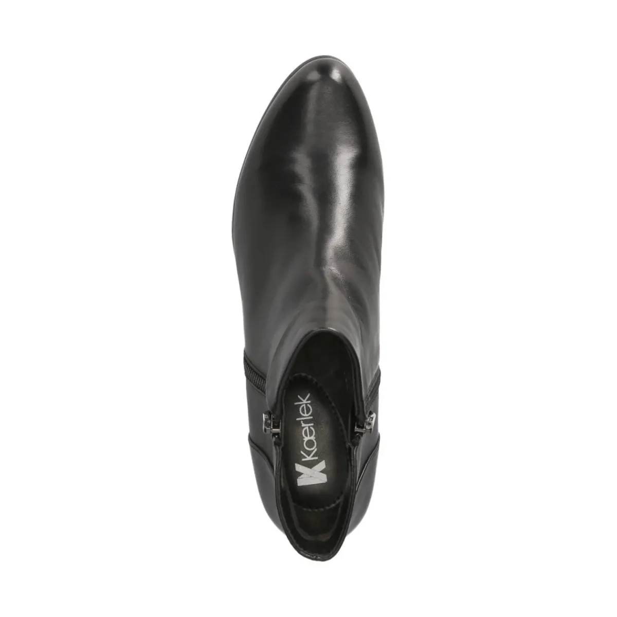 Die Kaerlek Stiefeletten setzen auf zeitlose Eleganz in tiefem Schwarz und überzeugen mit einem Obermaterial aus langlebigem Echtleder. Das weiche Textilfutter mit Warmfutter-Effekt sorgt selbst an kühlen Tagen für ein angenehmes Klima, während die Decksohle aus Leder-Textil den Fuß atmungsaktiv umschließt. Ein rund geformter Leisten schafft Zehenfreiheit, das leicht gepolsterte Fußbett erhöht den Komfort im Alltag. Der seitliche Reißverschluss ermöglicht einen bequemen Einstieg, die verstärkte Ferse gibt Stabilität, und die flexible, rutschhemmende Profilsohle bietet sicheren Halt auf verschiedenem Untergrund. Mit stabilem 3‑cm-Absatz und normaler Passform wird ein zuverlässiger Begleiter für viele Anlässe geboten. Modetipp: Besonders stimmig wirken die Stiefeletten zu geradem Wollmantel und Cropped-Jeans, ergänzt um eine feine Lederhandtasche für einen cleanen City-Look.