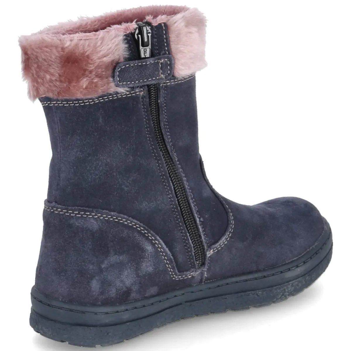 Der Winterstiefel VESNA von Lurchi begleitet kleine Entdeckerinnen und Entdecker sicher durch kalte Tage. Das Obermaterial aus Leder und Textil in sattem Blau trifft auf warmes Fleecefutter mit leichtem Charakter – ideal für kühle Temperaturen, ohne zu beschweren. Dank wasserfester Verarbeitung mit wasserabweisender Ausrüstung und atmungsaktiver Konstruktion bleibt das Klima im Schuh angenehm, während der rund geschnittene Vorderfuß genügend Zehenfreiheit bietet. Der bequeme Reißverschlusseinstieg vereinfacht das An- und Ausziehen, ein verstärkter Fersenbereich sorgt für Stabilität. Die flexible, vernähte Cupsohle greift rutschhemmend auf glatten Wegen. Ziernähte, ein glitzernder Stern am Schaft und der rosa Kunstfellkragen setzen verspielte Akzente. Die Passform fällt normal aus. Modetipp: Besonders harmonisch wirkt das Modell zu einer navyfarbenen Steppjacke, Strickmütze mit Bommel und einer Thermostrumpfhose in Rosé.