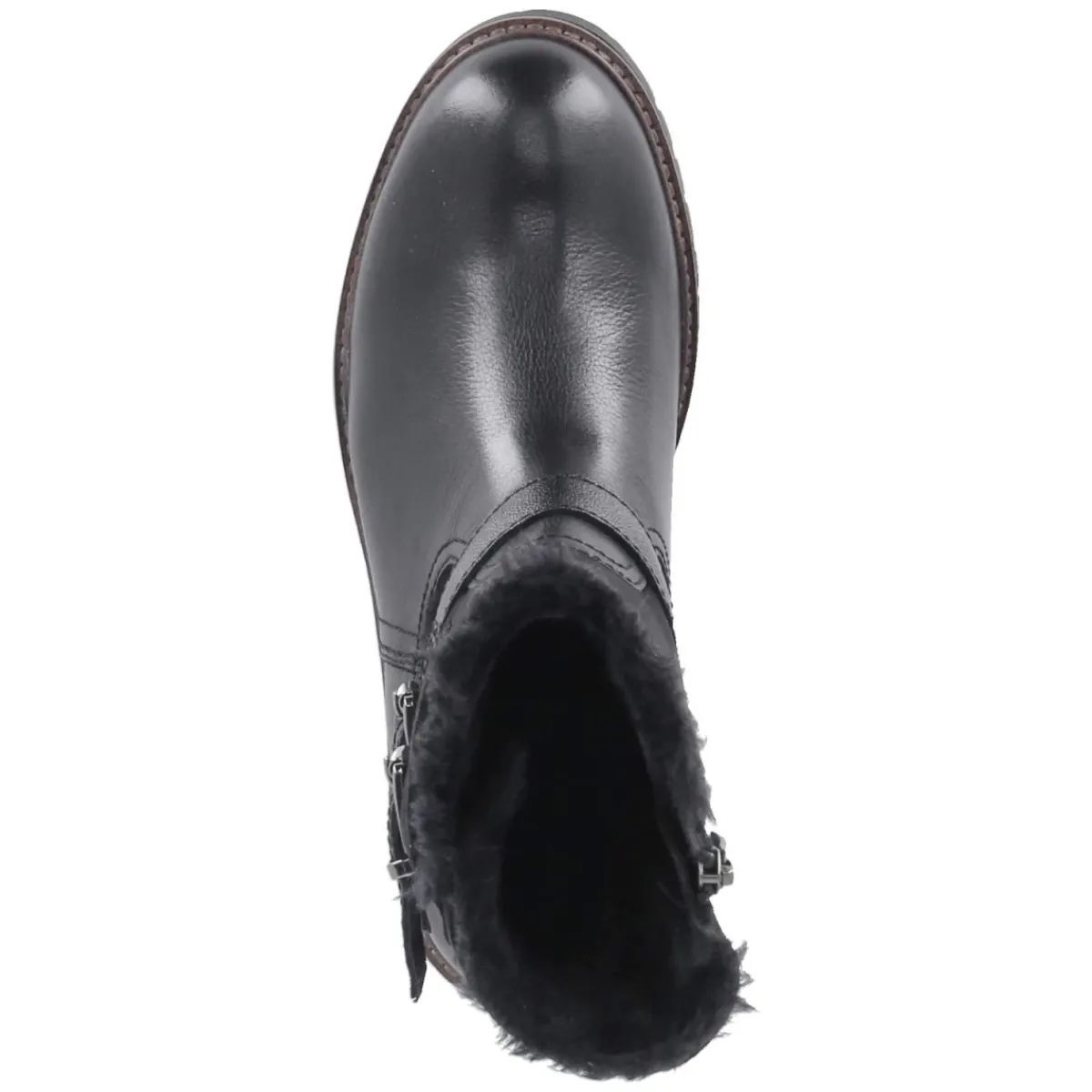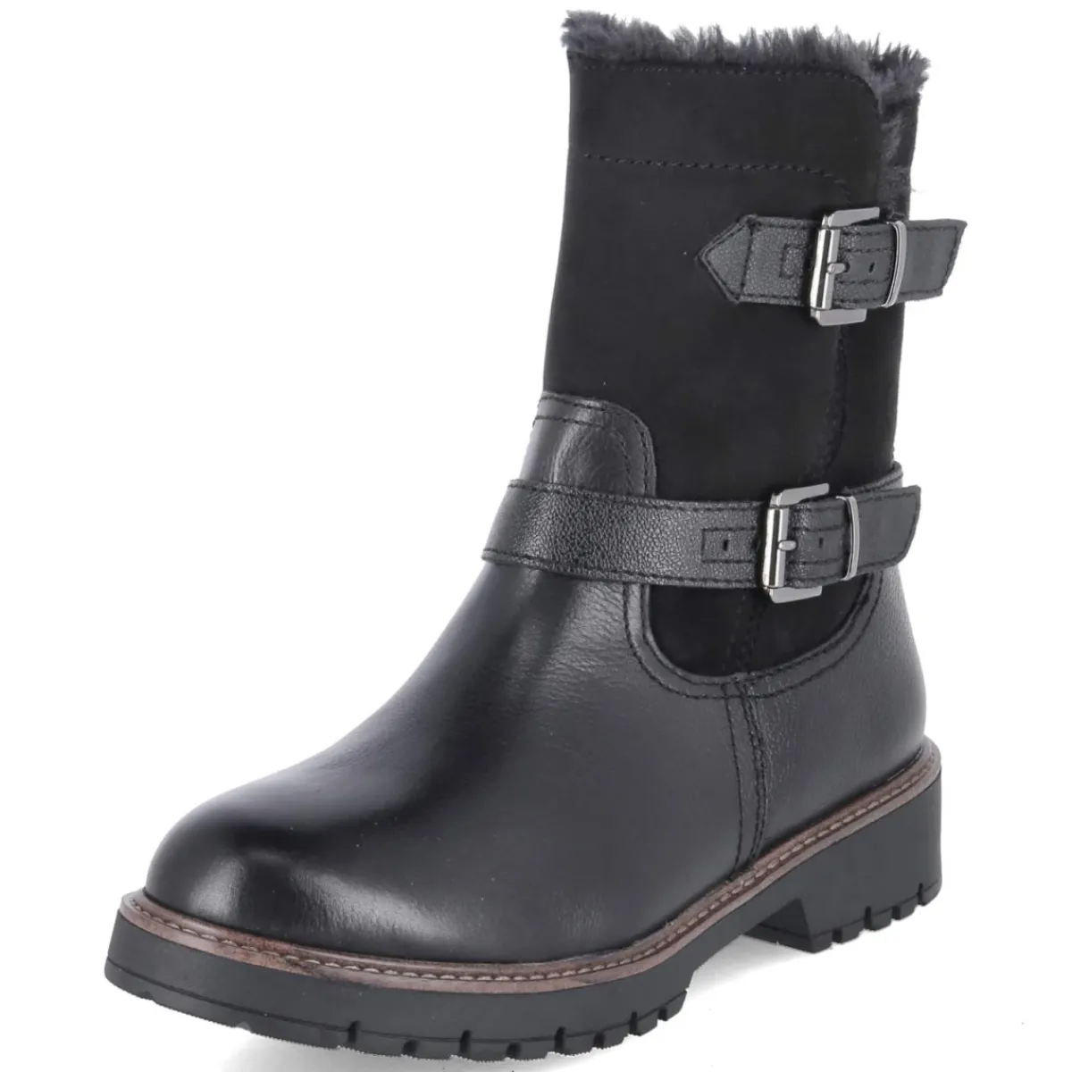 Die Tamaris Winterstiefeletten setzen auf einen modernen Material-Mix aus Synthetik, Leder und Textil und kommen in zeitlosem Schwarz. Das warme Futter umschließt den Fuß angenehm, unterstützt von einer weichen, textilen Decksohle. Ein komfortabler Reißverschluss ermöglicht den schnellen Einstieg, während zwei verstellbare Riemen am samtig-weichen Schaft für individuellen Halt sorgen. Die verstärkte Ferse und die flexible, rutschfeste Profilsohle geben Sicherheit auf glatten Wegen. Mit rund gearbeiteter Spitze, normaler Passform und 4 cm hohem Blockabsatz bleibt der Look feminin und zugleich alltagstauglich. Der Schaft misst ca. 17 cm in der Höhe bei ca. 30 cm Umfang. Modetipp: Besonders stimmig wirkt das Modell zu einer gestrickten Midi-Rippe, dicker Strumpfhose und Wollmantel; für lässige Tage punkten gekrempelte Straight-Jeans und ein voluminöser Steppparka.