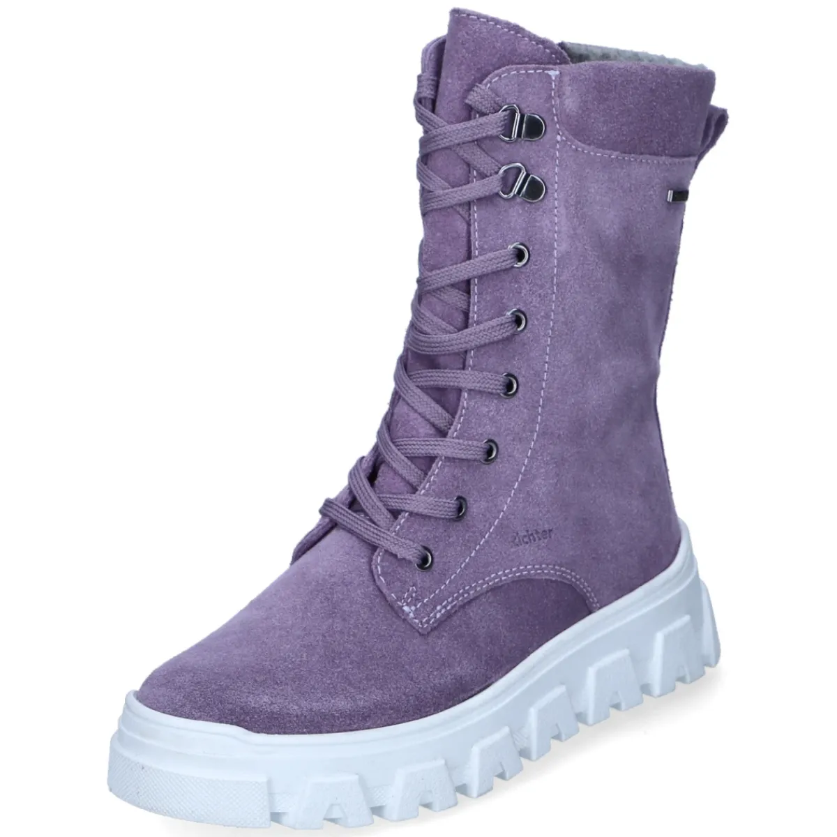 Diese Winterstiefeletten von Richter bringen Grundschulkinder warm und sicher durch nasse, kühle Tage. Das robuste Rauleder in lebendigem Lila wird durch modische Ziernähte und dezente Markendetails akzentuiert. Dank RichTEX, wasserfestem Finish und wasserabweisender Oberfläche bleibt Feuchtigkeit draußen, während die atmungsaktive Ausstattung für ein angenehmes Fußklima sorgt. Warmes Fleecefutter und der leicht gepolsterte Einstieg umschmeicheln den Fuß, die textile, leicht gepolsterte und herausnehmbare Decksohle bietet zusätzlichen Komfort. Schnürsenkel erlauben individuelle Anpassung, der seitliche Reißverschluss erleichtert den Einstieg. Die runde Spitze und die flexible, rutschhemmende Laufsohle mit Profil gewährleisten Halt, die 4-cm-Plateau-Sohle isoliert zusätzlich. Fällt normal aus. Modetipp: Lila setzt starke Akzente zu grauen Thermo-Leggings und dunklem Parka; silberne Accessoires unterstreichen den Winterlook.