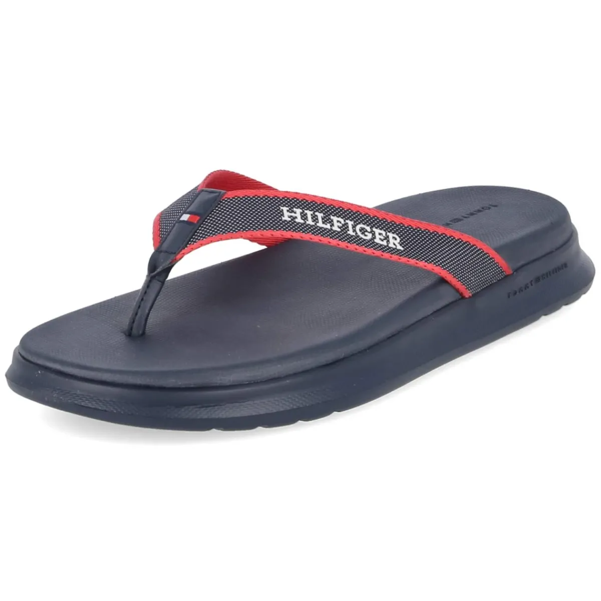 Der Zehentrenner DUAL DENSITY TOE von Tommy Hilfiger verbindet sommerliche Leichtigkeit mit markentypischer Aussage. Das robuste Textilobermaterial in Blau sorgt für Stabilität, während der Riemen mit rotem Rand und prägnantem Markenschriftzug den ikonischen Look unterstreicht. Ein weich gepolstertes, synthetisches Fußbett bietet angenehme Dämpfung beim Gehen, die flexible, griffige Laufsohle mit leichtem Profil gibt verlässlichen Halt auf warmen Stadtpflastern wie auf Strandpromenaden. Die offene Schuhspitze und das unkomplizierte Hineinschlüpfen machen den Herren-Zehentrenner zum unkomplizierten Begleiter. Passformhinweis: fällt normal aus. Modetipp: Für einen klaren Sommerlook mit navyfarbenen Badeshorts, weißem Jersey-Tank und einer leichten Overshirt-Jacke kombinieren; eine Cap in Rot greift den Riemenrand auf.