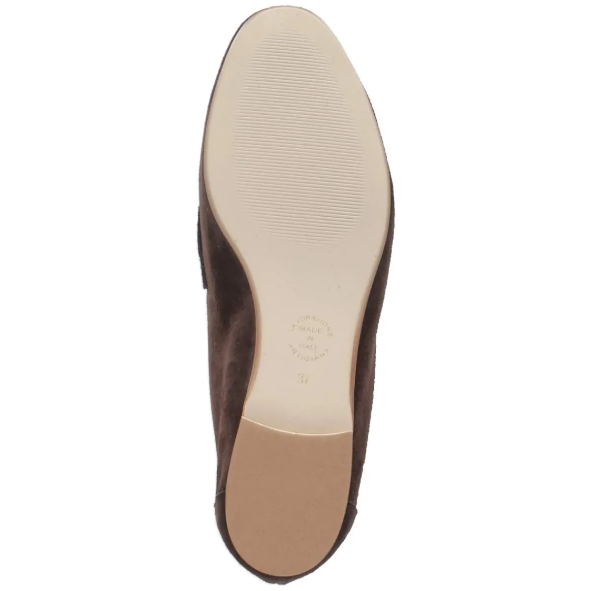 Der Damen-Loafer von Kaerlek präsentiert sich in edlem Braun mit dunkelbrauner Nuance und samtiger Rauleder-Oberfläche. Die runde Schuhspitze und der Verzicht auf einen Verschluss erzeugen eine klare, zeitlose Silhouette, während der über dem Spann verlaufende Riemen mit goldglänzenden Metallelementen einen dezenten Akzent setzt. Hautfreundliches Lederfutter und eine Lederdecksohle mit Fersenpolster sorgen für angenehmes Klima und spürbare Entlastung im Alltag. Die flexible Laufsohle unterstützt ein geschmeidiges Abrollen, das relaxt-leichte Tragegefühl und die verstärkte Ferse geben Halt ohne aufzutragen. Der Leisten fällt normal aus und ergänzt sowohl Office- als auch Freizeitlooks. Modetipp: Zu cropped Straight-Jeans, weißem Hemd und strukturierter Jacke wirkt der Loafer modern; ein feiner Goldgürtel greift die Metall-Details elegant auf.