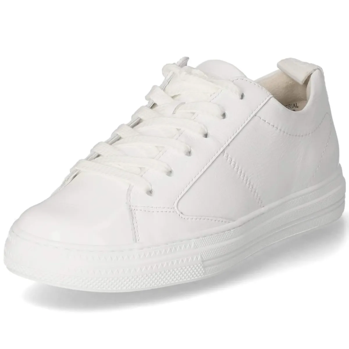 Der Low Sneaker von Paul Green setzt in strahlendem Weiß auf eine elegante Lackoptik, die jedem Look eine moderne Frische verleiht. Das rund zulaufende Design wirkt feminin, während Schnürung und zusätzlicher Reißverschluss das An- und Ausziehen angenehm erleichtern. Ein weich gepolsterter Einstieg, die verstärkte Ferse und die flexible Laufsohle sorgen den ganzen Tag für komfortablen Halt. Die lederne Decksohle sowie das gepolsterte, herausnehmbare Wechselfußbett bieten ein angenehmes Fußklima und ermöglichen bei Bedarf das Tragen eigener Einlagen. Ziernähte und feine Markendetails unterstreichen den hochwertigen Charakter. Der Schuh fällt normal aus und überzeugt damit als verlässlicher Begleiter im Alltag wie zu smarten Anlässen. Modetipp: Für einen cleanen City-Look mit Cropped-Jeans, weißem T‑Shirt und Oversize-Blazer kombinieren, dazu eine filigrane Crossbody-Bag.